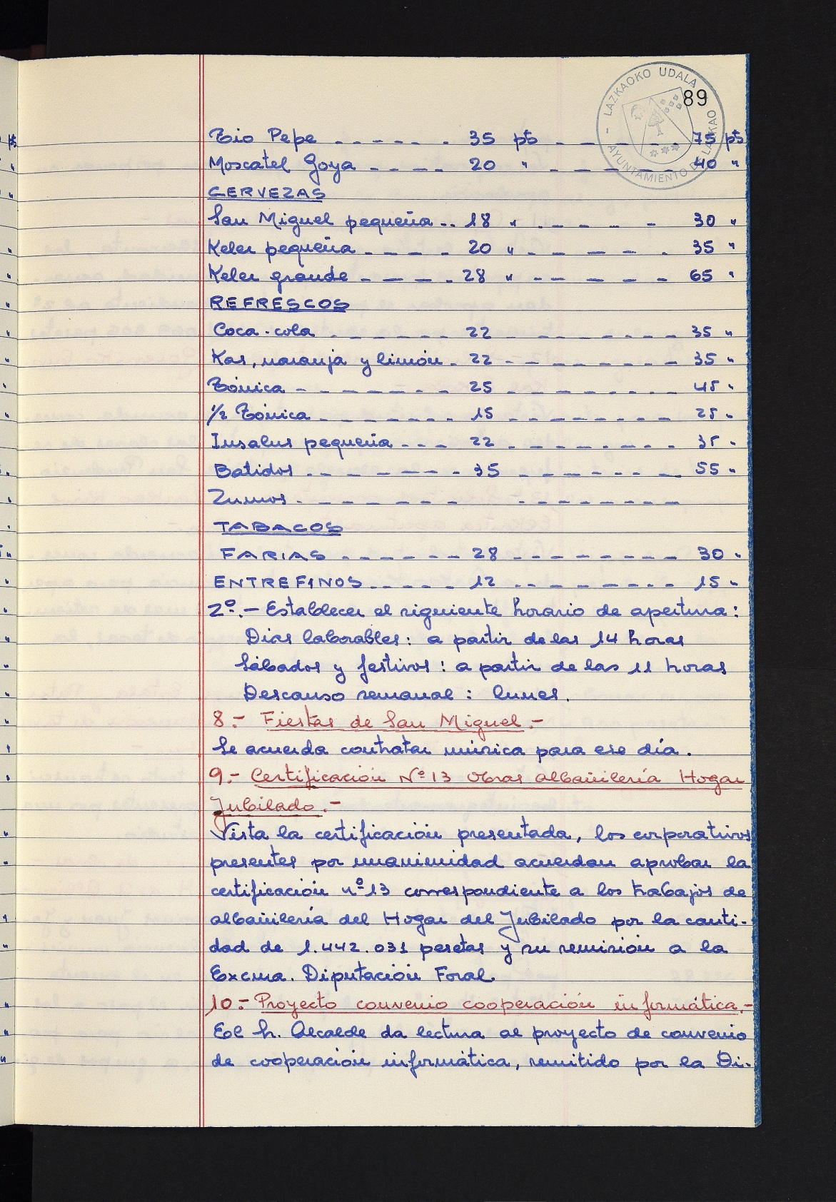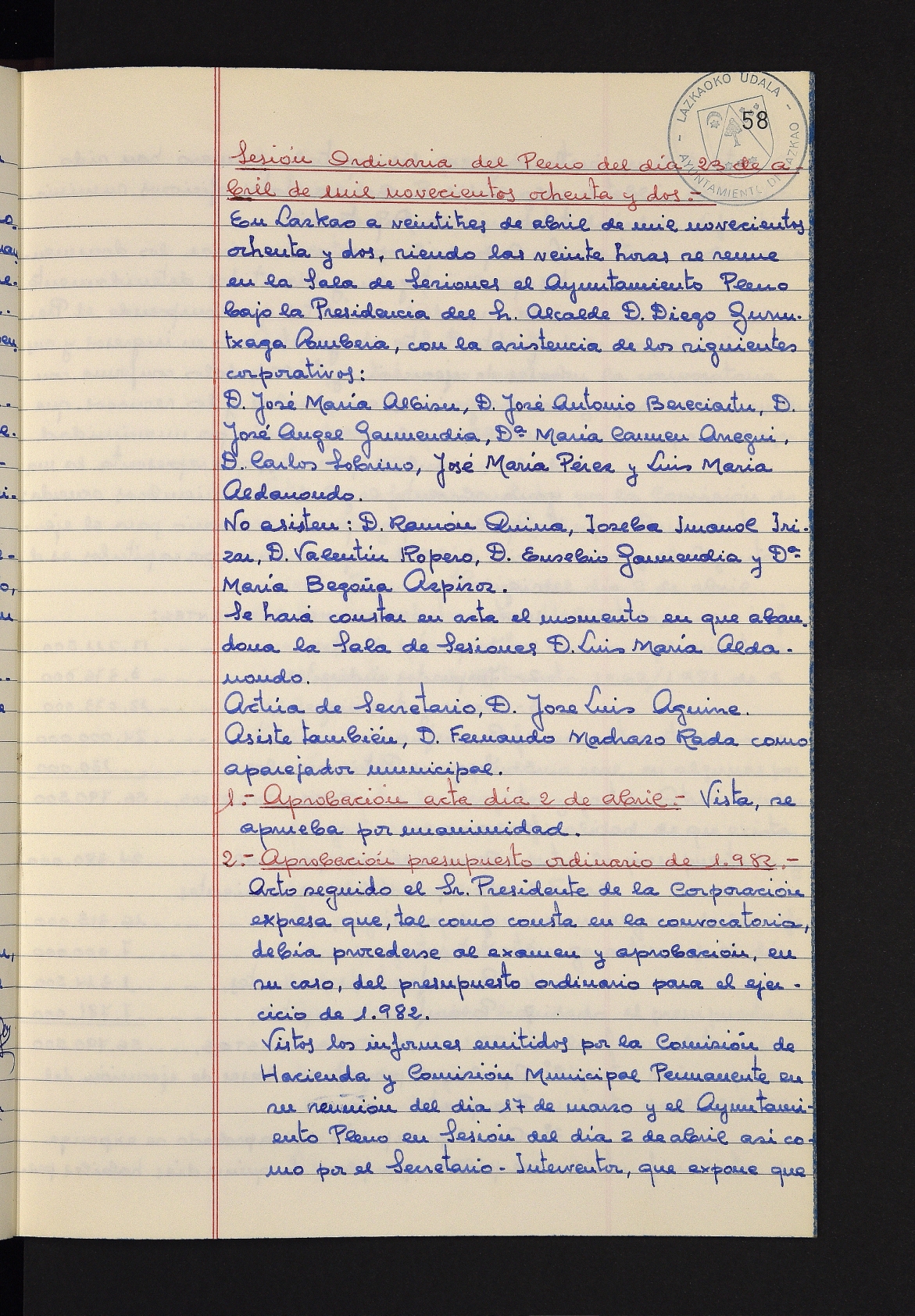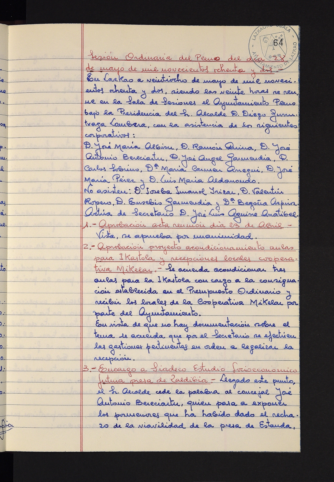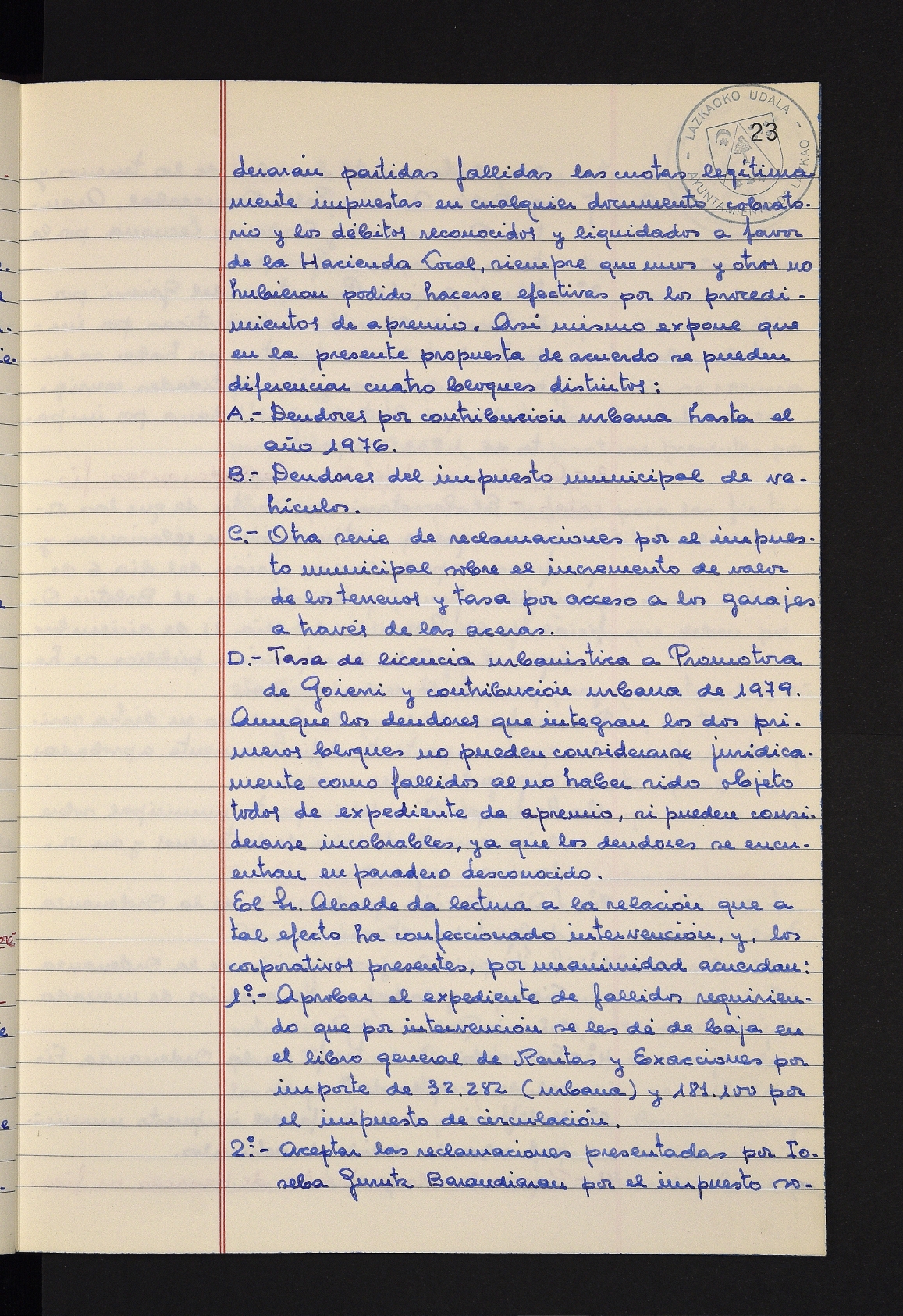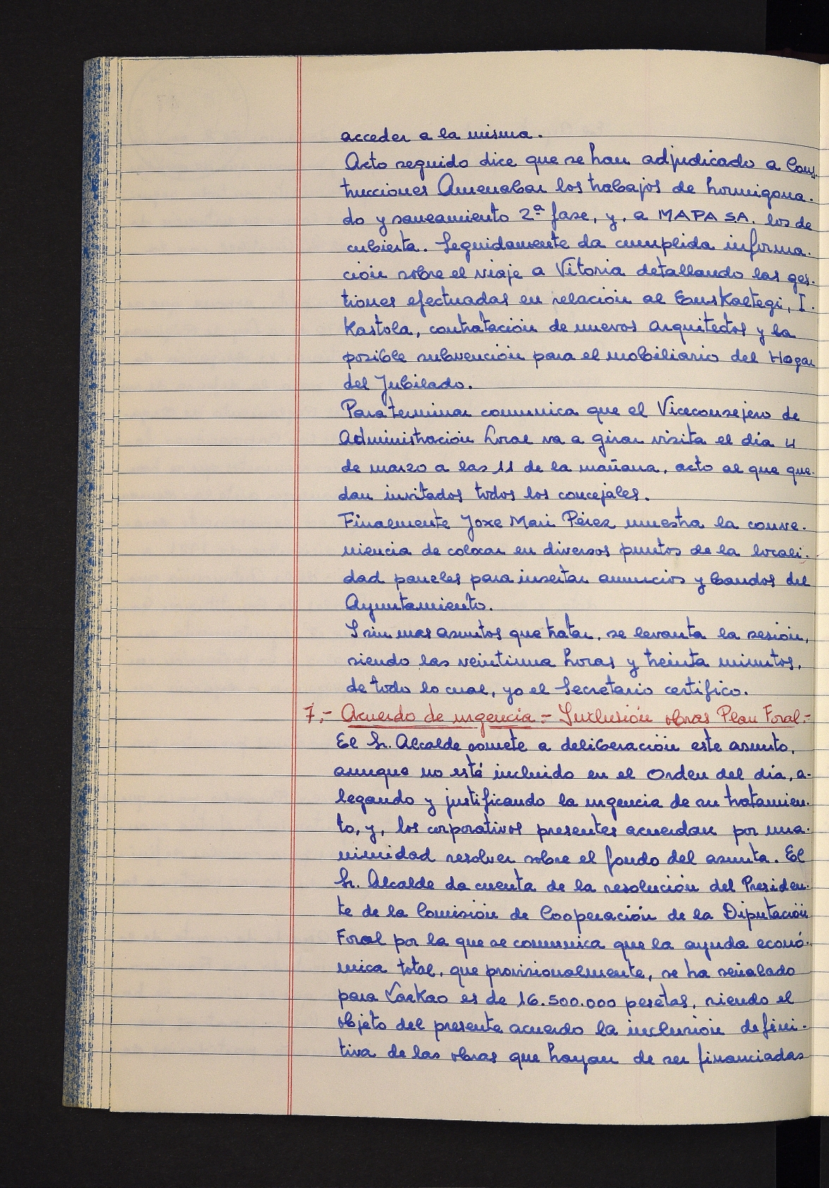 Log in to post commentsEdukiakSailkapenaFuntsaLazkaoko Udal ArtxiboaAtalakUdal AktakSailkapena1.1.4. Osoko Bilkuraren akta liburuakSailkapen berriaOsoko Bilkurako akta liburuakMultimediaIrudiakIdentifikazioaSignaturaakta liburua I-031Hasiera1981-11-27Amaiera1982-11-05AutoritateakTokiaLazkaoLog in to post commentsAkta eratu