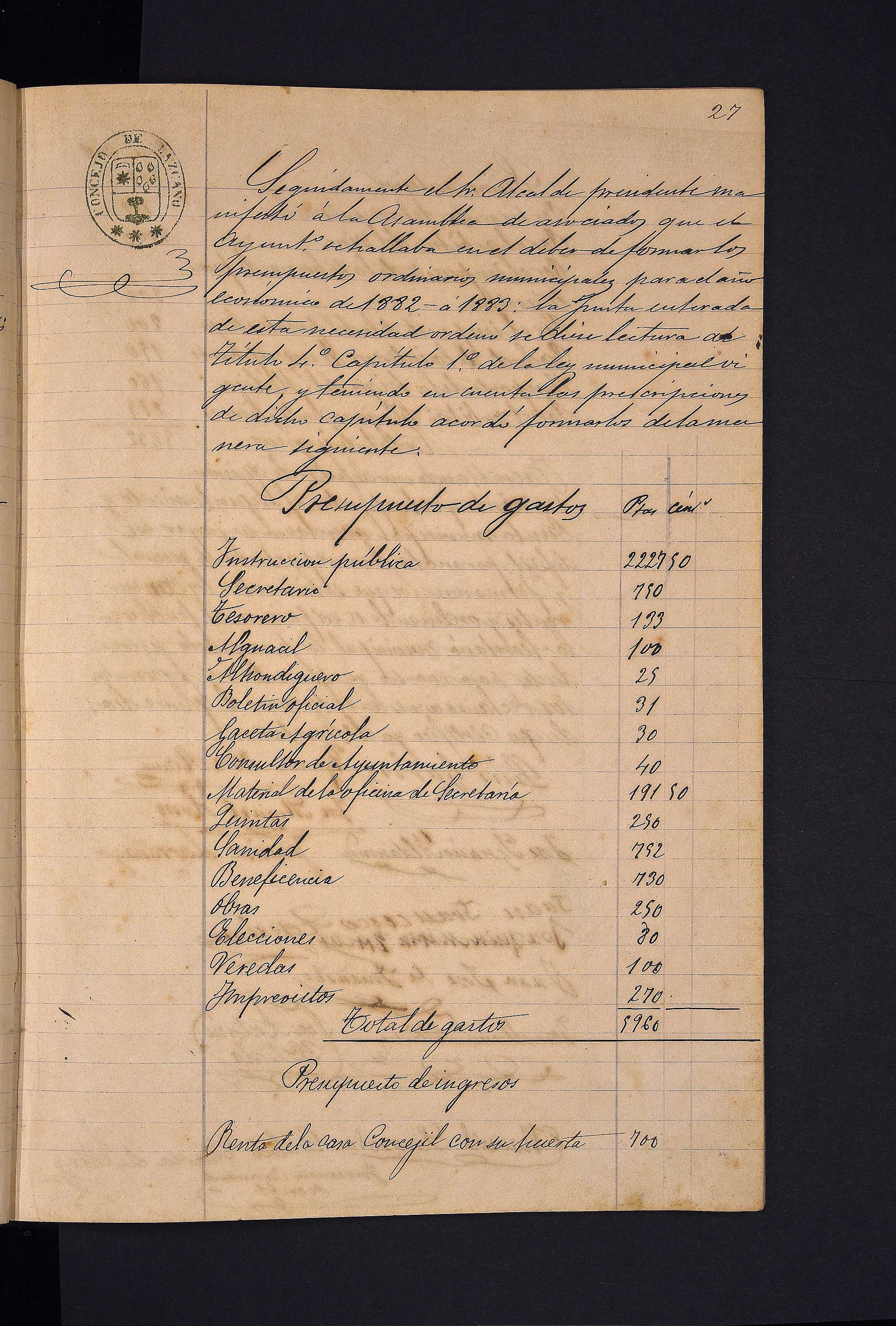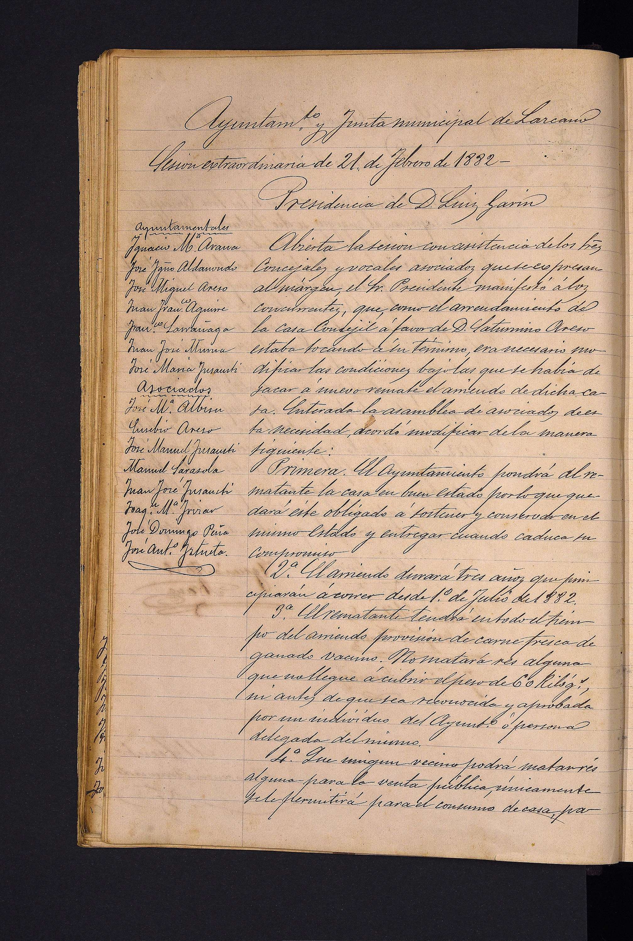 Ez Ohizko bilkura. Udaletxearen alokairuaren errematearen baldintzak datoz artikuluka .Udaletxea zehazki: ostatu, baratz zati eta haragitegia. Udal arielen alokairuaren errematera baldintzen aldaketak zehaztuta datoz artikuluka: ardoarenak, tabernenak, eta pattar eta likoreenak bereiztuz bakotza bere artikulu eta baldintza propioekin.Urte horretarako gastu eta diru sarrerak zehaztuta datoz.
