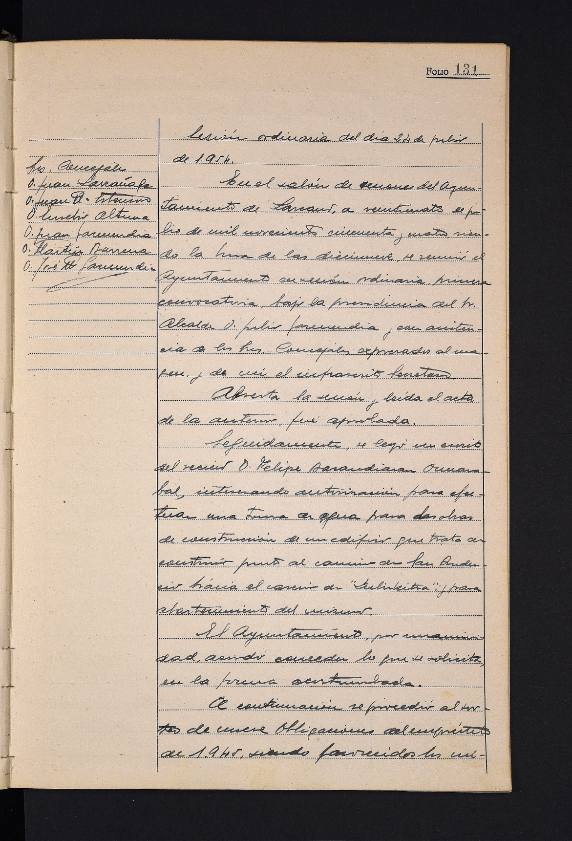 Felipe Barandiaran Ormazabalek San Prudentzio bidean eraikitzen ari den etxerako ur-hartunea egiteko aurkeztutako eskabidea onartzea. # Obligazioen zozketa. # Taberna bakoitzak ordaindu beharreko kuotak ezartzea. # Udal arielen diru-bilketaren kudeaketari buruzko bi zirkularren irakurketa.
