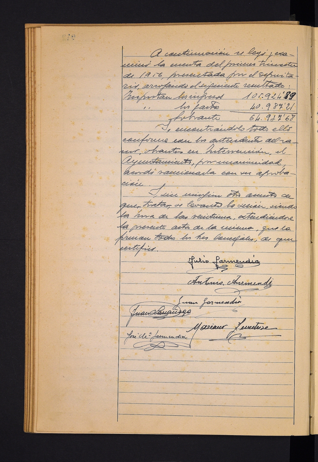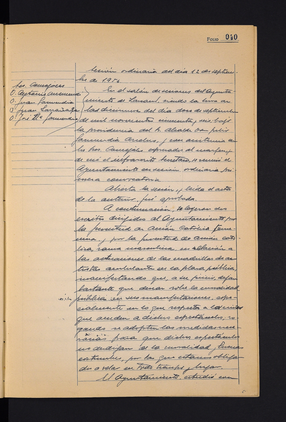 Juventud de Acción Católica Femenina eta Juventud de Acción Católica Masculinak bidalitako bi idazkiren irakurketa, artista ibiltarien emanaldietan moralitatea gordetzeko eskatuz. # Beasaingo Kirol Elkartearen komunikazioa, Teodoro Huertaren omenezko partidagatiko kobrantzaren inguruan. # Hainbat fakturaren onarpena. # Jose de Lasa medikuaren eskertza egindako omenaldiagatik. # Saturnino Eizaguirre eta Jose Antonio Insausti Tolosak aurkeztutako eskaerak onartzea, Lazkaomendiko errepidearen ezkerraldean errenta mugatuko etxebizitzak eraikitzeko. # Gordailuzainak aurkeztutako 1956ko lehen hiruhileko kontuak onartzea.