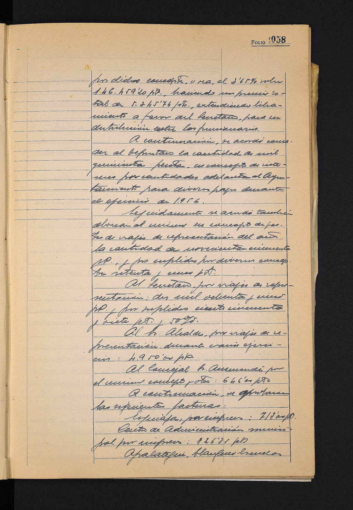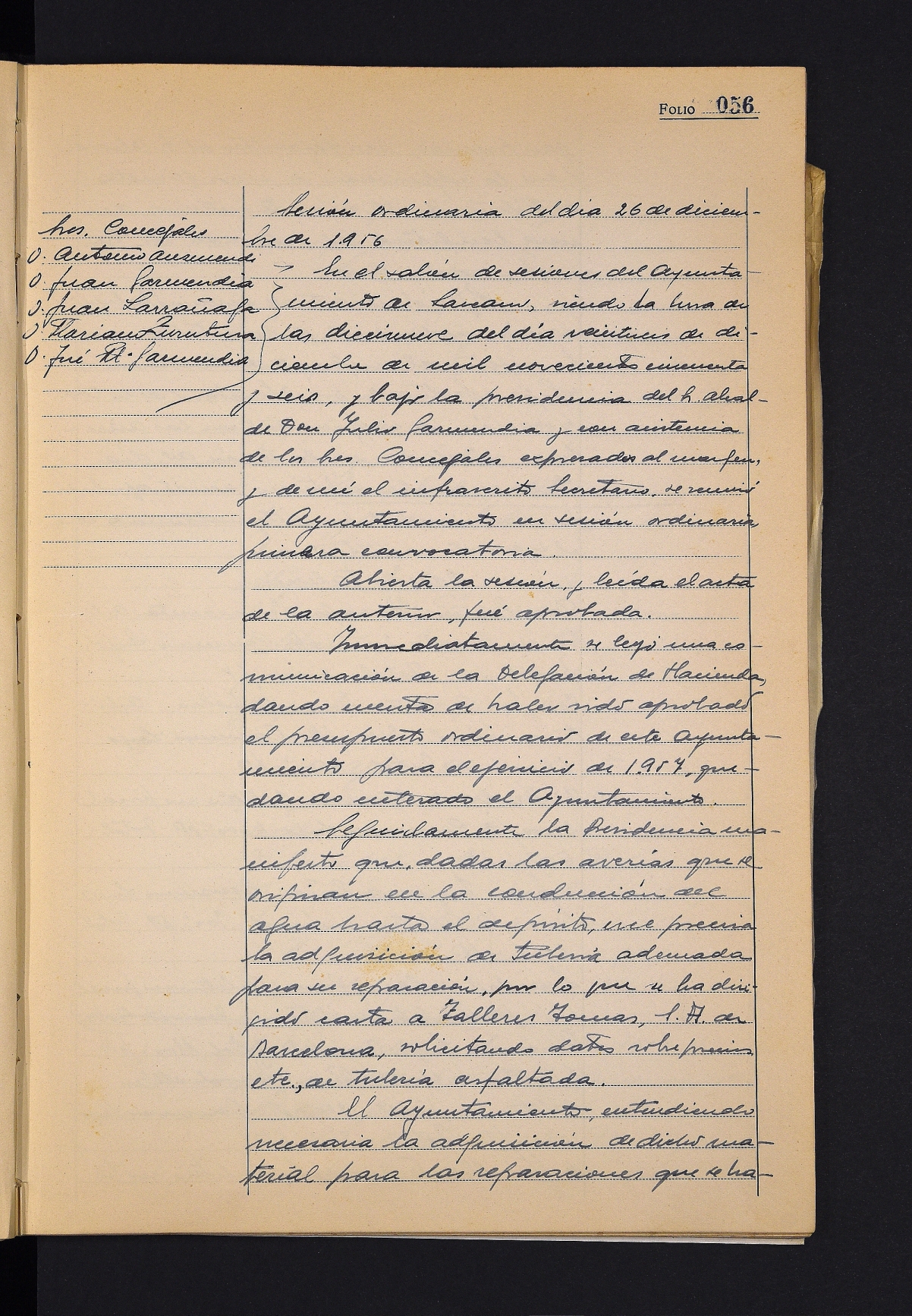 Ogasun Ordezkaritzaren komunikazioa, 1957ko ekitaldirako ohiko aurrekontua onartzen duena. # Hodiak erosteko aurrekontua eskatzea. # Luxuzko zerga ordaindu behar duten establezimenduen kitapena. # Hiri eta landa-aberastasunaren gaineko zergek bildutakoaren zati bat udaleko funtzionarioen artean banatzeko erabakia. # Zenbait ordainketa eta faktura onartzea. # Udalak egindako obren gastuen eta diru-sarreren kitapena. # 1956ko ohiko aurrekontuaren kitapena. # Hilerriko lurperatze-partzelen prezioak eta banaketa onartzea. # Iturrioz anaiek aurkeztutako proiektua onartzea, Lazkaotik Olaberrirako errepidean pabiloi industrial bat eraikitzeko.