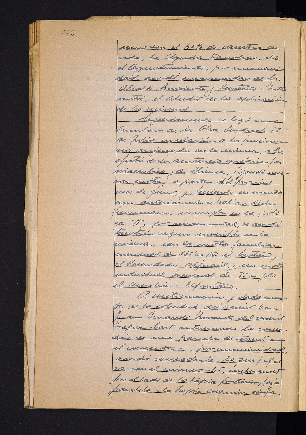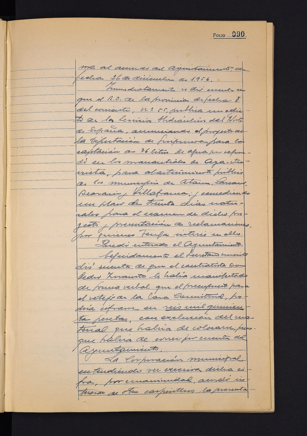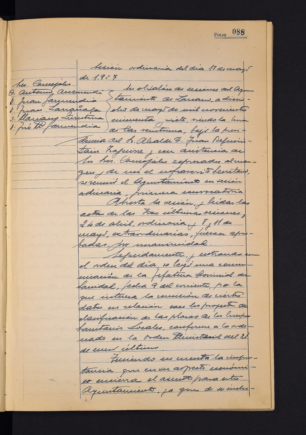 Probintziako Osasun Buruzagitzaren komunikazioa, plazak sailkatzeko proiektuari buruzko datuak eskatzen dituena. # Luxuzko kontsumoaren gaineko zergaren hainbat kuotaren ordainketaren atzerapenaren berrikuspena. # Babestutako etxebizitzen multzora hodia jartzeko aurrekontua aztertzea. # Funtzionarioen gutxieneko soldatei buruzko dekretuaren irakurketa. # Funtzionarioen aseguruari buruzko Obra Sindikalaren Zirkularra. # Juan Insausti Insaustik aurkeztutako eskabidea onartzea, hilerrian lurzati bat emateko. # Aldundiak egingo duen ura ekartzeko proiektua iragartzen duen jakinarazpena. # Udaletxeko teilatuko obretarako aurrekontu berriak eskatzea. # Hainbat fakturaren onarpena.