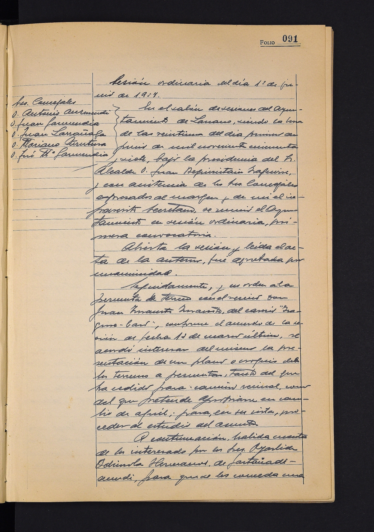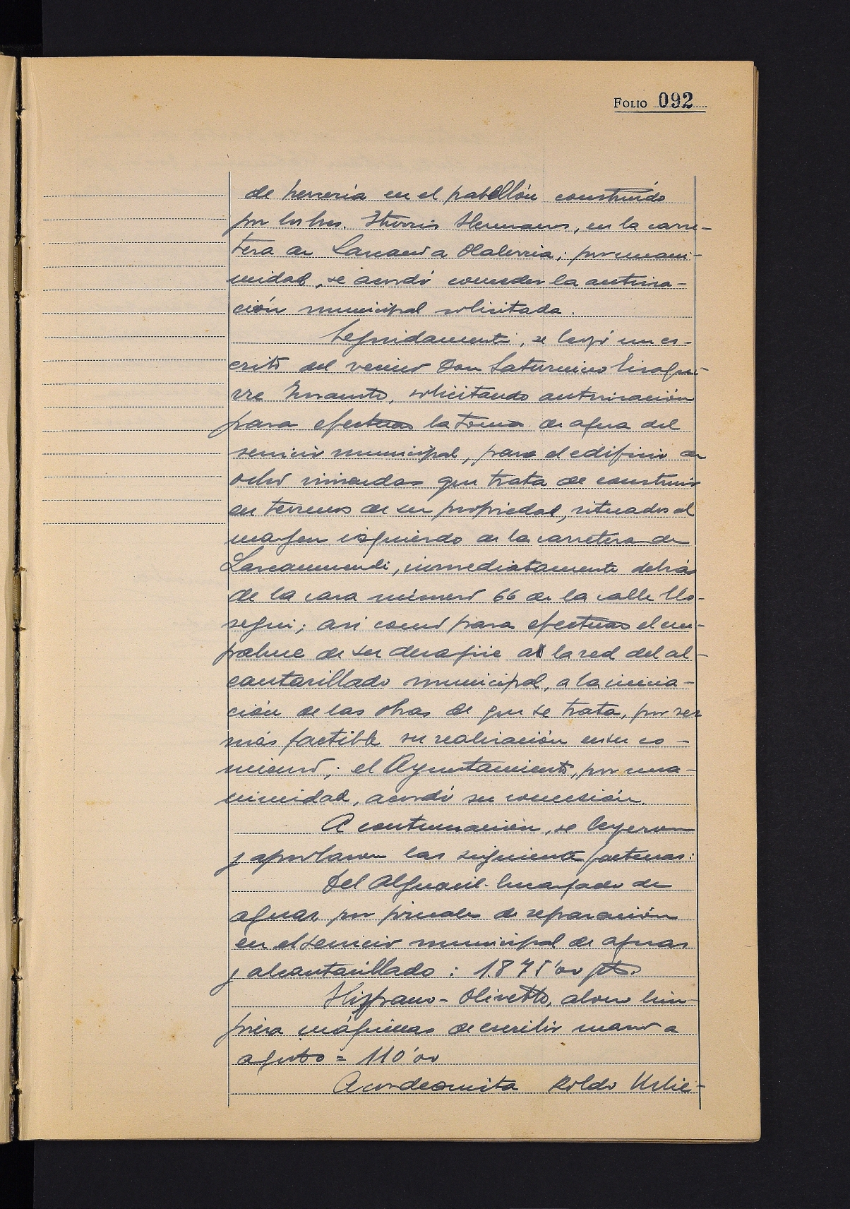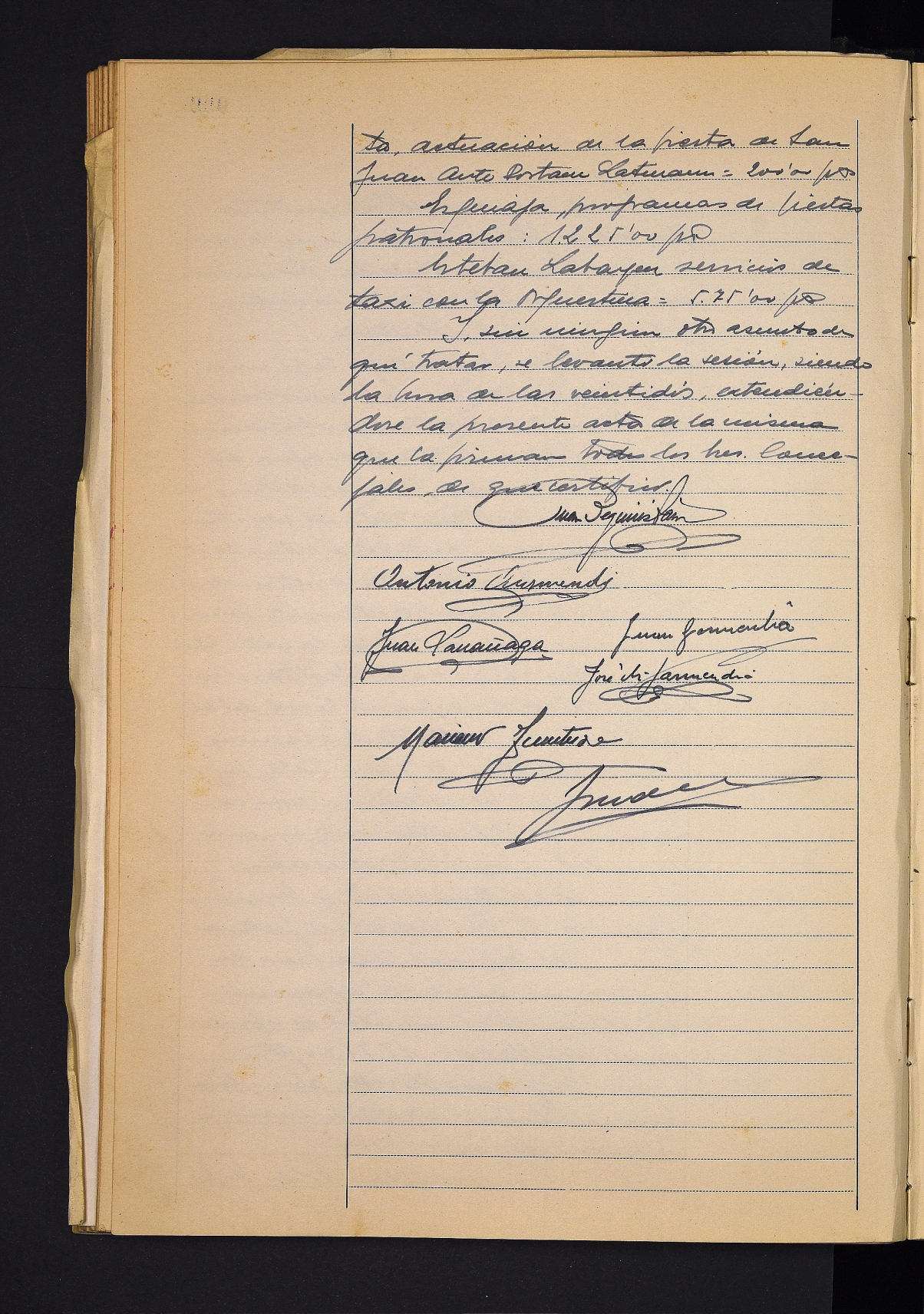 Juan Insausti Insaustiri lursaila erostea. # Oyarbide Odriozola anaiek aurkeztutako eskabidea onartzea, hilerrian lursail bat erosteko. # Ogasun Ikuskaritzaren jakinarazpena, Udalari kitapenetan egindako atxikipenei buruzkoa. # Pedro Jose Esnaolak txatar-biltegi bat jartzeko egindako eskaera onartzea. # Saturnino Izaguirreri baimena ematea Lazkaomendiko errepidearen ezkerreko ertzean eraikitzen ari den etxebizitzarako ur-hargunea egiteko. # Zenbait fakturaren onarpena.