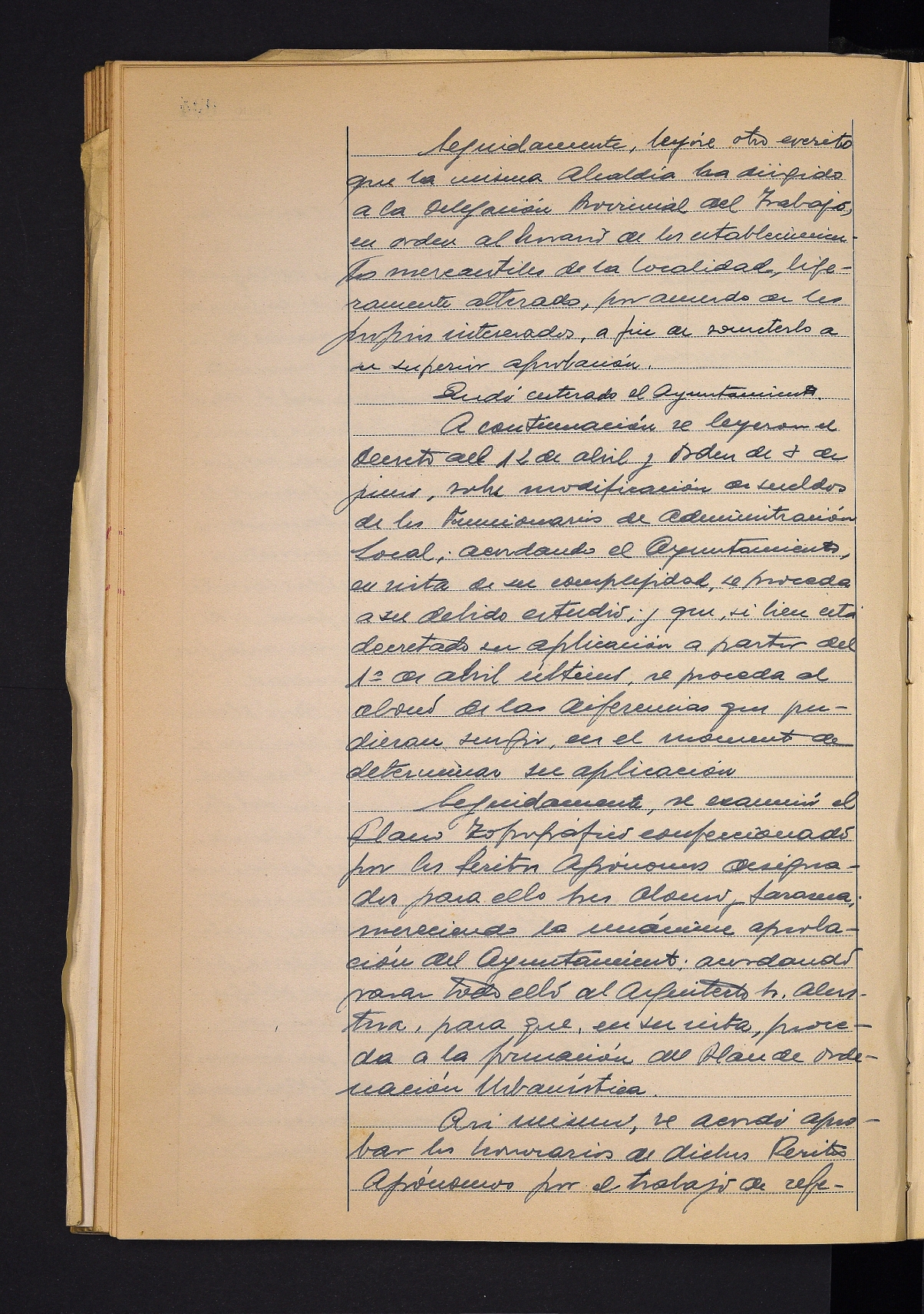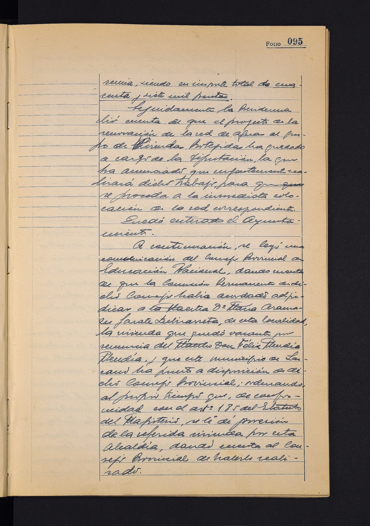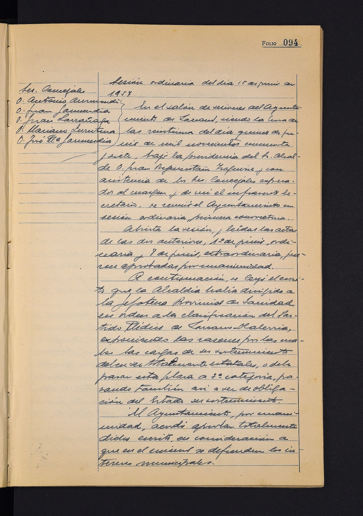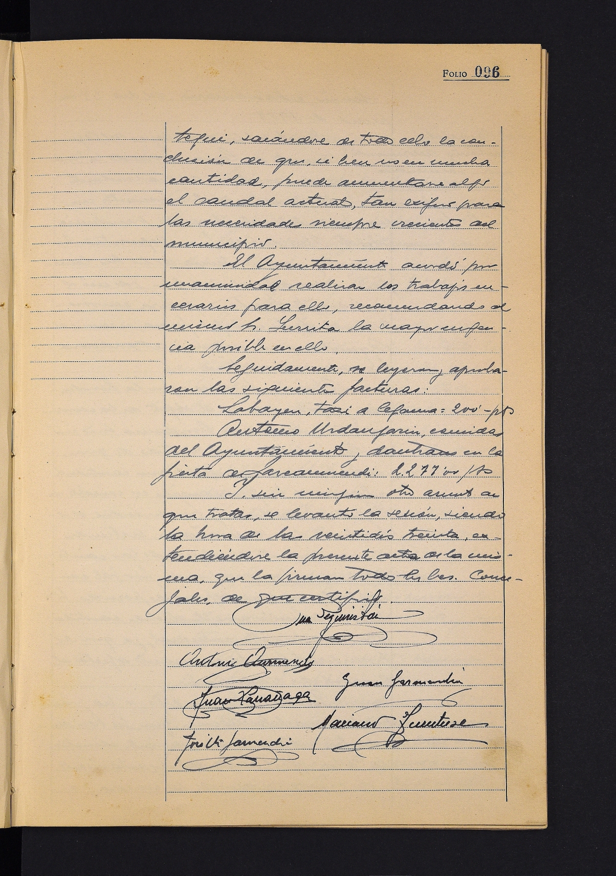 Probintziako Osasun Buruzagitzara idazki bat bidaltzea adostea medikuen alderdiaren sailkapenari buruz. # Laneko Probintzia Ordezkaritzara idazki bat bidaltzea adostea herriko merkataritza-establezimenduei buruz. # Funtzionarioen soldatak aldatzeari buruzko dekretuen irakurketa. # Egindako plano topografikoa aztertu eta onartzea. # Plano topografikoa egin duten peritu agronomoei ordainsariak ematea onartzea. # Ur sarea berritzeko proiektua aztertzea. # Hezkuntza Nazionaleko Probintzia Kontseiluaren komunikazioa, Maria Aranzazu Garate Zubizarreta irakasleari bizitzeko gela bat emateko. # Jose Antonio Insausti Tolosak egindako eskaera, Lazkaomendiko errepidearen ezkerreko aldean eraikitzen ari den etxebizitzan ur-hartzea egiteko. # Ur-hartze berrietarako egin beharreko lanen analisia. # Hainbat faktura onartzea.