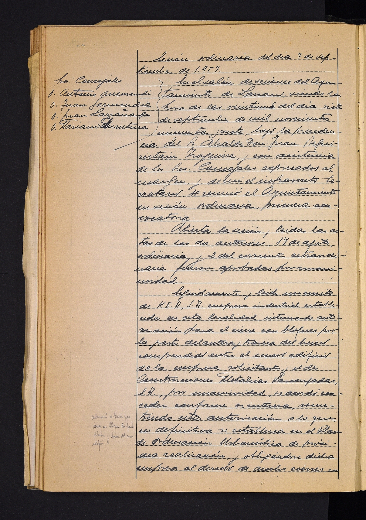 Kersa enpresak bere eraikinean itxiturak egiteko aurkeztutako eskabidea onartzea. # Felipe San Juani Elosegi kaleko 16 zenbakian taberna bat irekitzeko baimena ematea. # Luxuzko kontsumoen zerga aztertzea. # Enirio Aralar elkartearen bilerarako deialdia. # Udal korporazioetarako aurrekontuak eratzeari buruzko arauak jasotzen dituen zirkularraren irakurketa. # Jose Maria Dorronsoro Peñari eta Joaquin Irizar Larrañagari hilerrian lursailak ematea. # Udal ordainarazpenen ordenantzetan aldaketak sartzea.