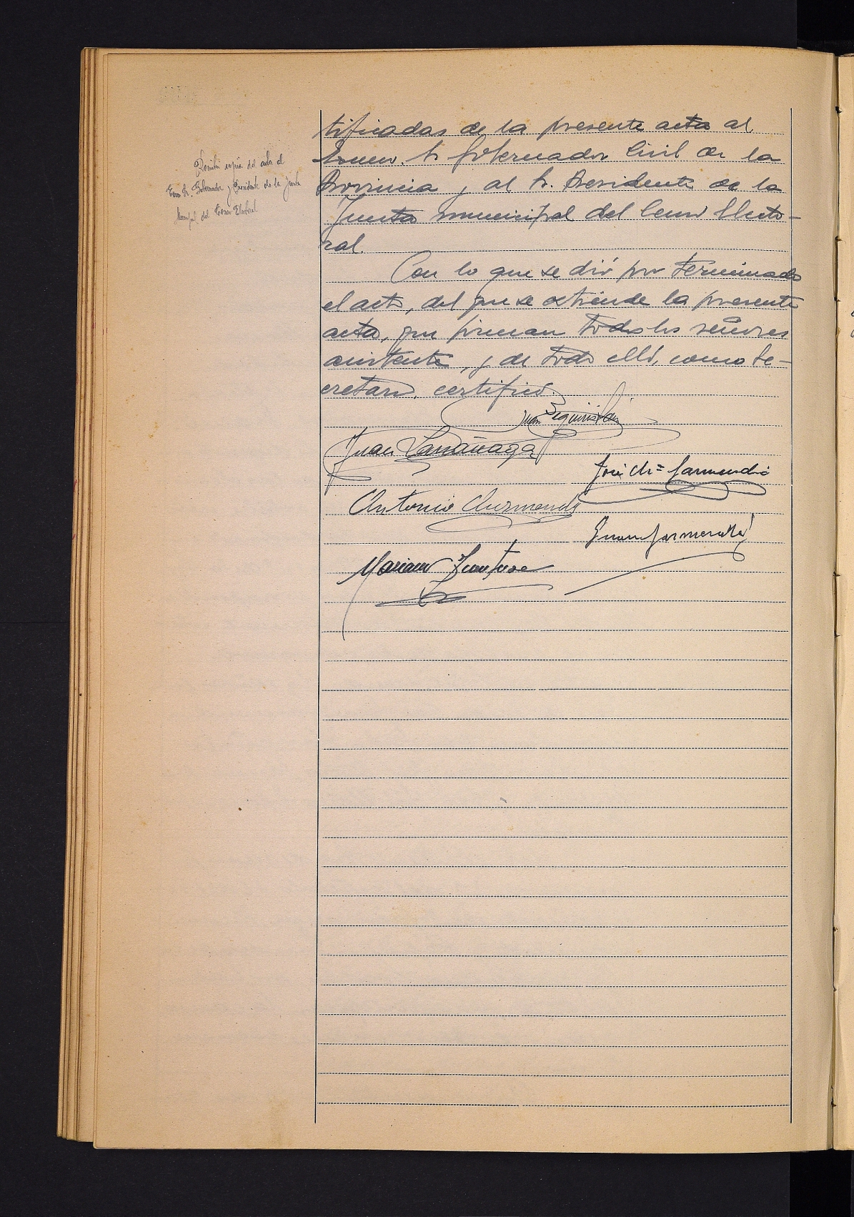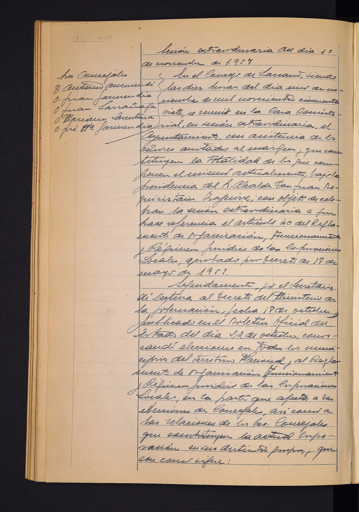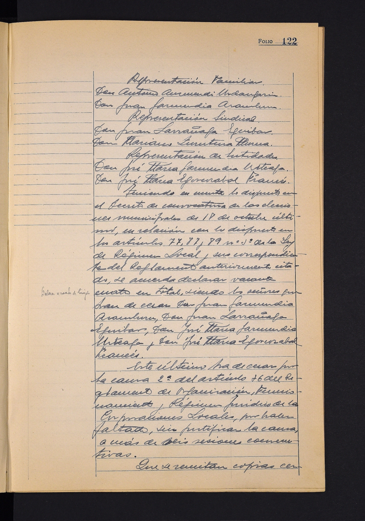 Gobernazio Ministerioaren dekretua hauteskundeetarako deia eginez. # Egungo udalbatzako zinegotzien zerrenda. # Lau zinegotzi-postu hutsik deklaratzea, Juan Garmendia Aramburu, Juan Larrañaga Eguibar, Jose Maria Garmendia Urteaga eta Jose Maria Igorazabal Francesek zinegotzi karguak uzten dituztelarik.