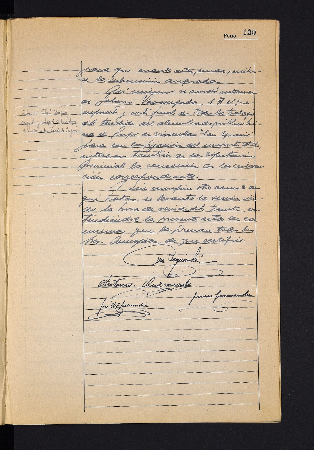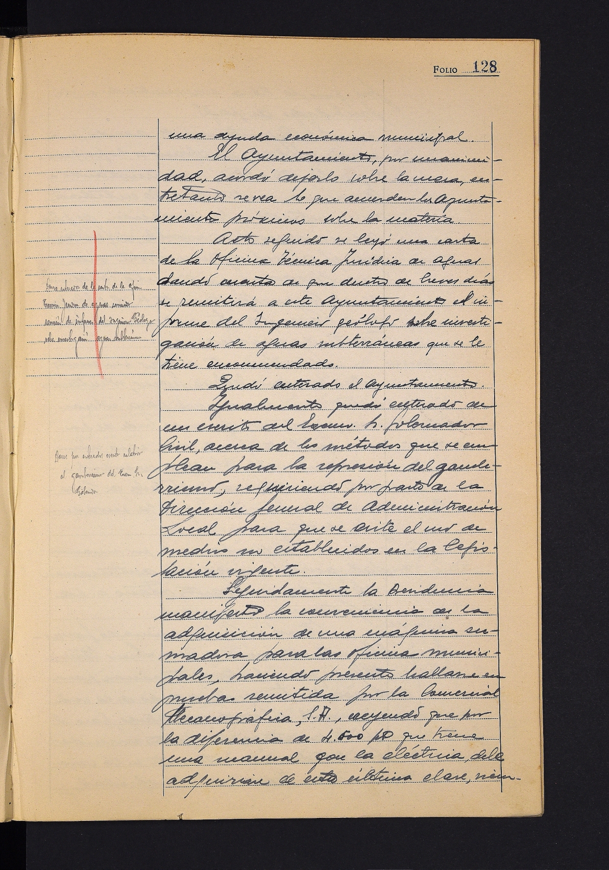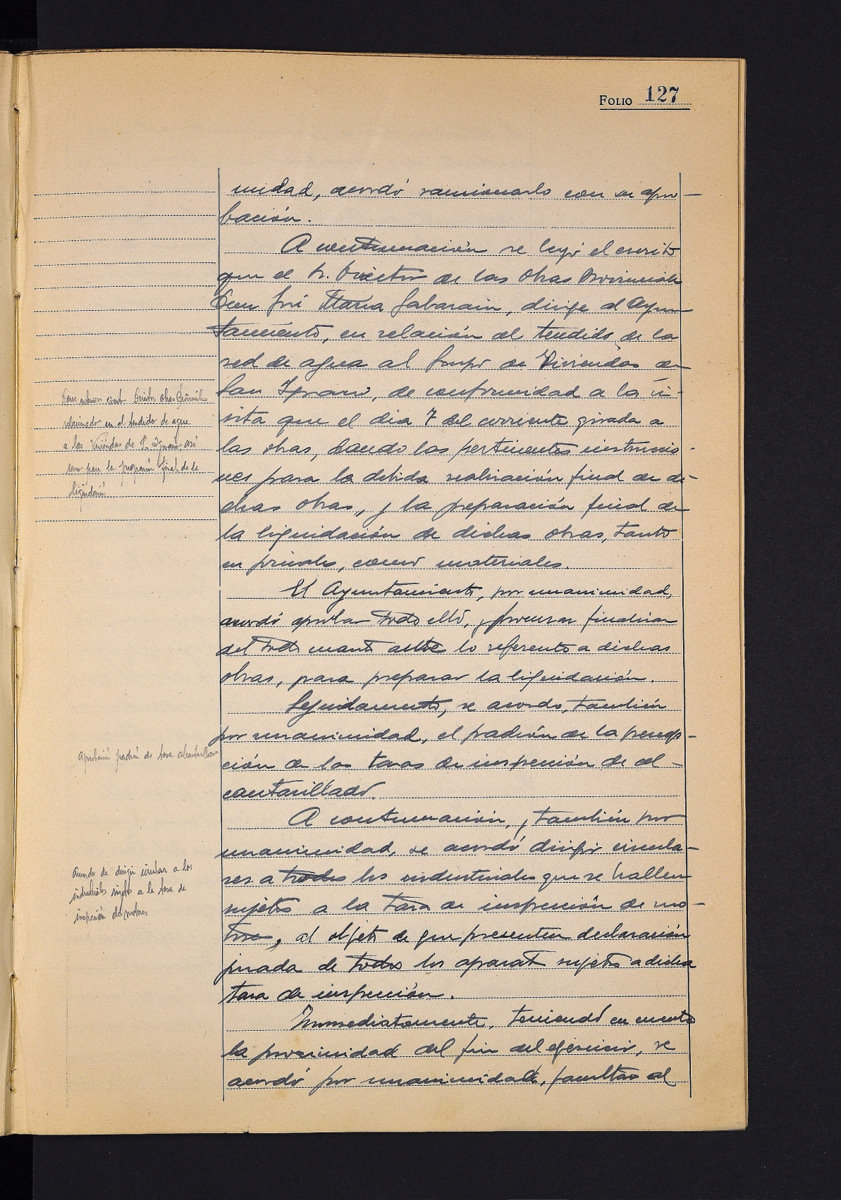 Urbaraundian ur-emari handiagoa lortzeko lanak legeztatzea. # San Inazioko etxeetako ur-sareko obrak amaitzea. # Estolderia ikuskatzeko tasak onartzea. # Industrialariei motorrak ikuskatzeko zirkularrak bidaltzea adostea. # Luxuzko kontsumoaren zerga kobratzea. # Landa-kontribuzioa kobratzeko erroldak prestatzea. # Euskal Herriko Txistularien Elkartearen zirkularra laguntza ekonomikoa eskatuz. # Uren Bulego Tekniko Juridikoaren jakinarazpena lurpeko uren txostenaren inguruan. # Gobernadore Zibilaren jakinarazpena, bandalismoa zapaltzeko erabiltzen diren moduei buruzkoa. # Bulegoetarako kalkulatzeko makina erostea. # Dionisio Telleriari Elosegi kaleko bere etxean mugarriak jartzeko baimena ematea. # Lucio Iturrioz Albisuri Tejeria etxerako ur-hartuneak egiteko baimena ematea. # Errepide Probintzialen Zuzendaritzarra idazkia bidaltzea errepidea eraikitzeko eskatuz. # Hainbat fakturaren onarpena. # Aldundiaren jakinarazpena, uren banaketa hobetzeko proiektuari buruz eta dirulaguntza ematea onartzen dela adieraziz.