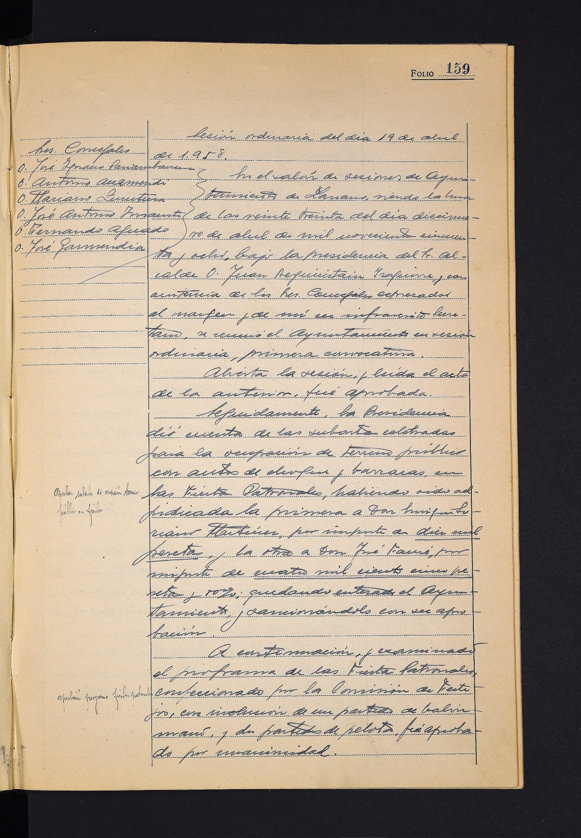 Herriko jaietan barrakak jartzeko enkantea egitea. # Herriko jaietako egitarauaren berrikuspena. # Manuel Higuera Morenori dirulaguntza ematea Tetuanera joan ahal izateko. # San Juan jaiak prestatzeko arduradun Zurutuza zinegotzia izendatzea. # Martxoko gastuak eta diru-sarrerak onartzea. # Hainbat faktura onartzea.