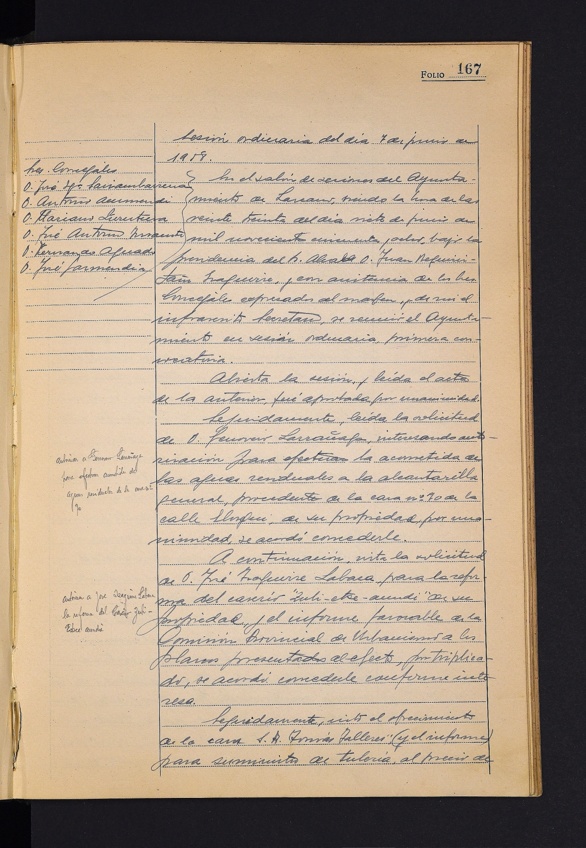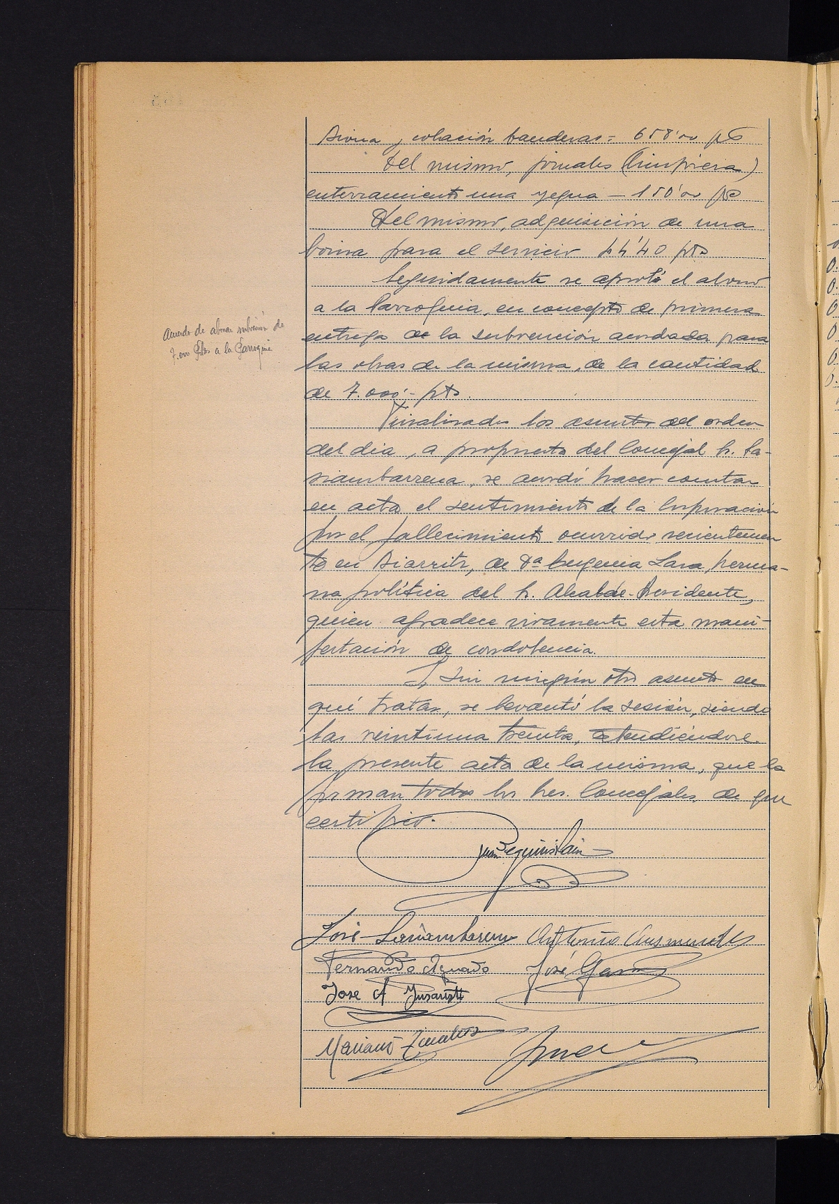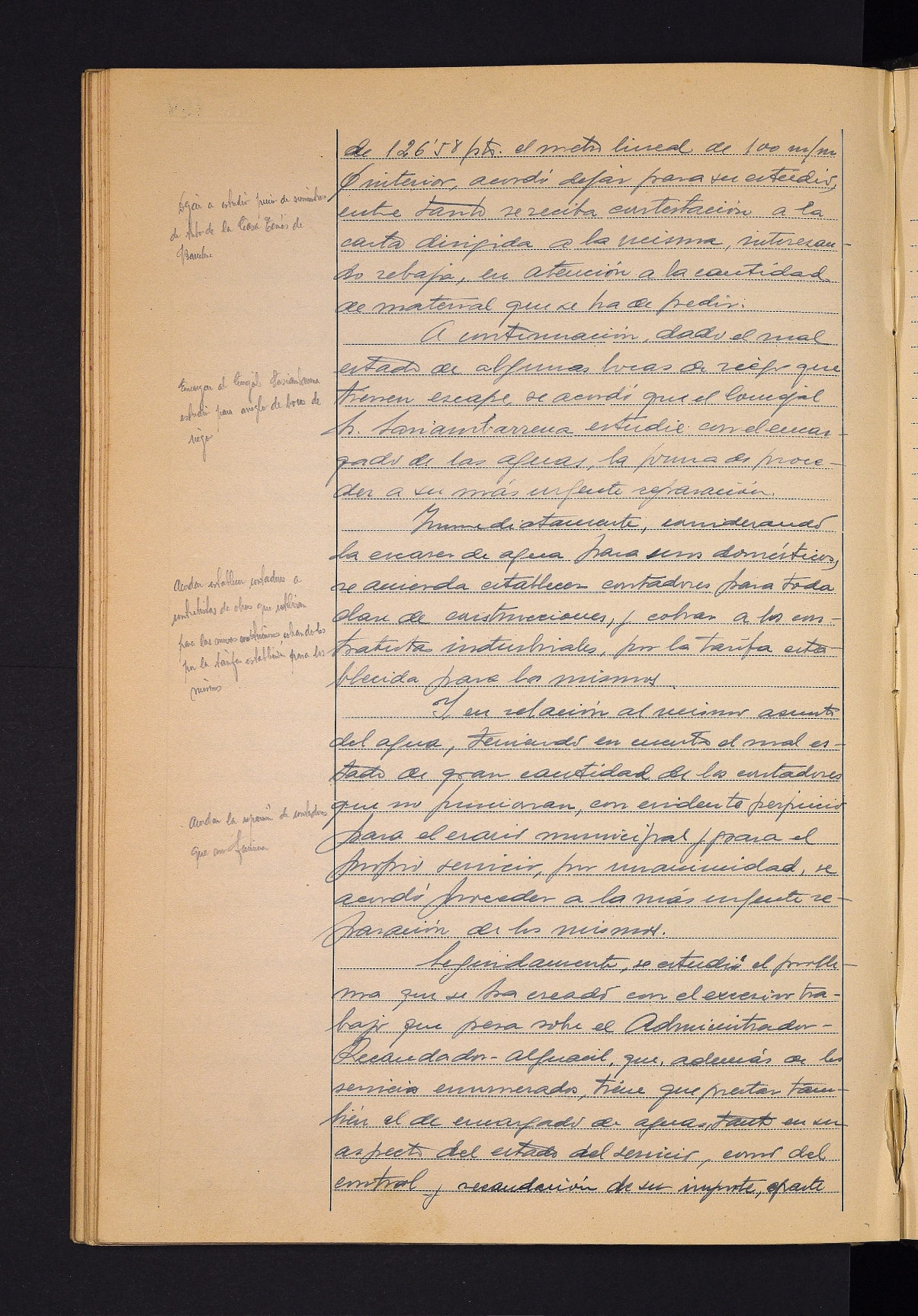 Larrañagak Elosegi kaleko 70 zenbakian duen etxean ur-hartunea egiteko egindako eskaera onartzea. # Jose Izaguirre Labacak Zubietxeaundi baserria eraberritzeko egindako eskaera onartzea. # Hodiak hornitzeko eskaintza aztertzea. # Ureztatzeko hainbat aho konpontzea. # Ur-kontagailu berriak ezartzea. # Administratzaile-biltzaileak ur zerbitzuaren kontrola ere bere gain hartzean duen gehiegizko lanari irtenbidea bilatzea. # Udal-funtsetatik Vicente Abad maisuari emandako domina ordaintzea. # Nesken eskolarako mahai berriak erosteko aurrekontuak eskatzea. # Hainbat faktura onartzea. # Parrokiako obretarako laguntza ekonomikoa onartzea. # Alkatearen familiako den Eugenia Lasaren heriotzagatik doluminak aurkeztea.