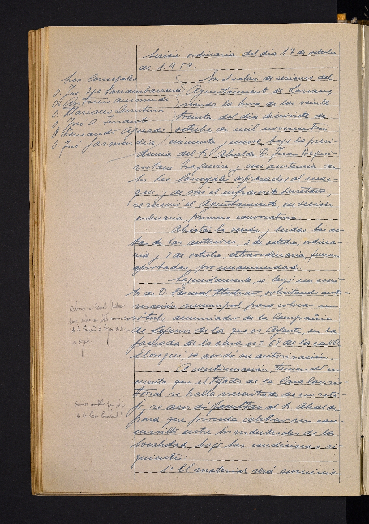 Pascual Madrazori baimena ematea Elosegi kaleko 68 zenbakiko etxearen fatxadan agente den aseguru-etxea iragartzeko errotulu bat jartzeko. # Udaletxeko teilatuan obrak egiteko lehiaketa onartzea. # Udaleko kideek zaborra biltzeko araudiari proposamenak egitea erabakitzea. # Hilerria garbitzea. # Iraileko gastuak eta diru-sarrerak onartzea. # Hirugarren hiruhileko kontuak onartzea. # Hainbat fakturaren onarpena.