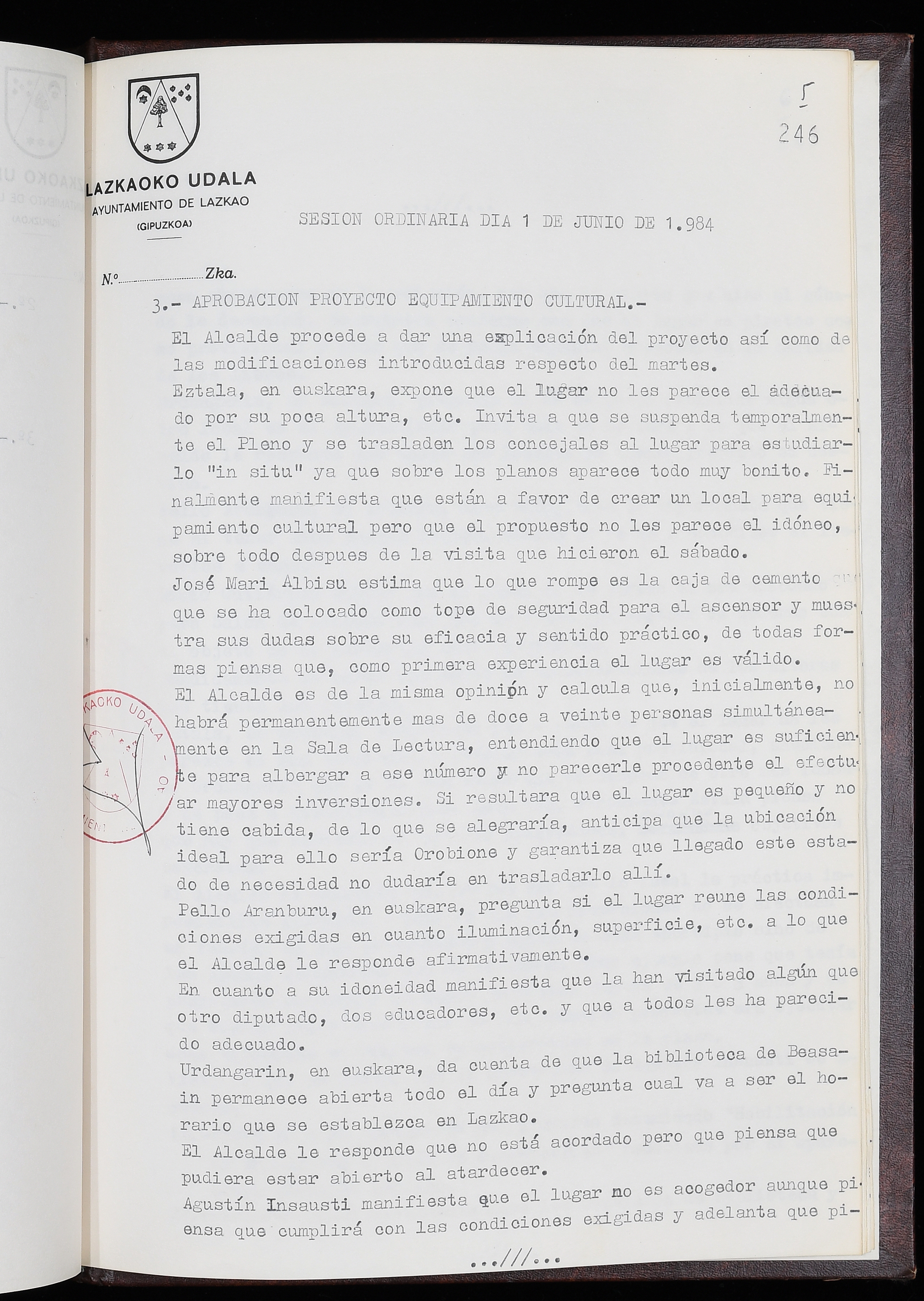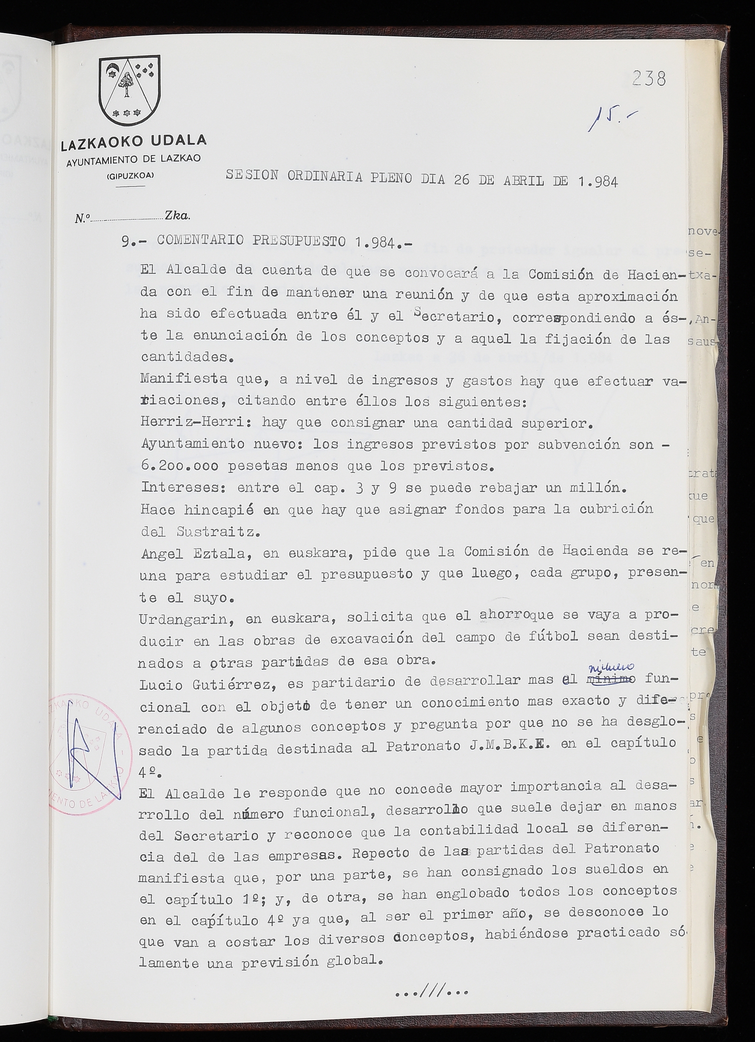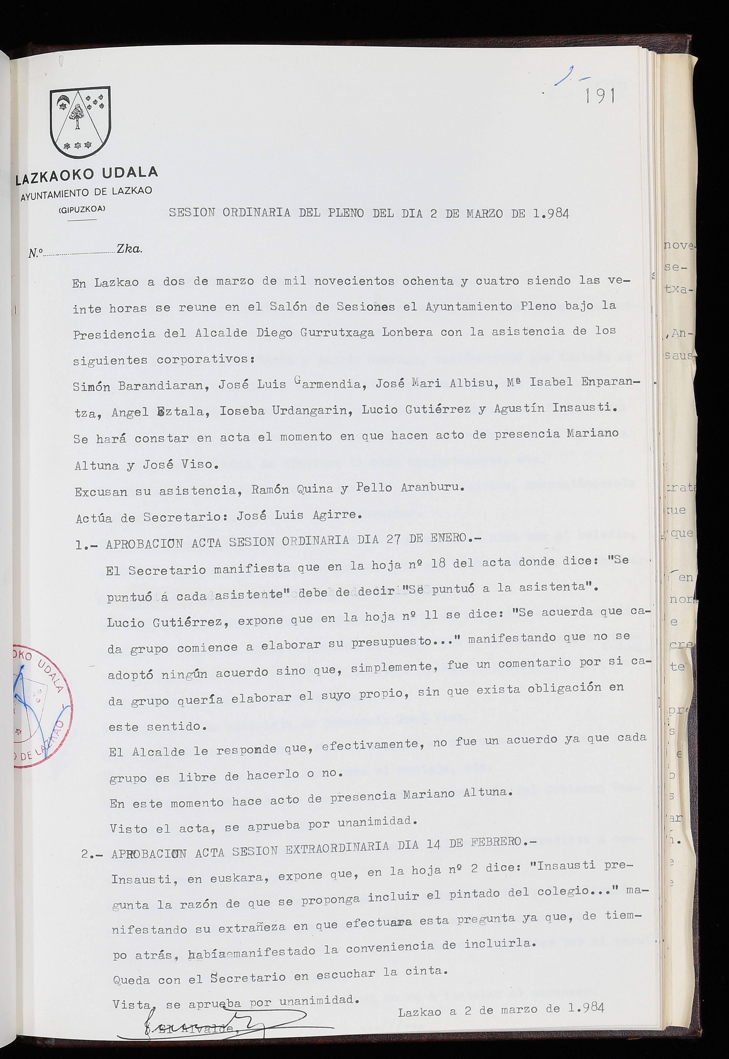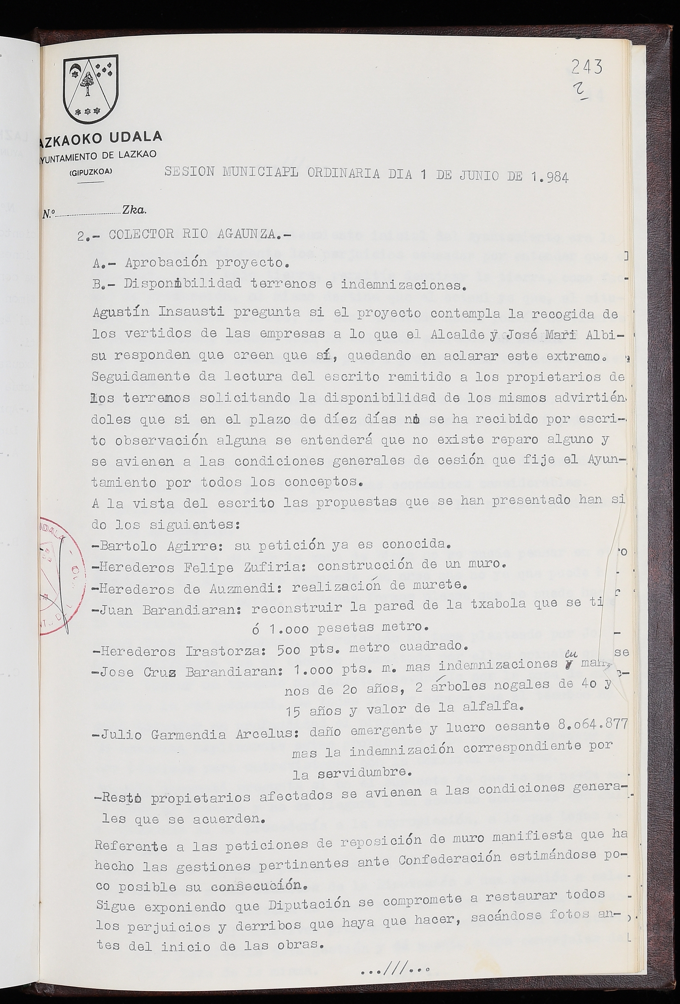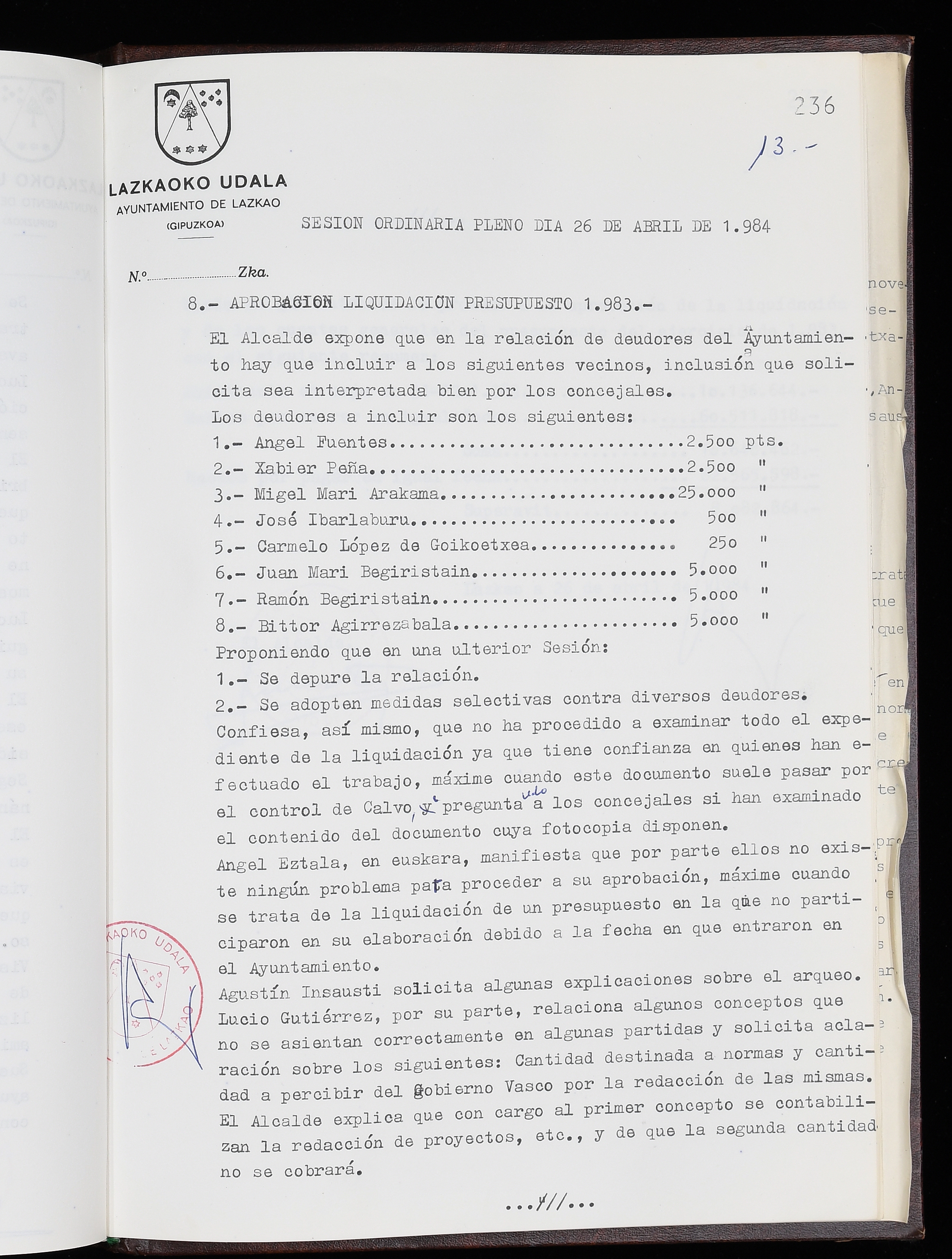 Log in to post commentsEdukiakSailkapenaFuntsaLazkaoko Udal ArtxiboaAtalakUdal AktakSailkapena1.1.4. Osoko Bilkuraren akta liburuakSailkapen berriaOsoko Bilkurako akta liburuakMultimediaIrudiakIdentifikazioaSignaturaakta liburua I-035Hasiera1983-05-23Amaiera1984-05-30AutoritateakTokiaLazkaoLog in to post commentsAkta eratu