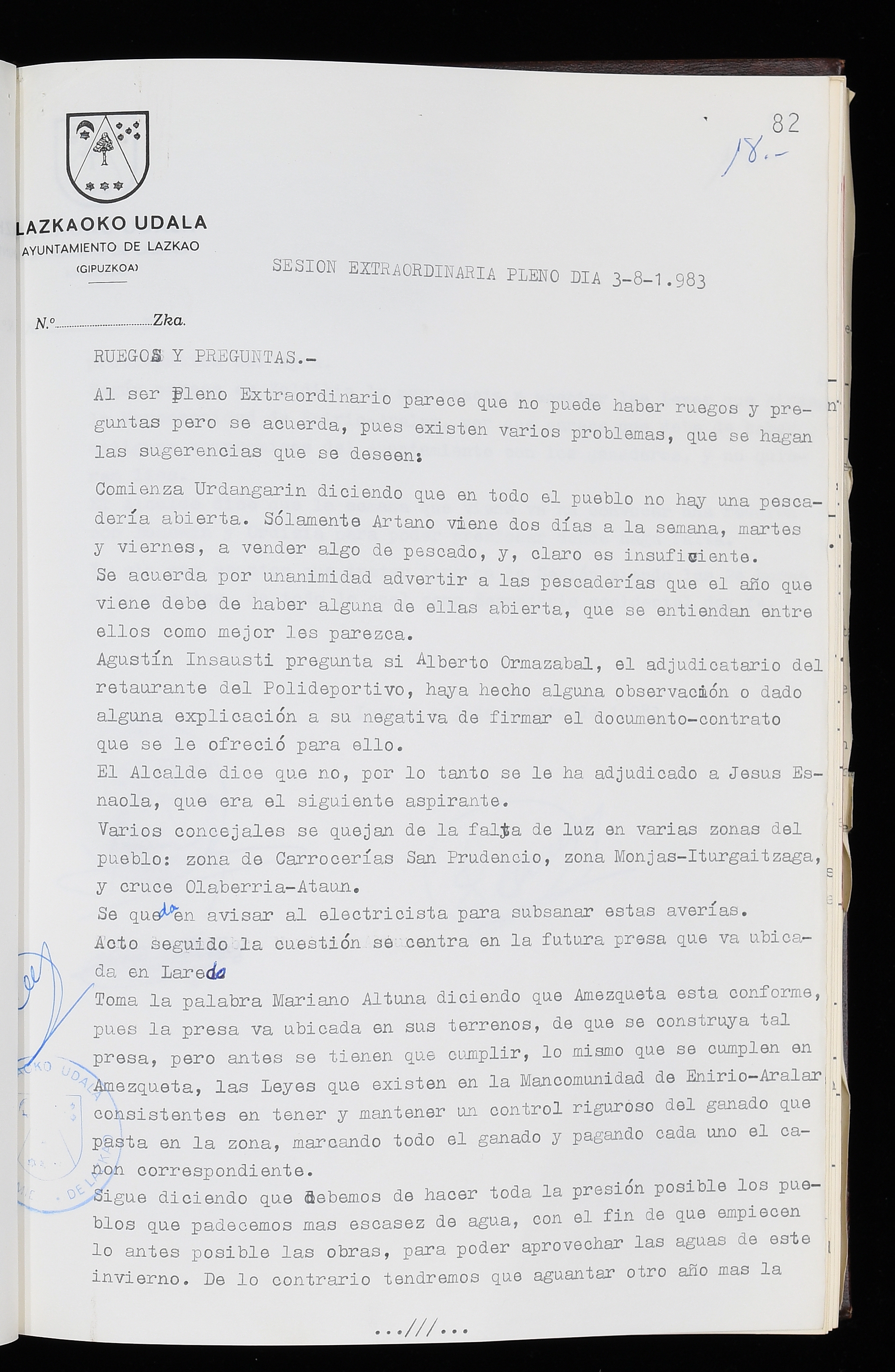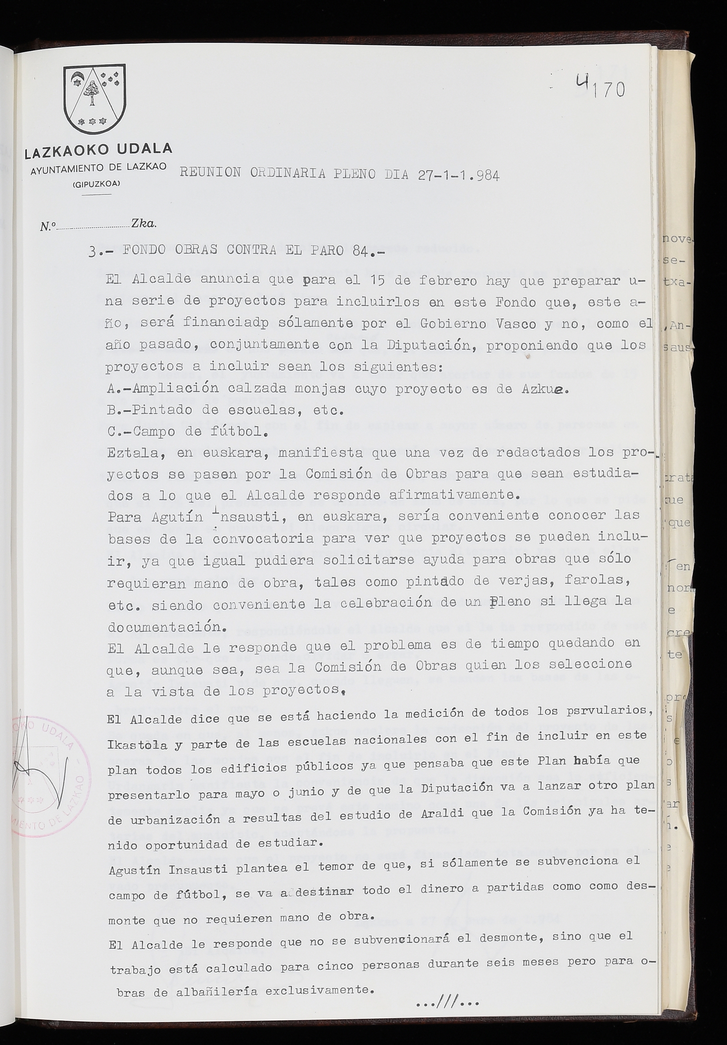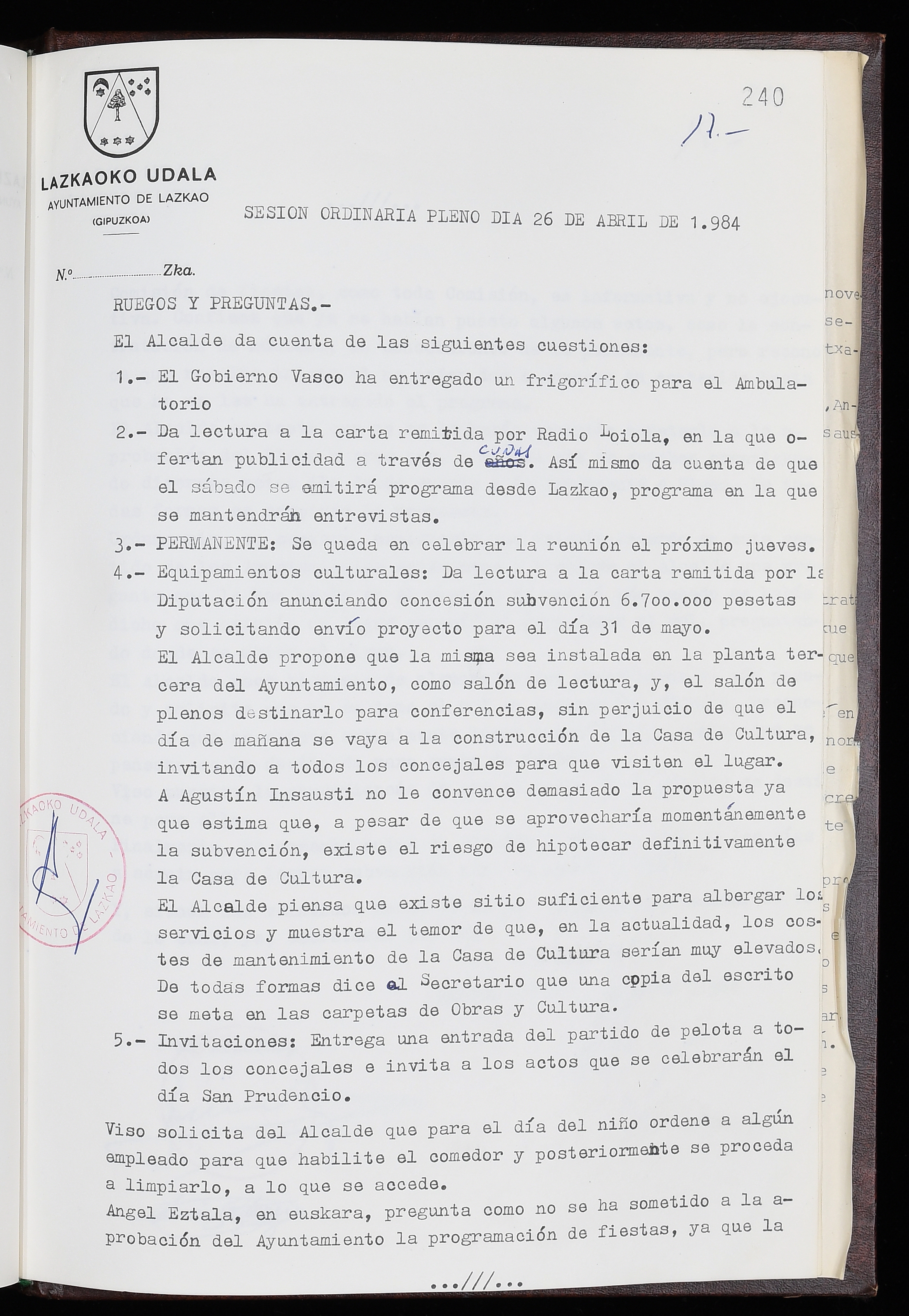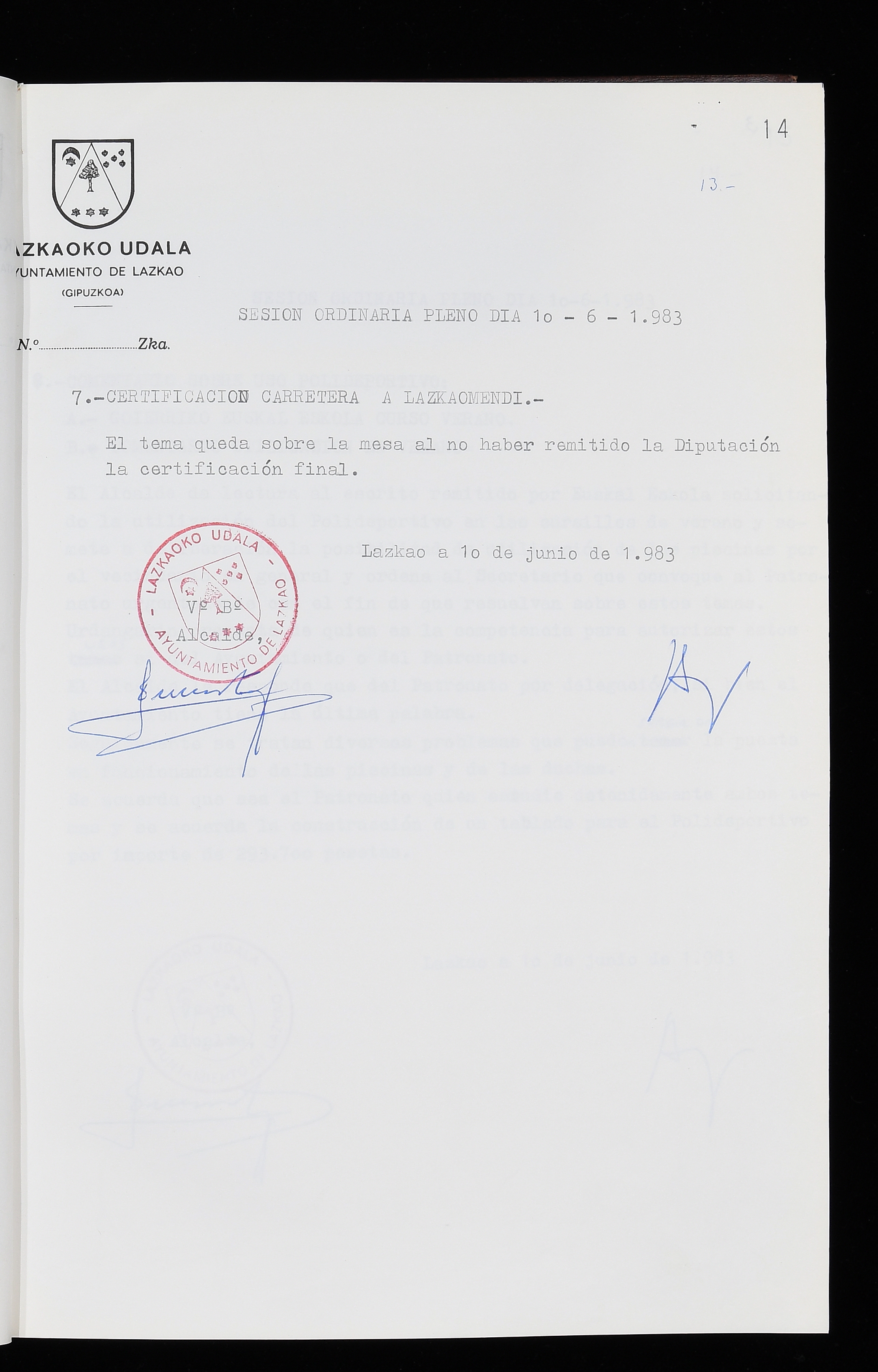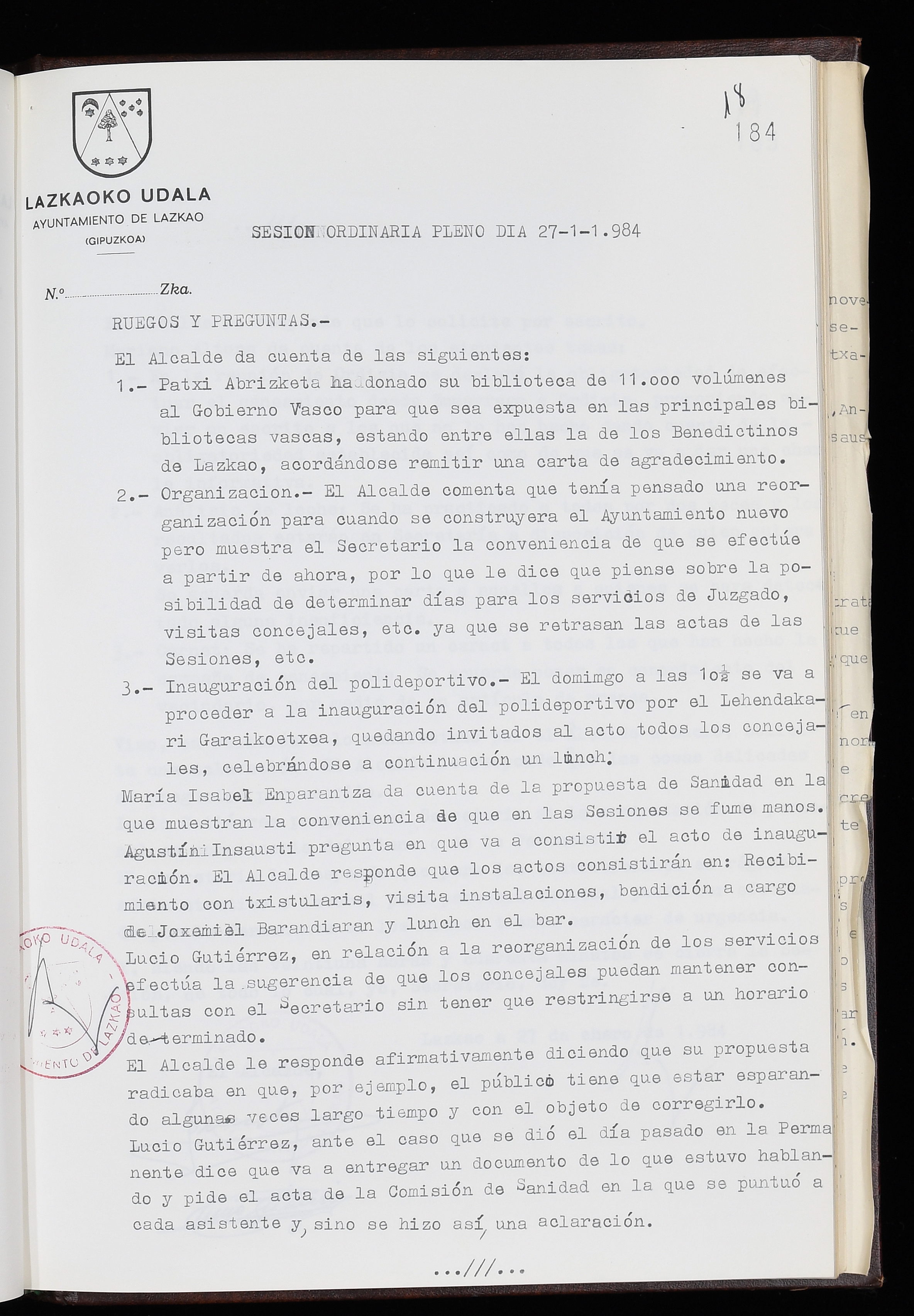 Log in to post commentsEdukiakSailkapenaFuntsaLazkaoko Udal ArtxiboaAtalakUdal AktakSailkapena1.1.4. Osoko Bilkuraren akta liburuakSailkapen berriaOsoko Bilkurako akta liburuakMultimediaIrudiakIdentifikazioaSignaturaakta liburua I-035Hasiera1983-05-23Amaiera1984-05-30AutoritateakTokiaLazkaoLog in to post commentsAkta eratu