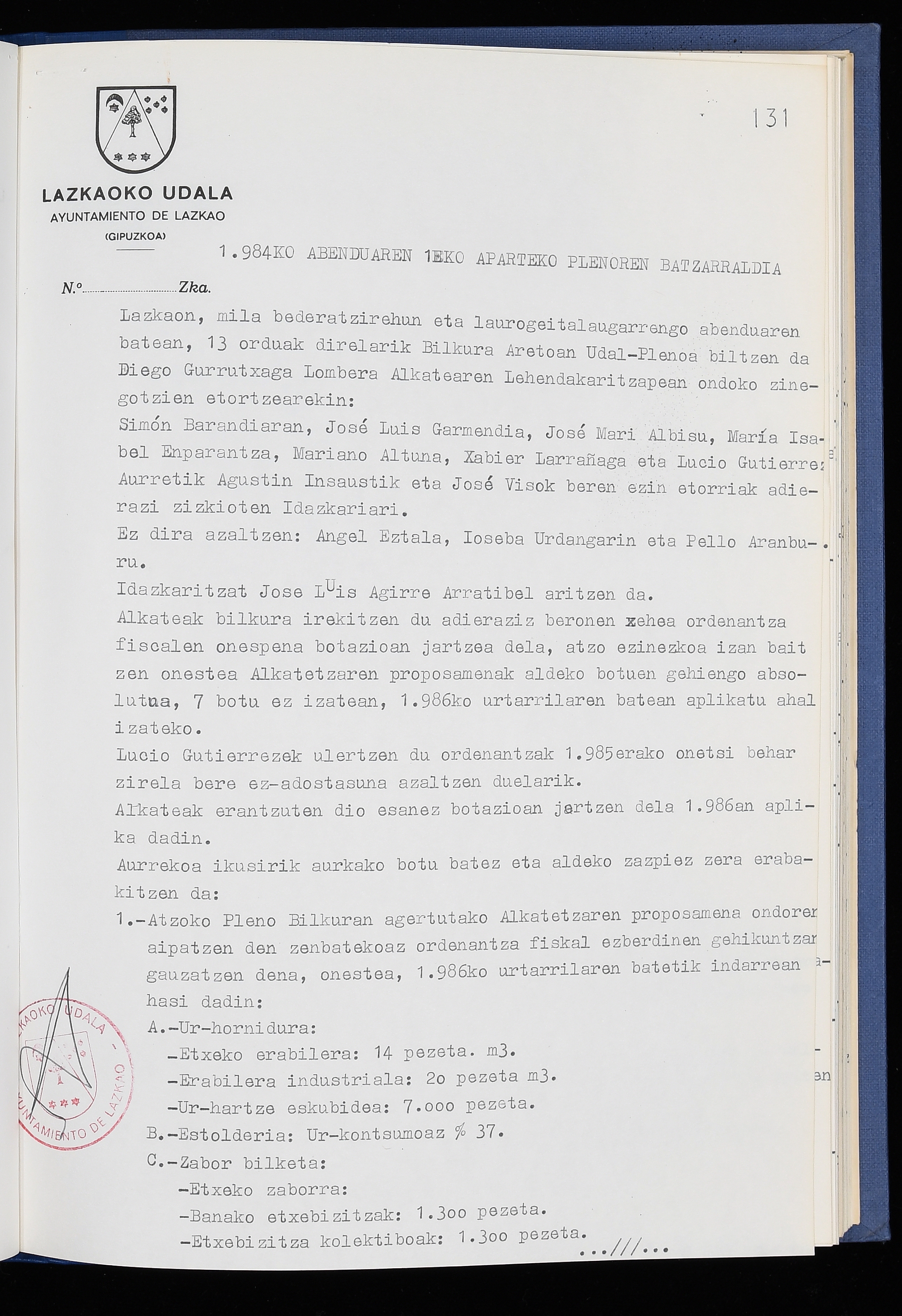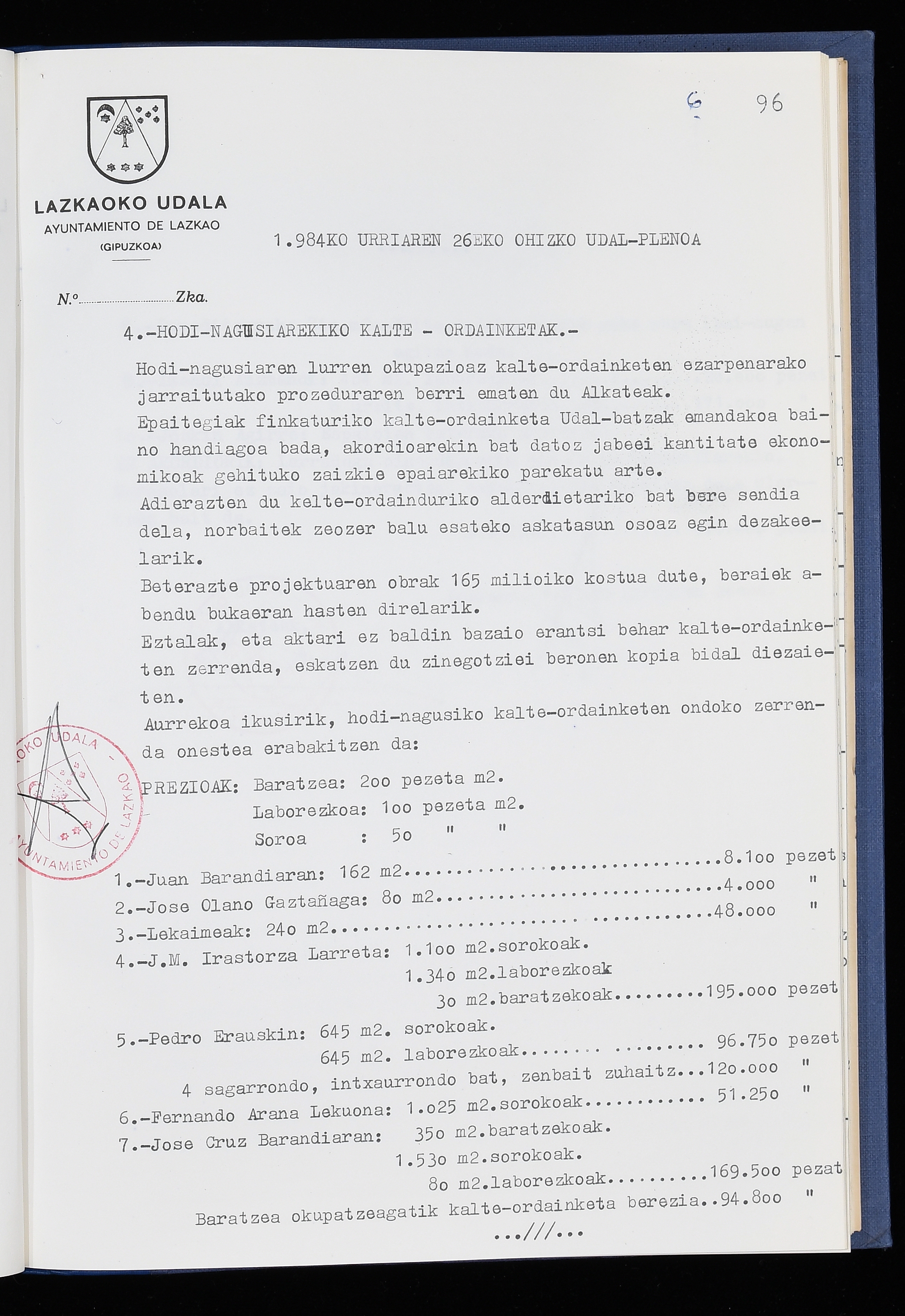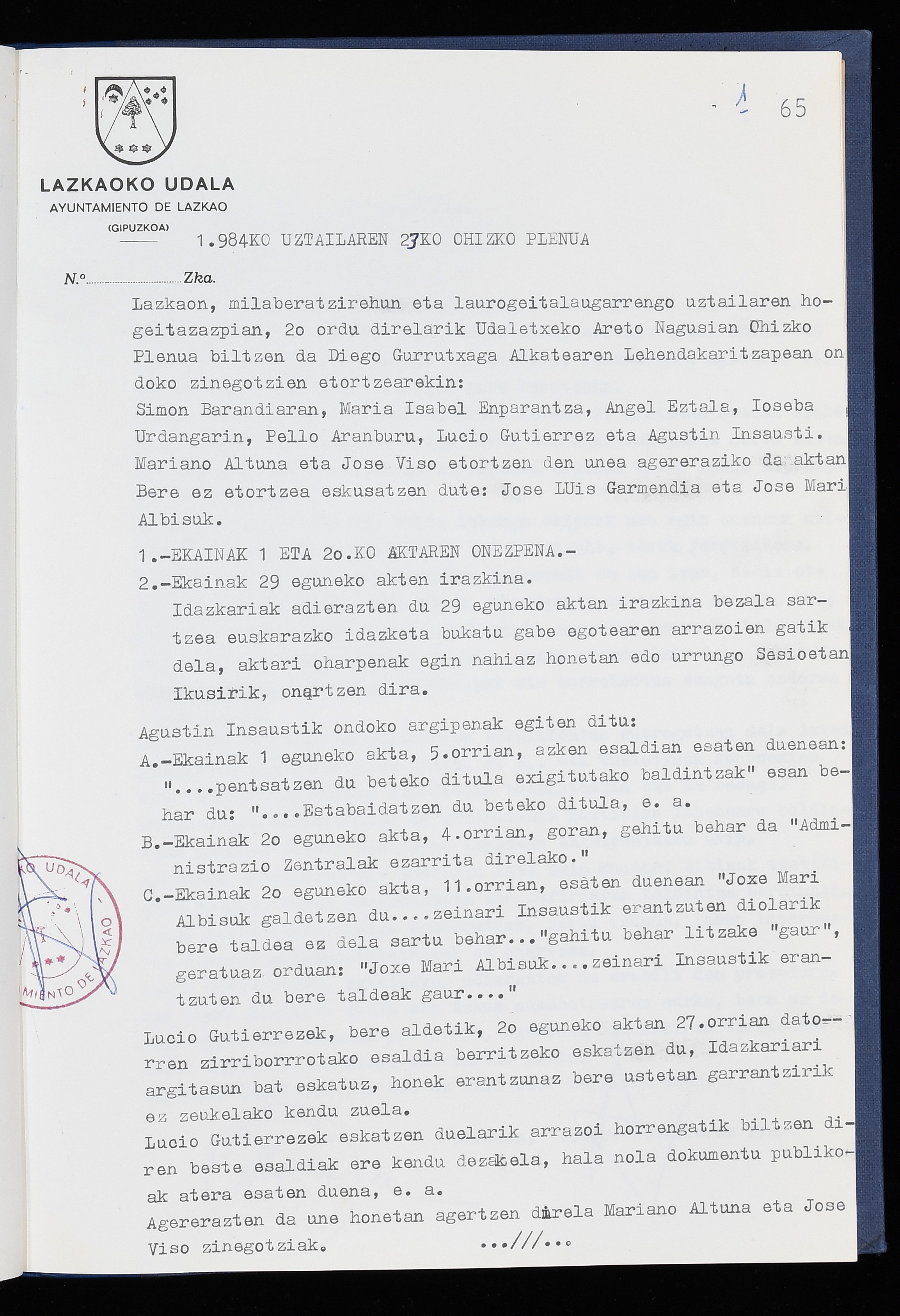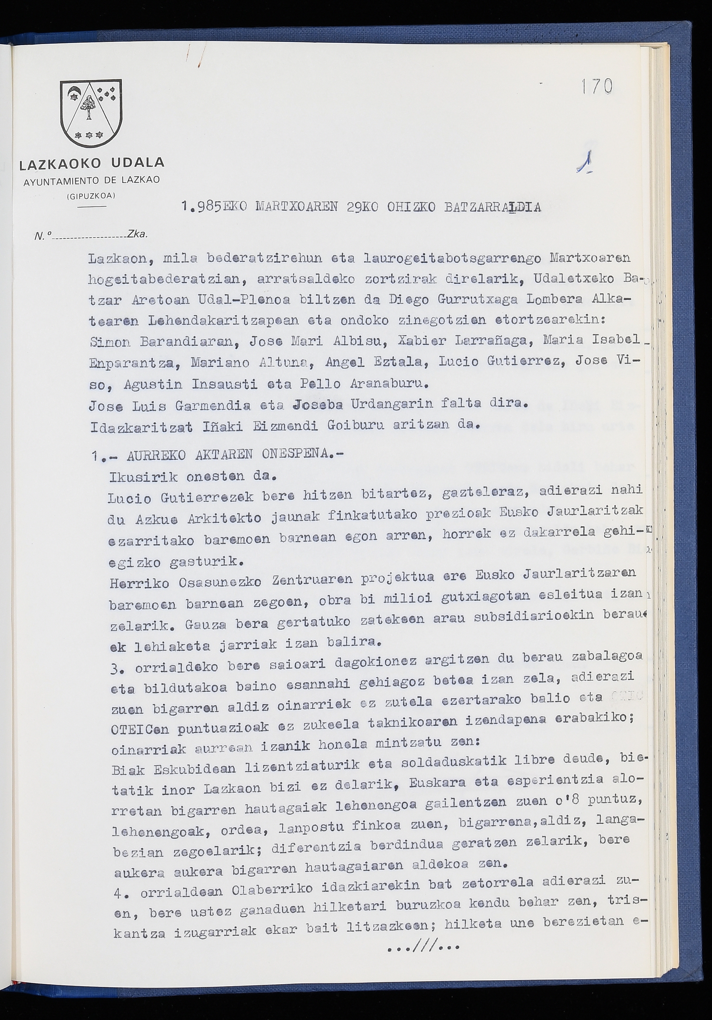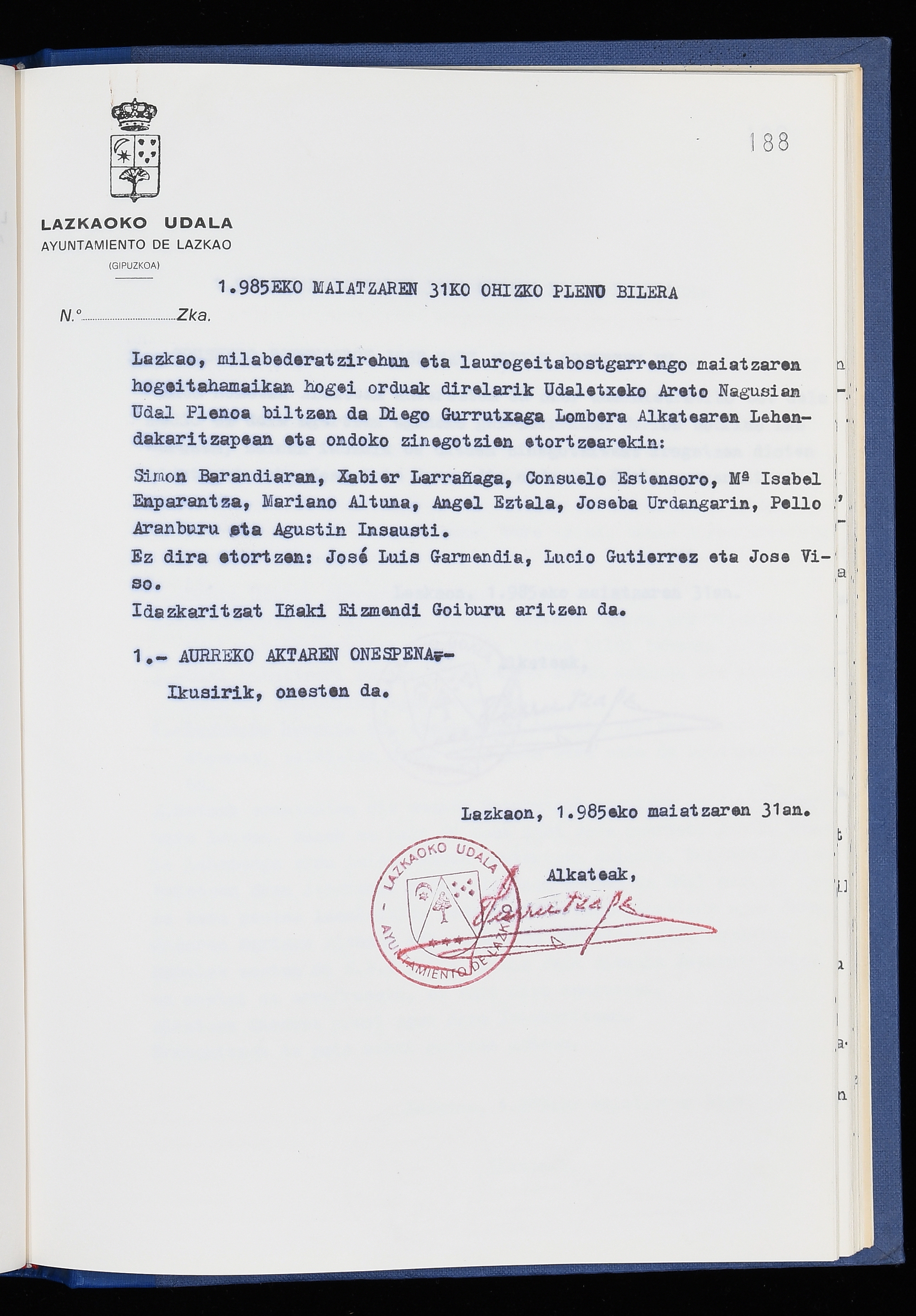 Log in to post commentsEdukiakSailkapenaFuntsaLazkaoko Udal ArtxiboaAtalakUdal AktakSailkapena1.1.4. Osoko Bilkuraren akta liburuakSailkapen berriaOsoko Bilkurako akta liburuakMultimediaIrudiakIdentifikazioaSignaturaakta liburua I-036Hasiera1984-06-01Amaiera1985-06-28AutoritateakTokiaLazkaoLog in to post commentsAkta eratu