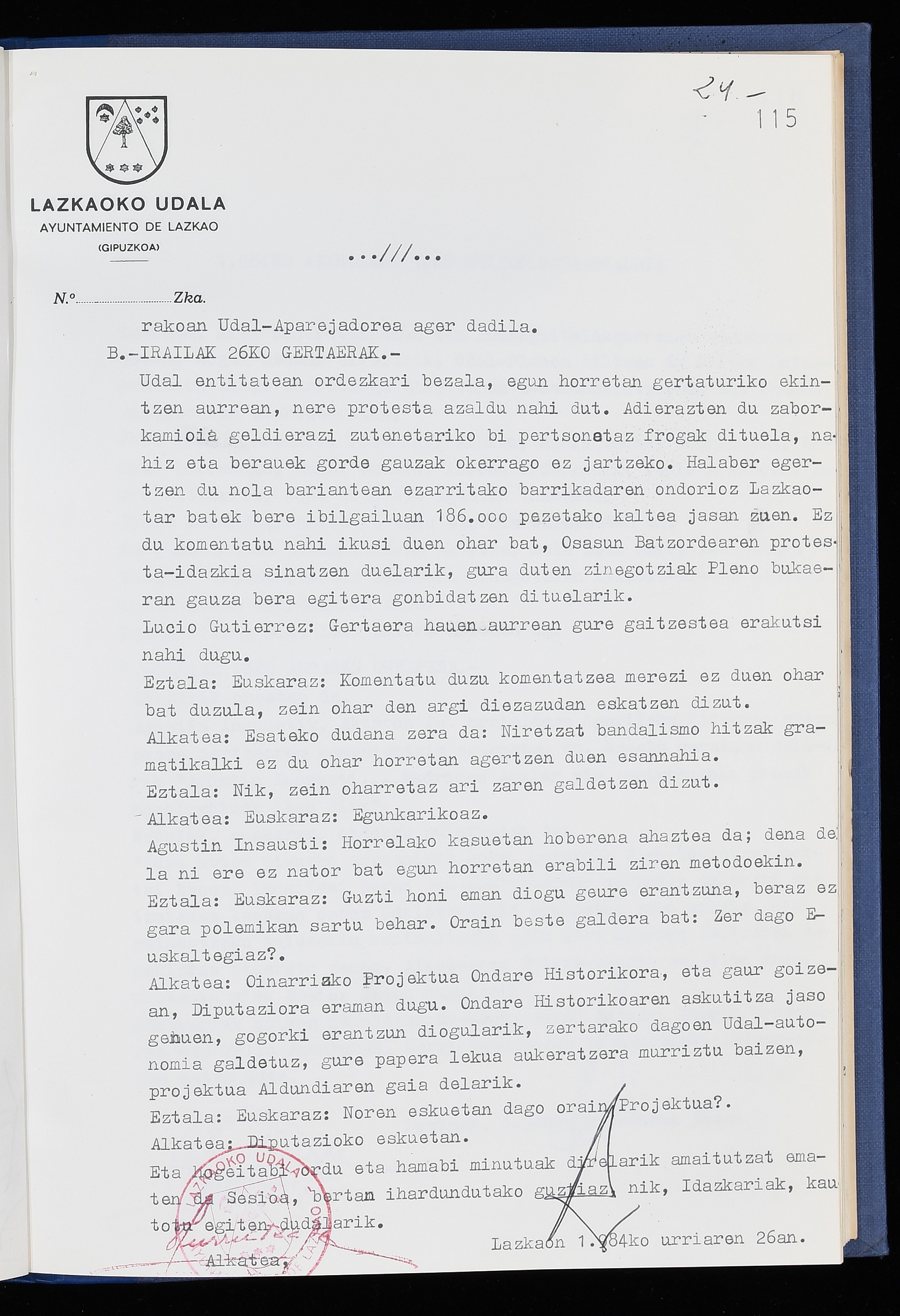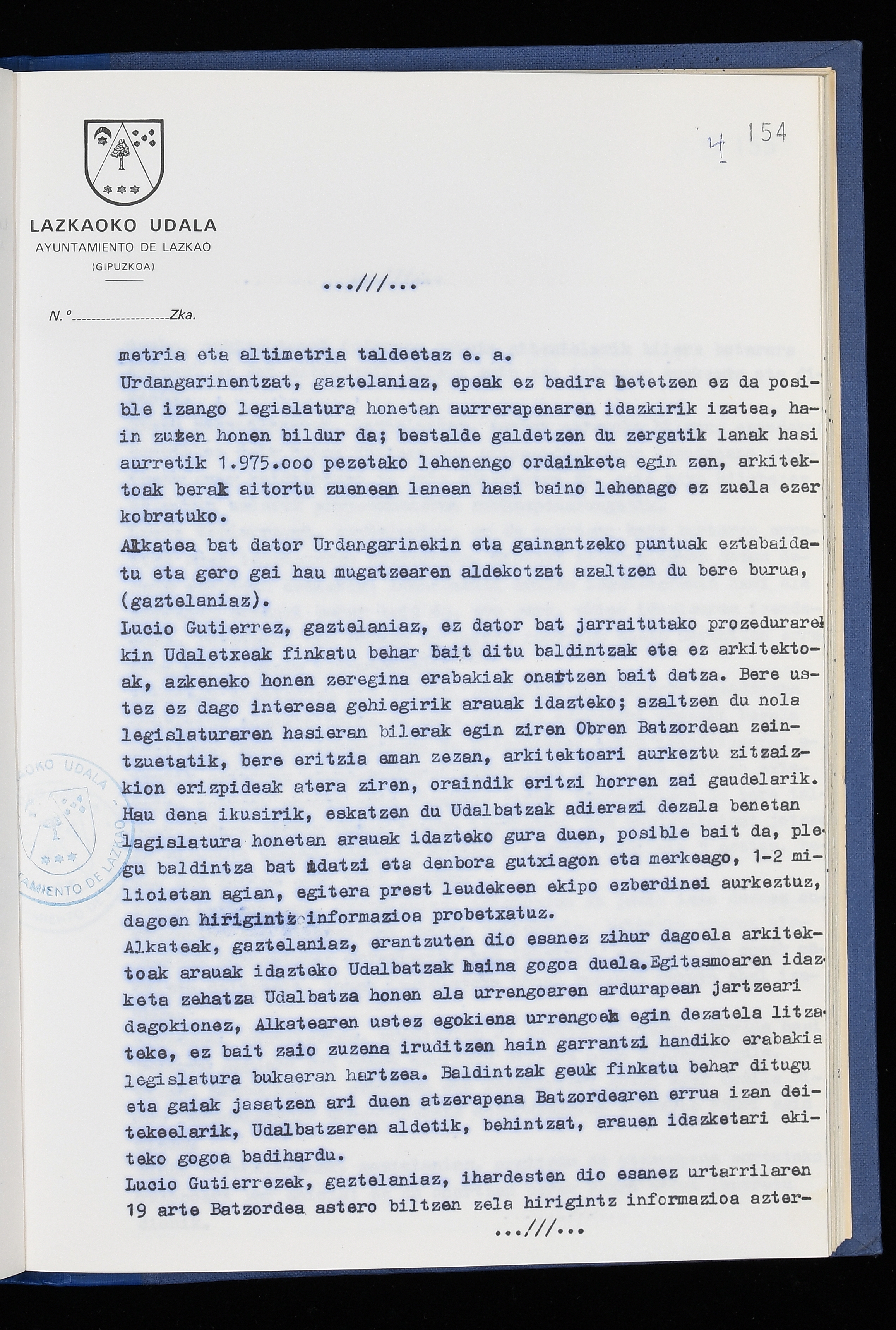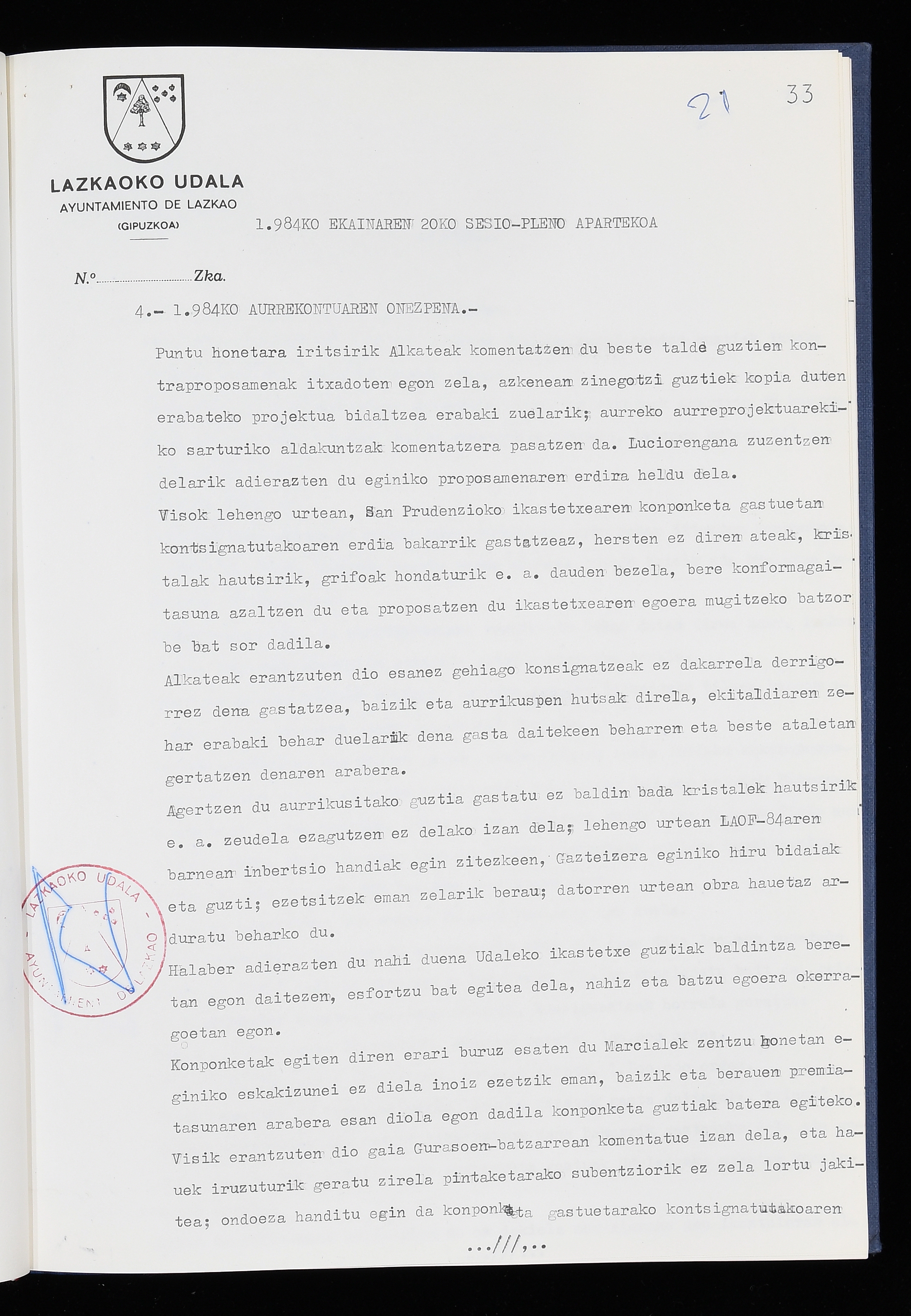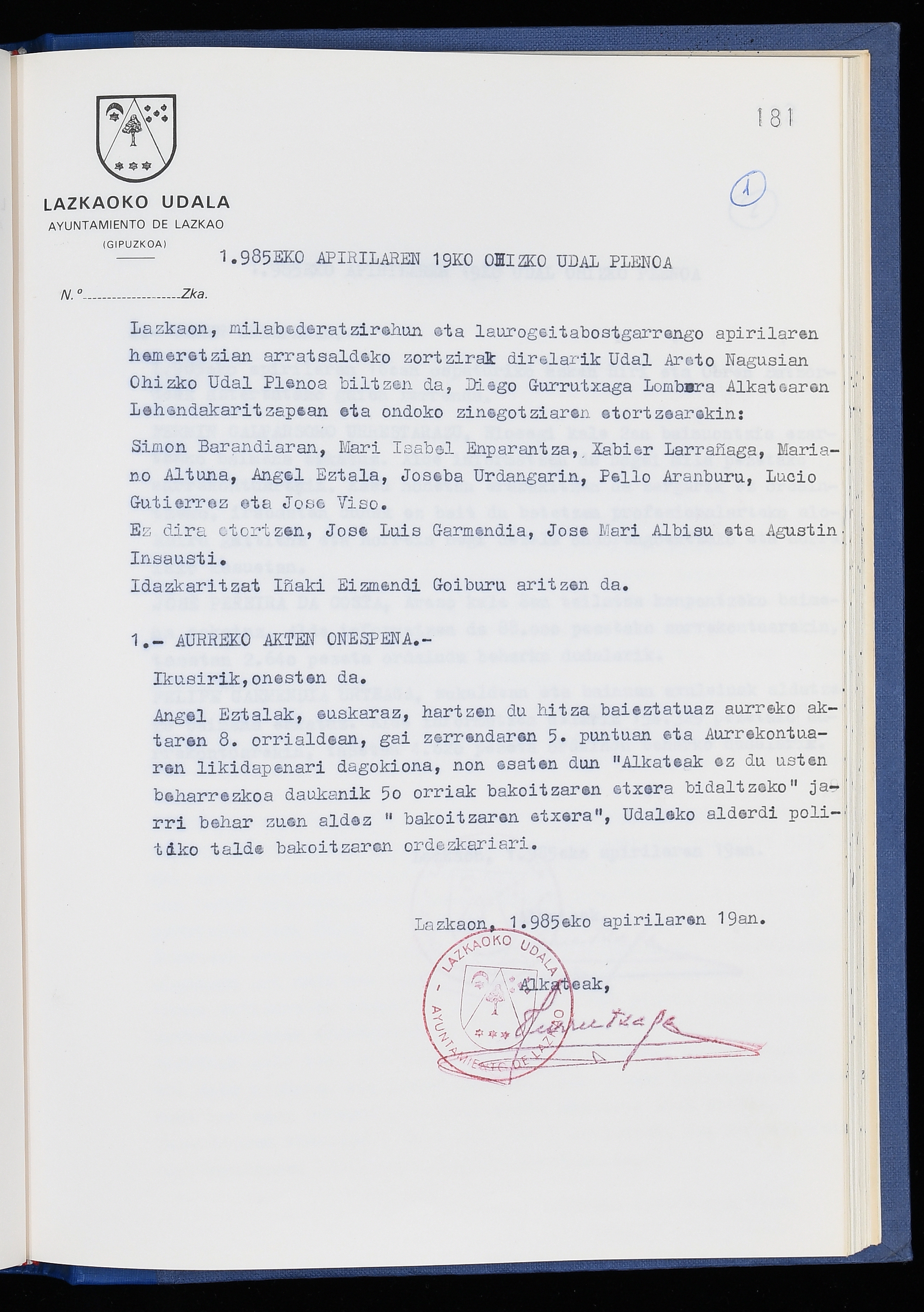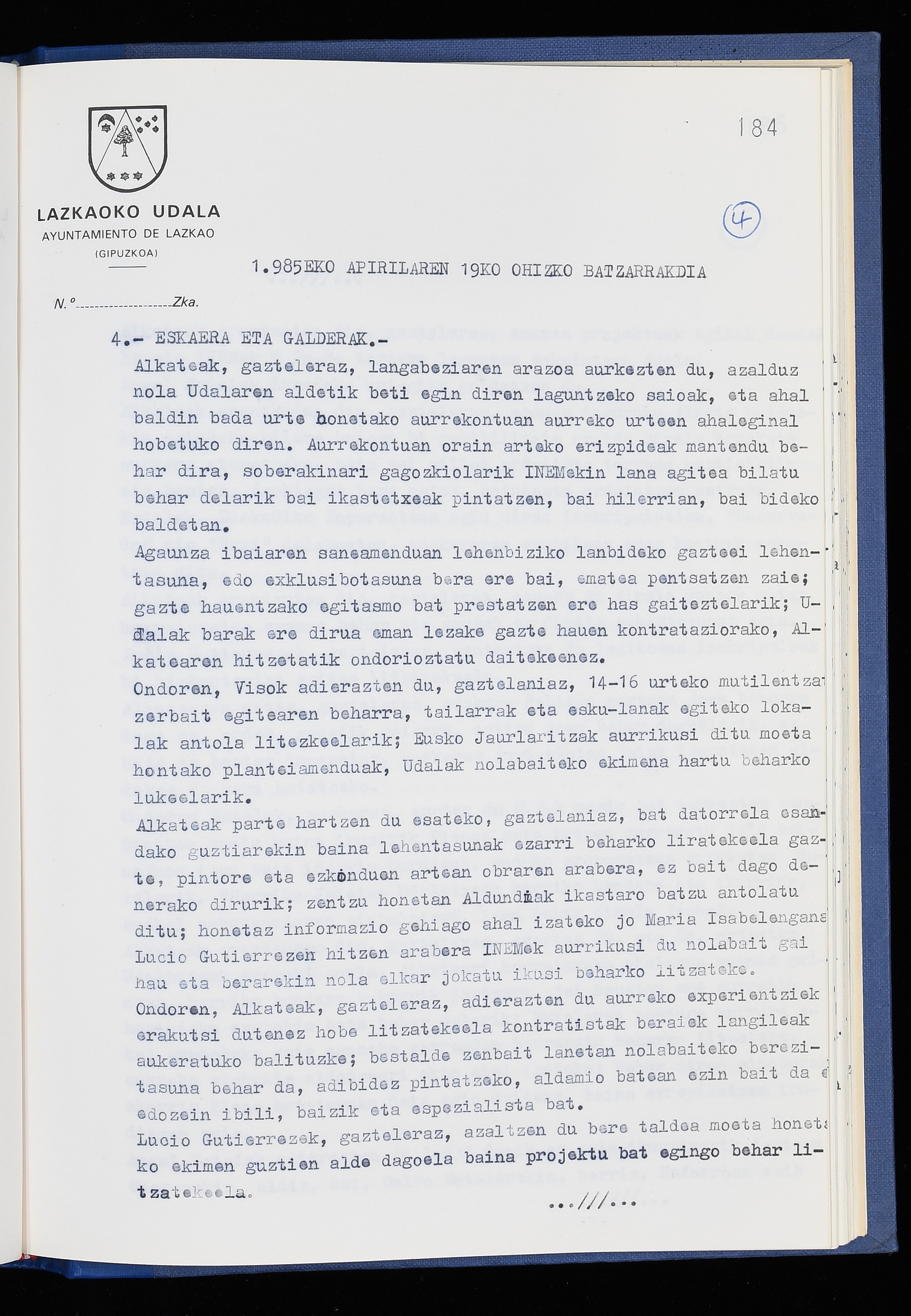 Log in to post commentsEdukiakSailkapenaFuntsaLazkaoko Udal ArtxiboaAtalakUdal AktakSailkapena1.1.4. Osoko Bilkuraren akta liburuakSailkapen berriaOsoko Bilkurako akta liburuakMultimediaIrudiakIdentifikazioaSignaturaakta liburua I-036Hasiera1984-06-01Amaiera1985-06-28AutoritateakTokiaLazkaoLog in to post commentsAkta eratu