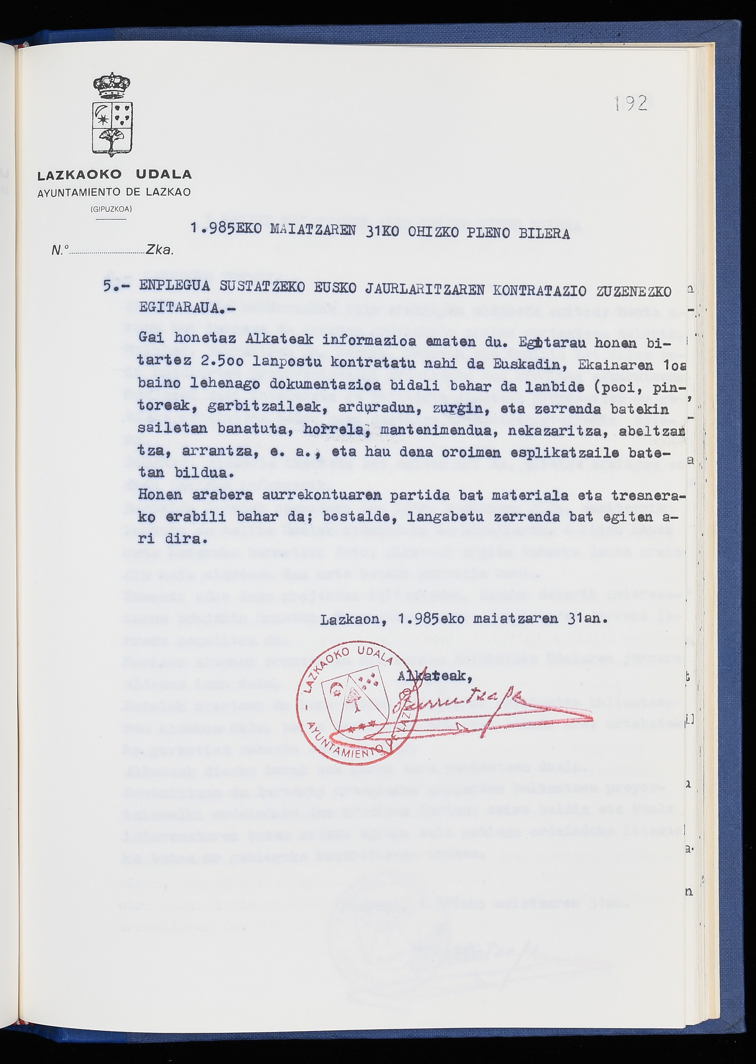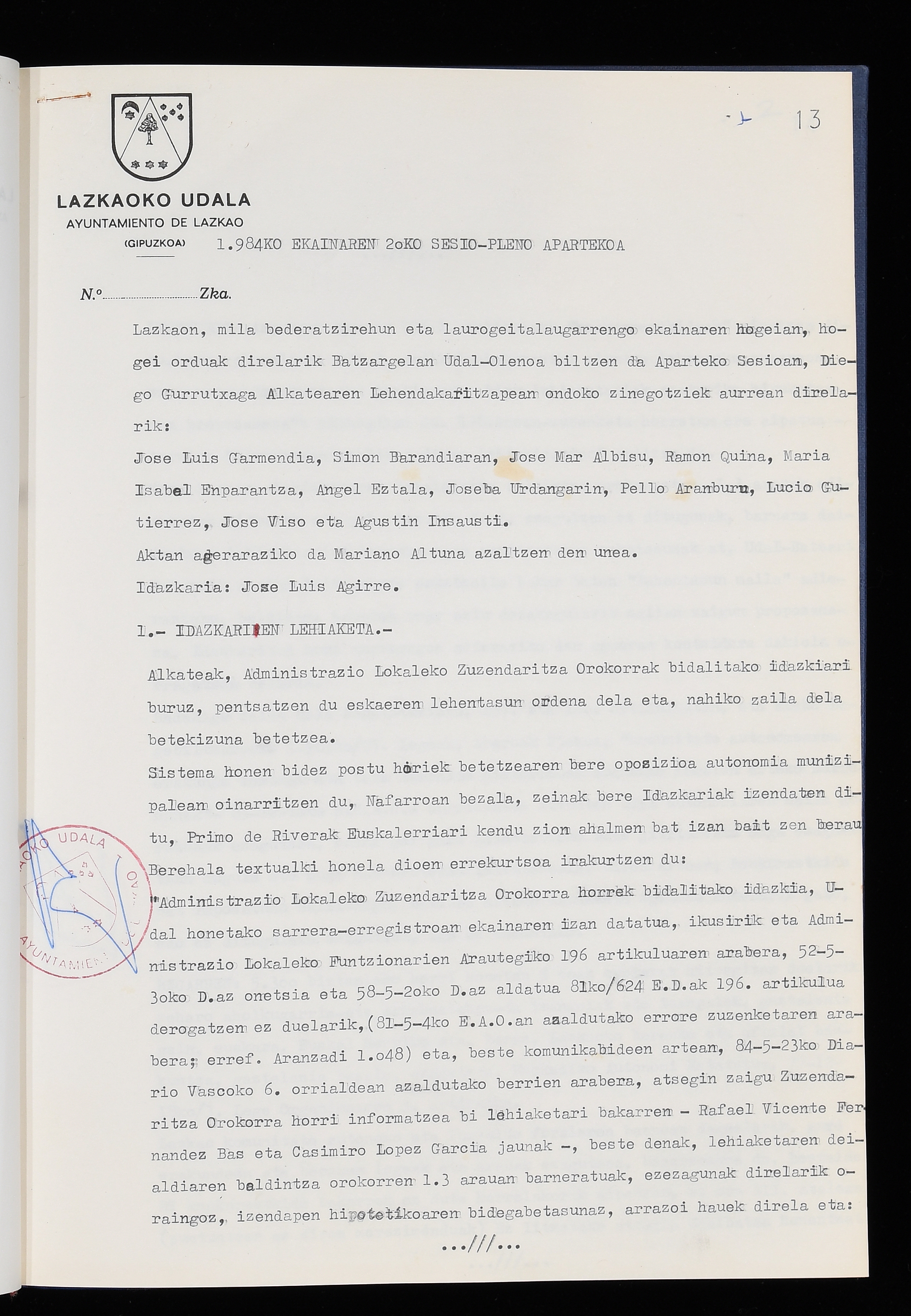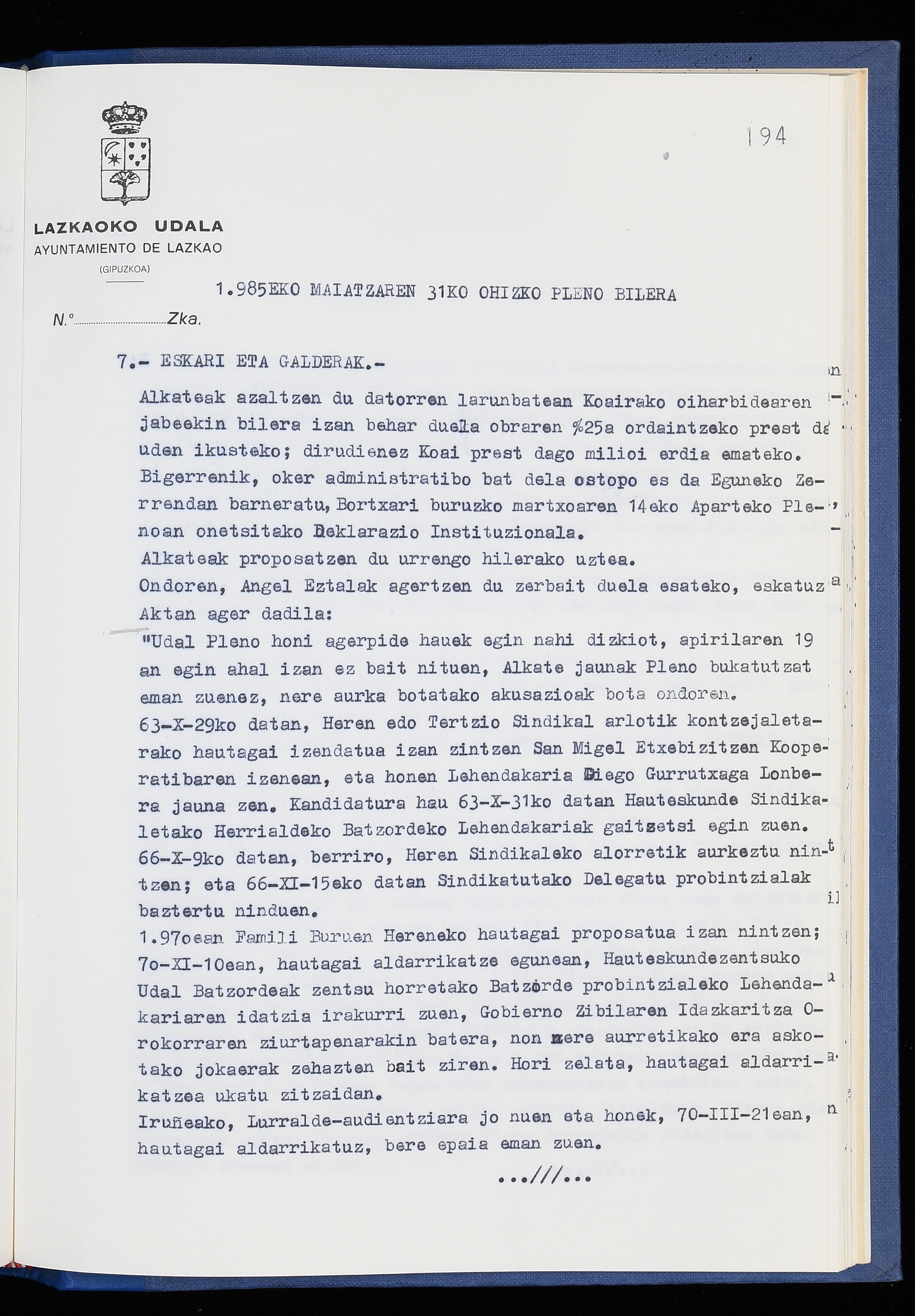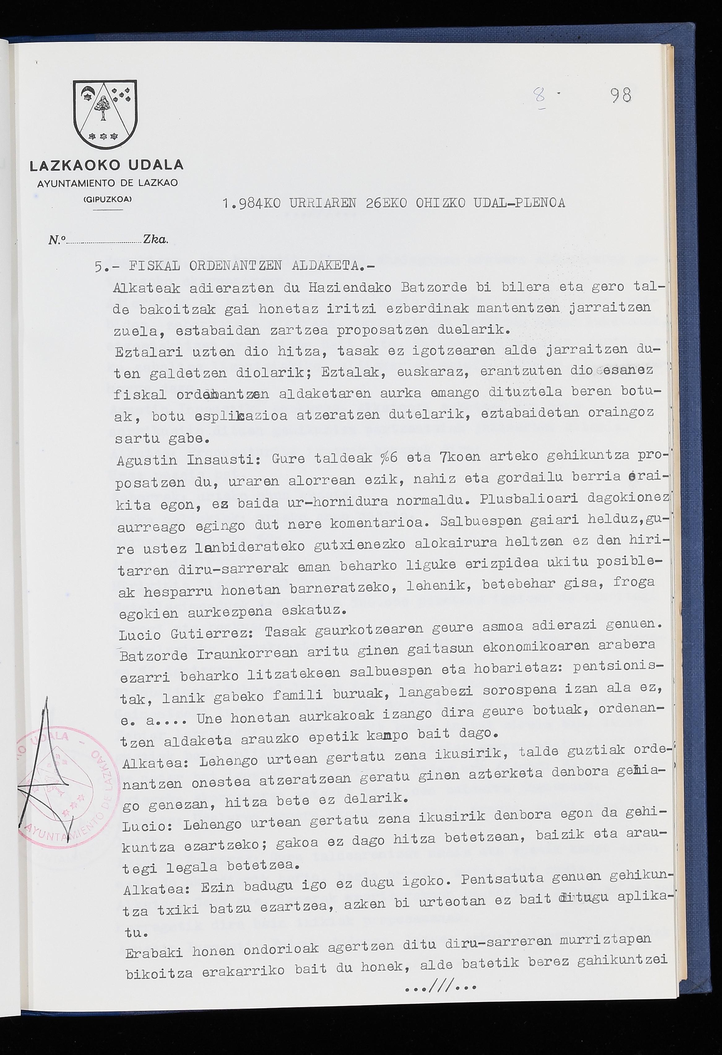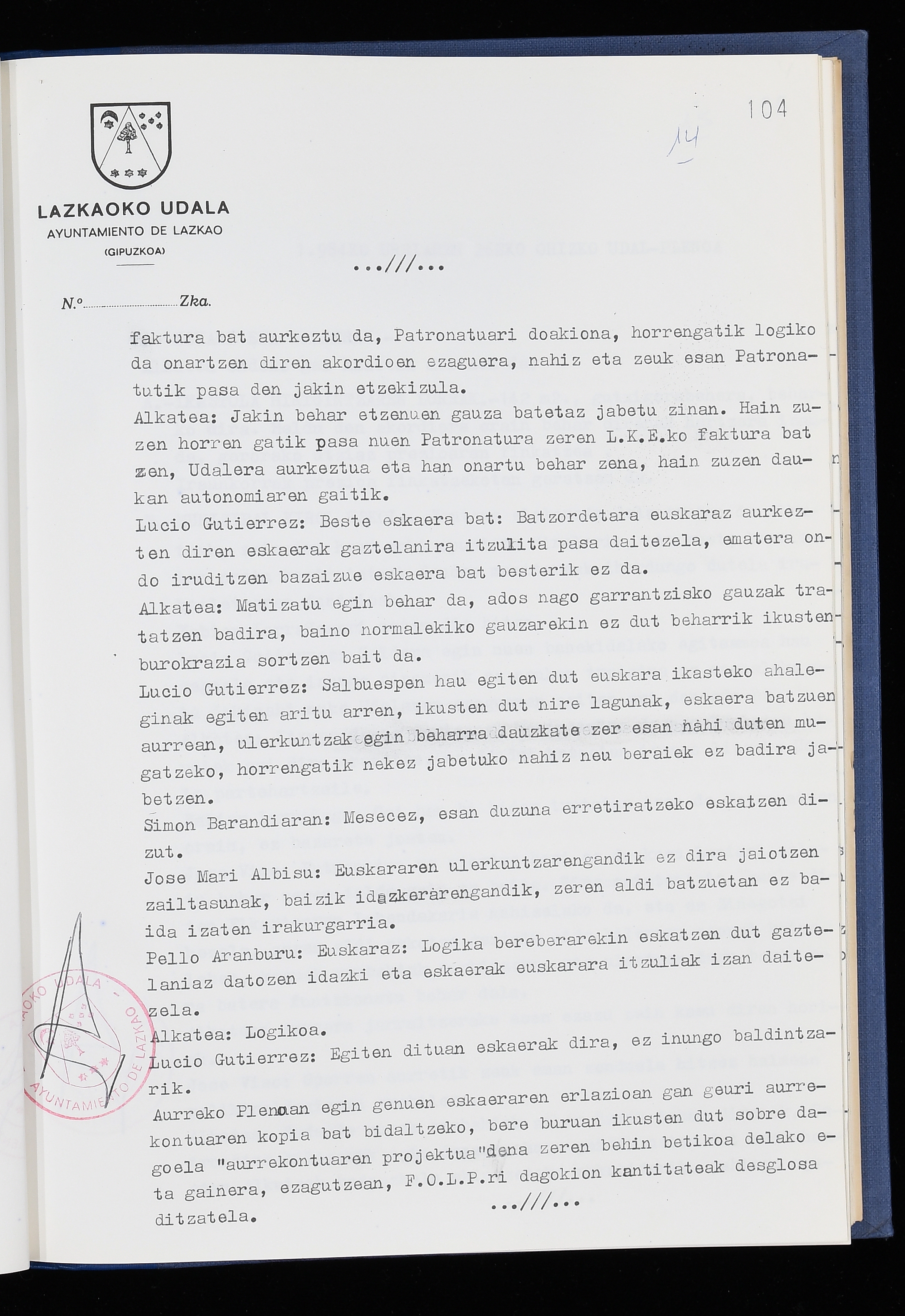 Log in to post commentsEdukiakSailkapenaFuntsaLazkaoko Udal ArtxiboaAtalakUdal AktakSailkapena1.1.4. Osoko Bilkuraren akta liburuakSailkapen berriaOsoko Bilkurako akta liburuakMultimediaIrudiakIdentifikazioaSignaturaakta liburua I-036Hasiera1984-06-01Amaiera1985-06-28AutoritateakTokiaLazkaoLog in to post commentsAkta eratu