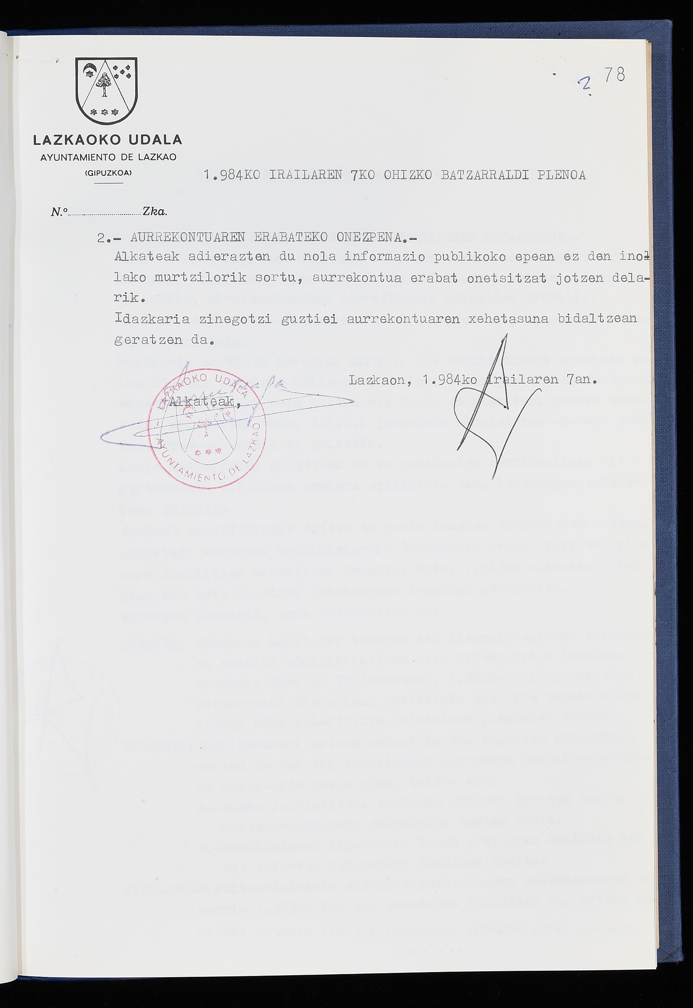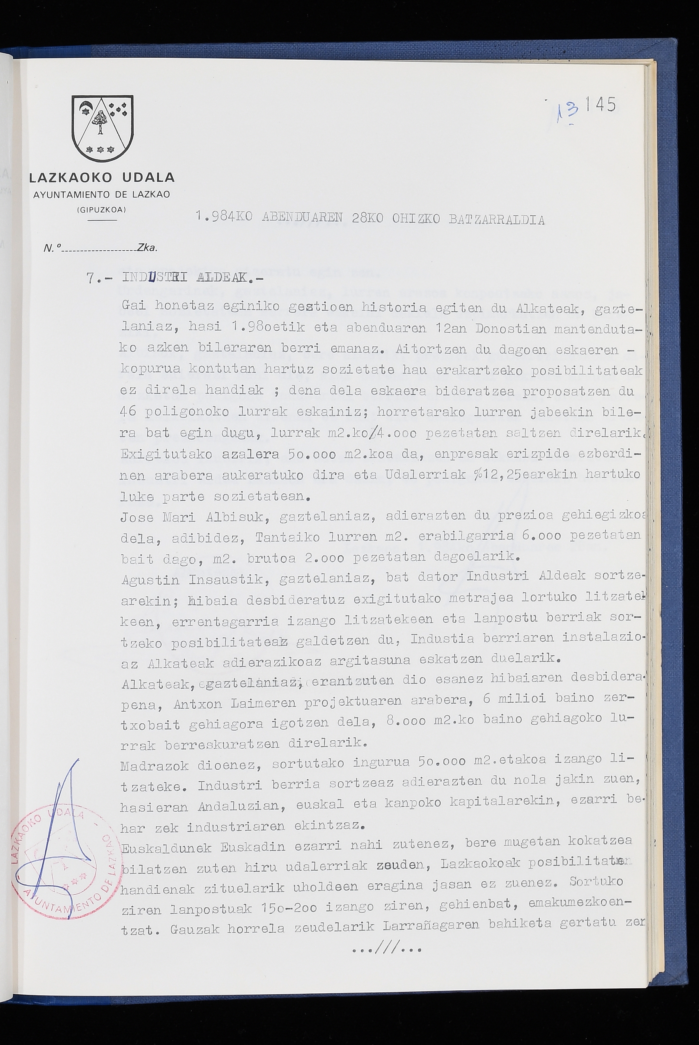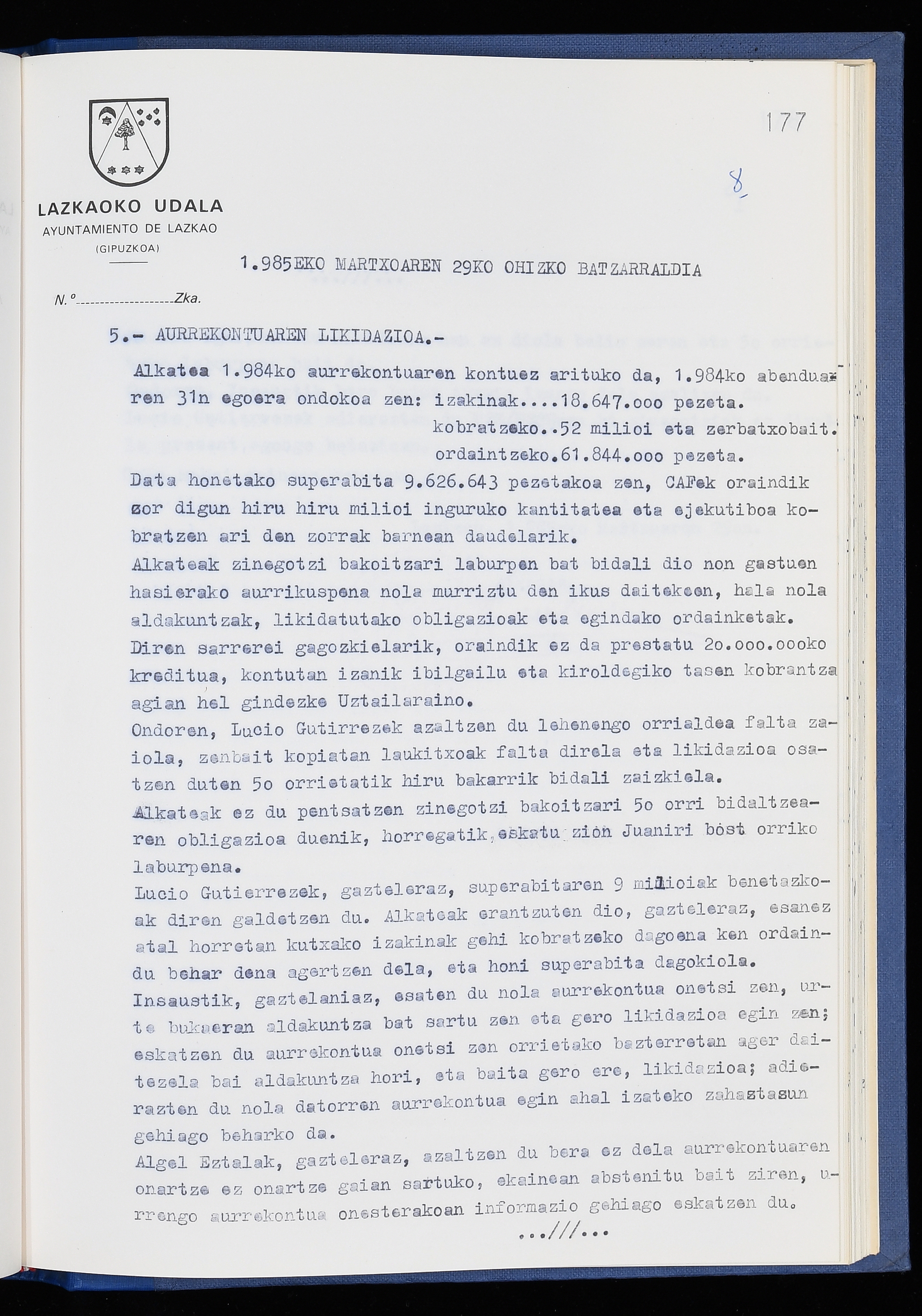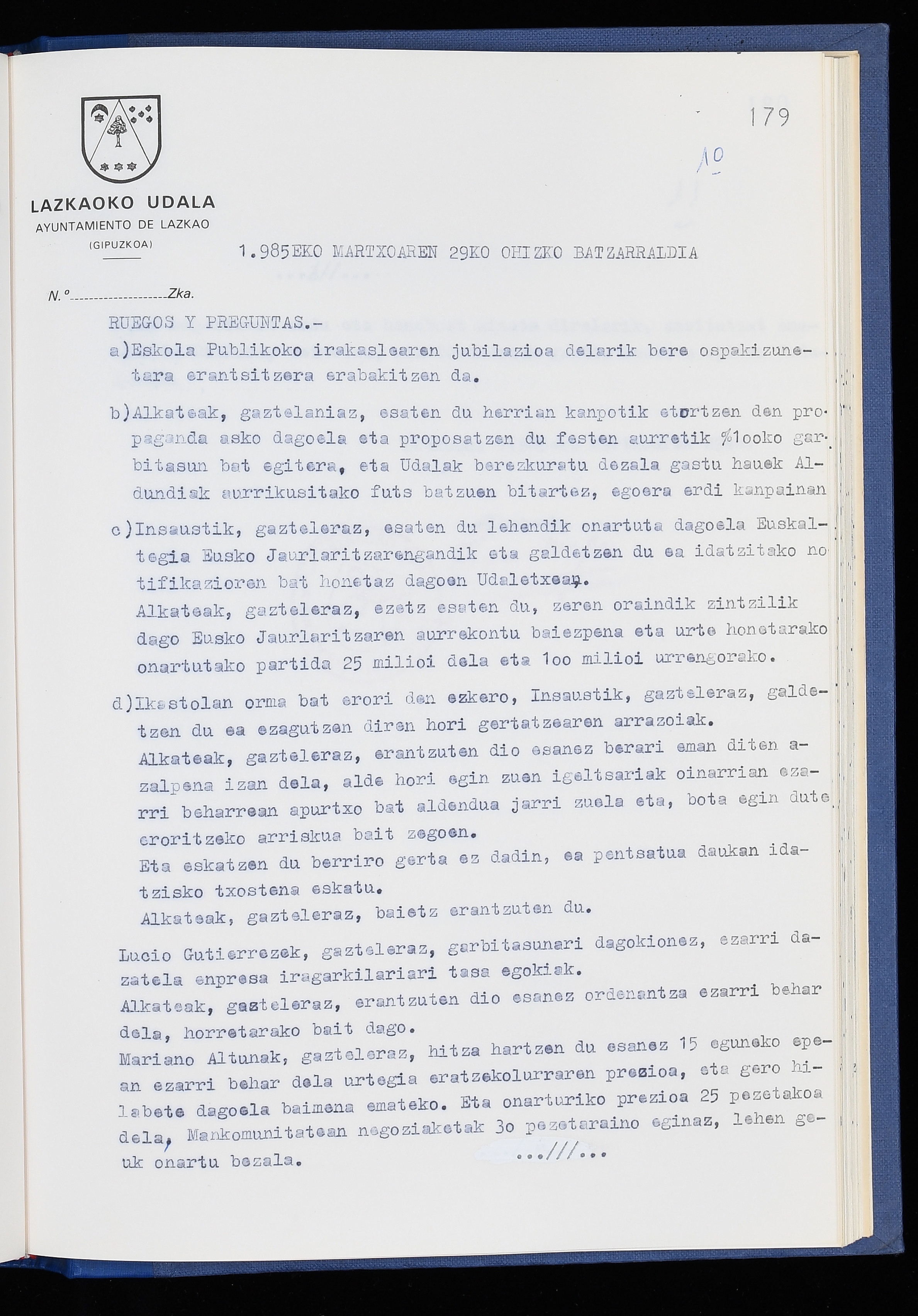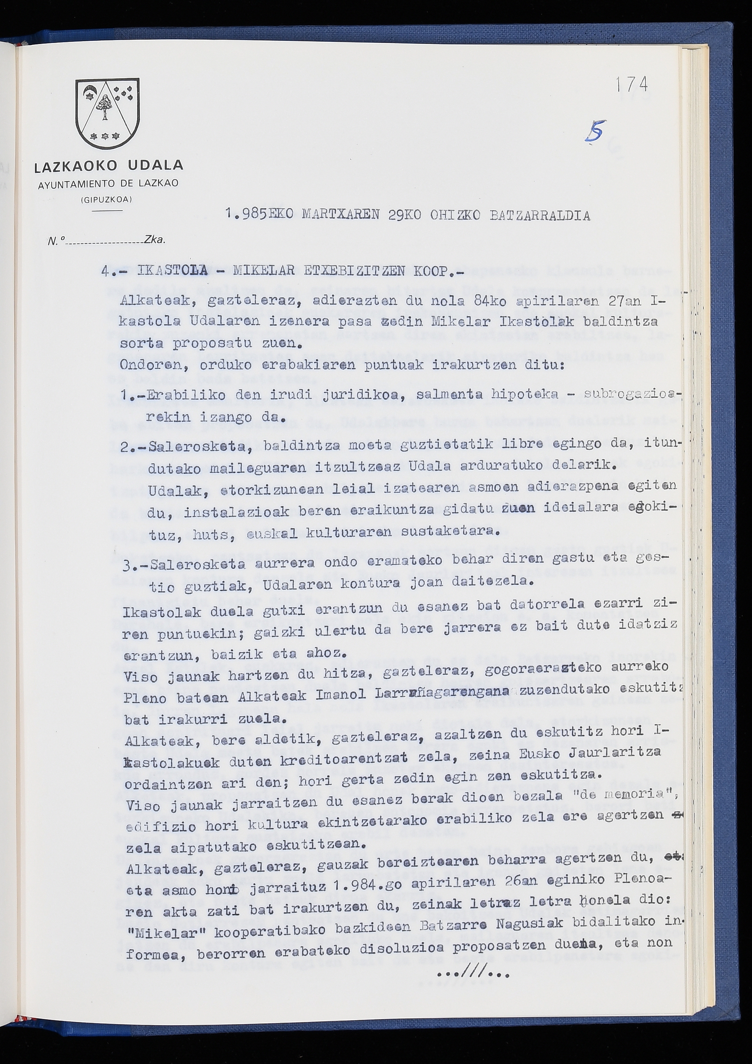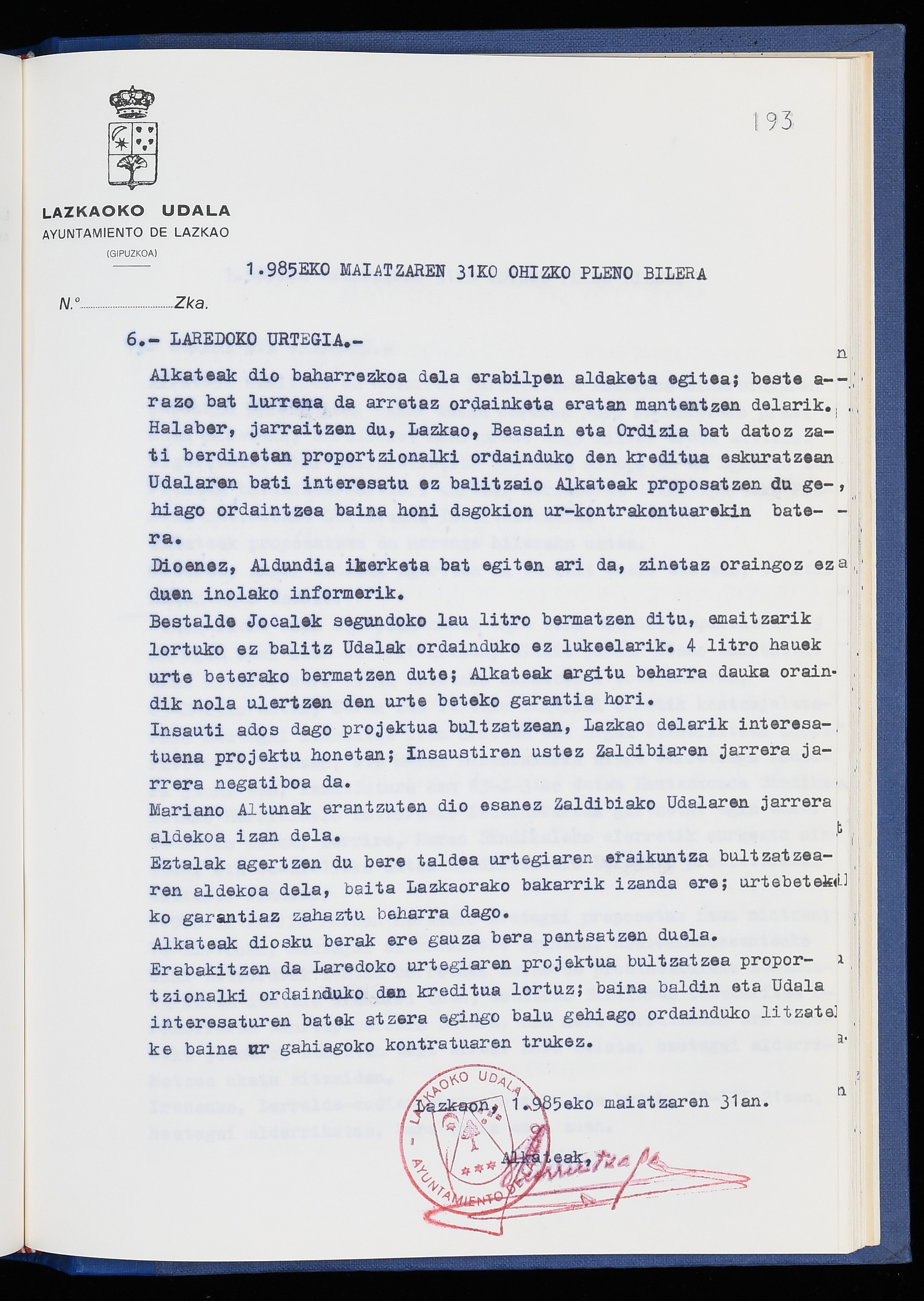 Log in to post commentsEdukiakSailkapenaFuntsaLazkaoko Udal ArtxiboaAtalakUdal AktakSailkapena1.1.4. Osoko Bilkuraren akta liburuakSailkapen berriaOsoko Bilkurako akta liburuakMultimediaIrudiakIdentifikazioaSignaturaakta liburua I-036Hasiera1984-06-01Amaiera1985-06-28AutoritateakTokiaLazkaoLog in to post commentsAkta eratu