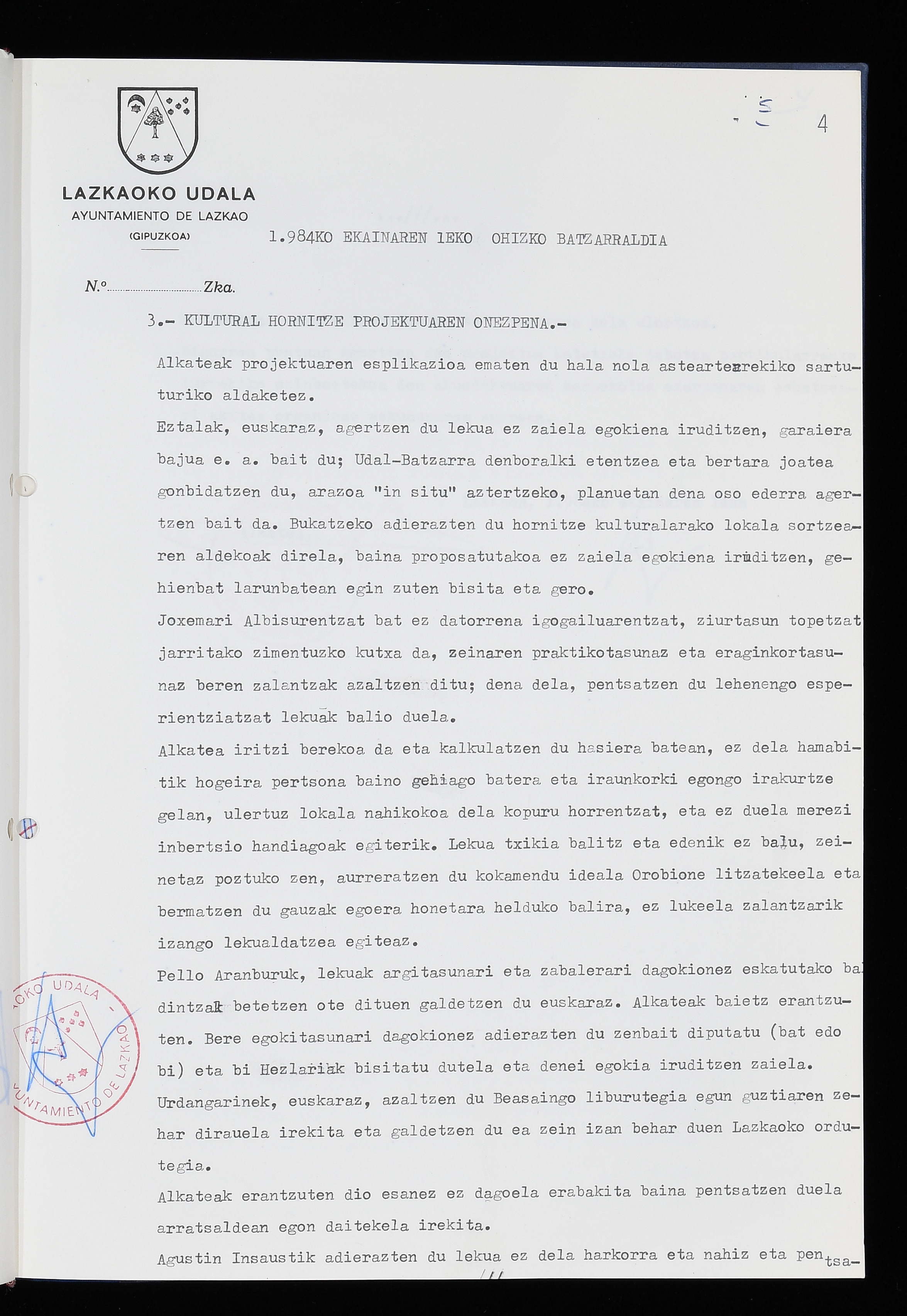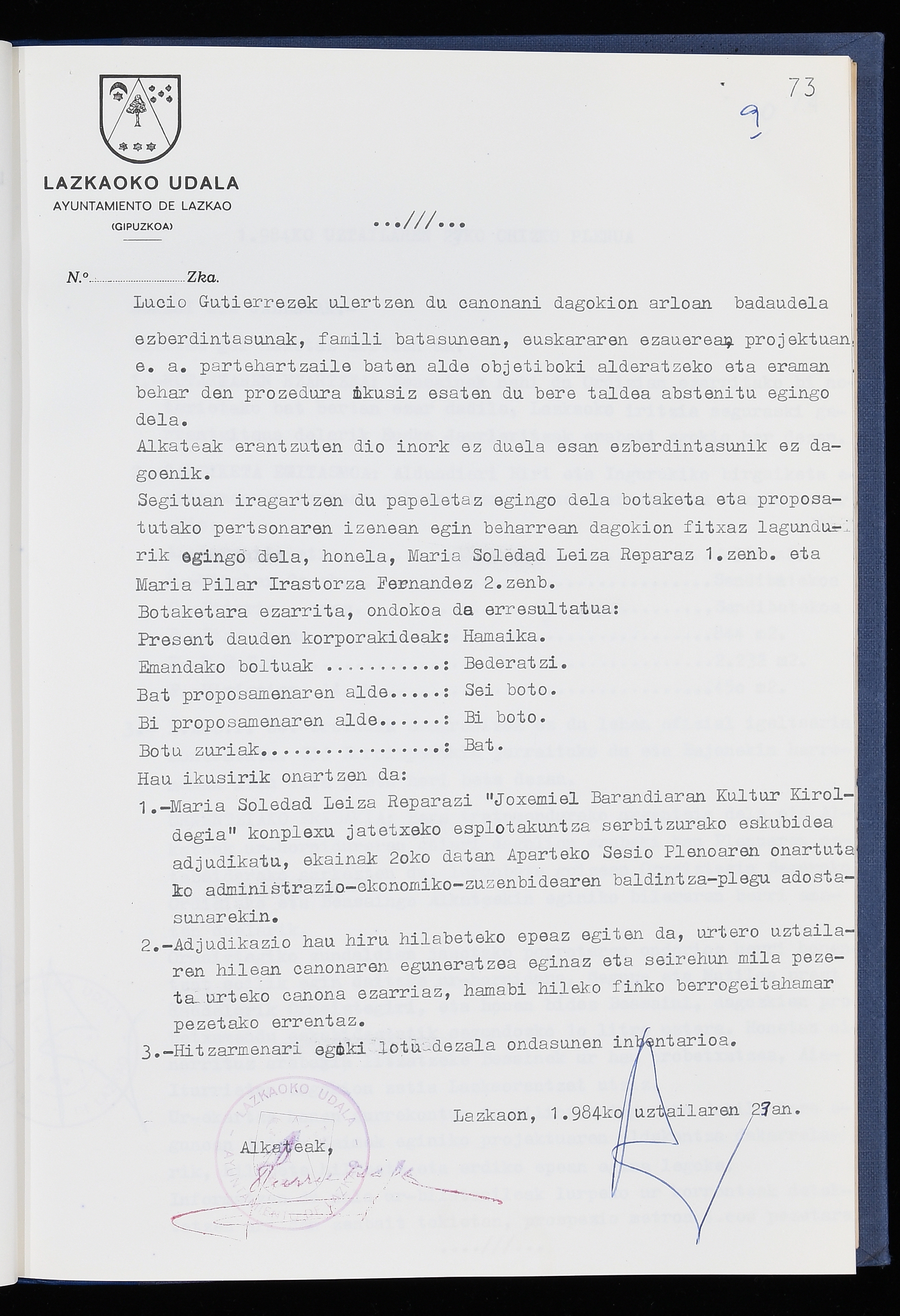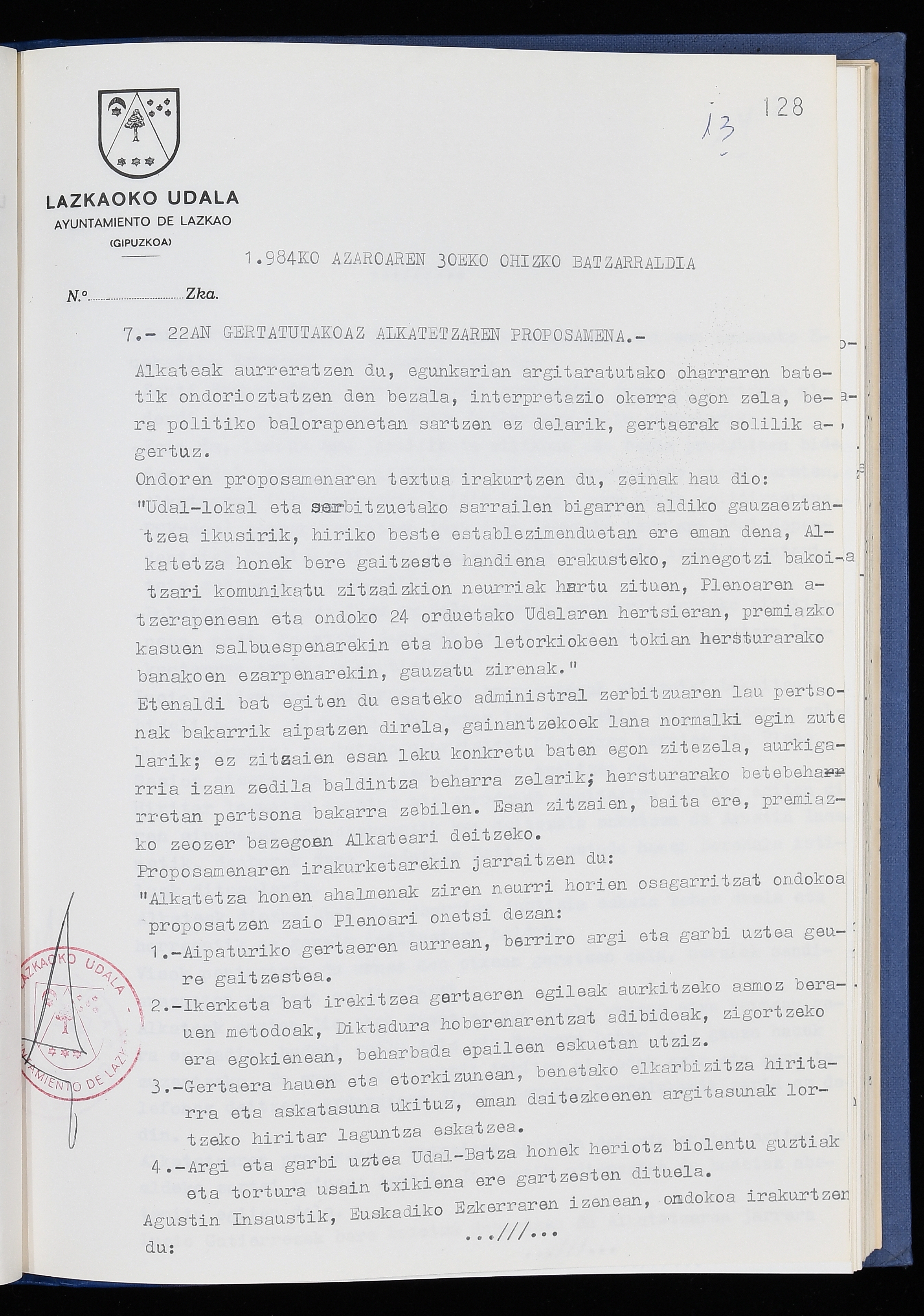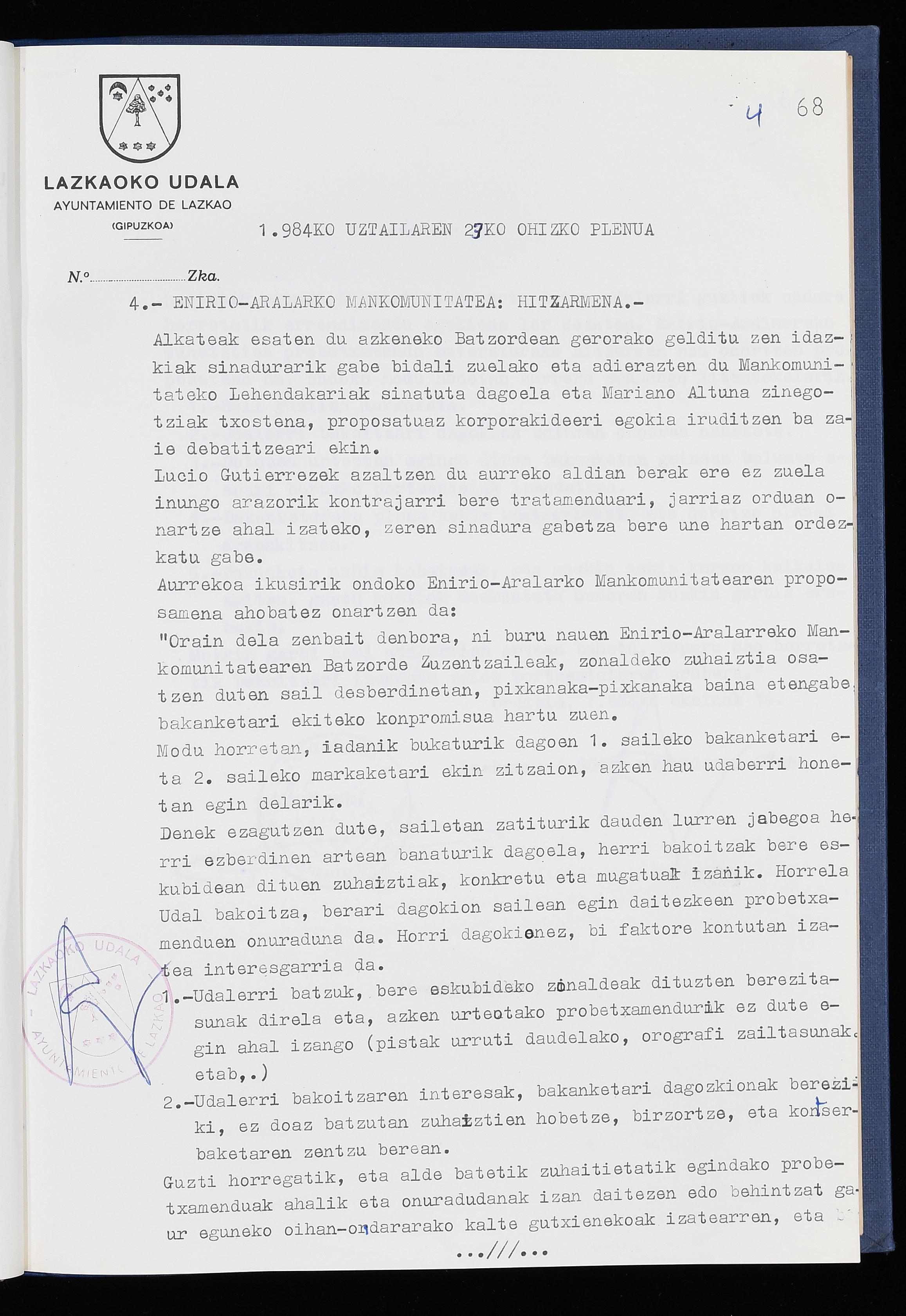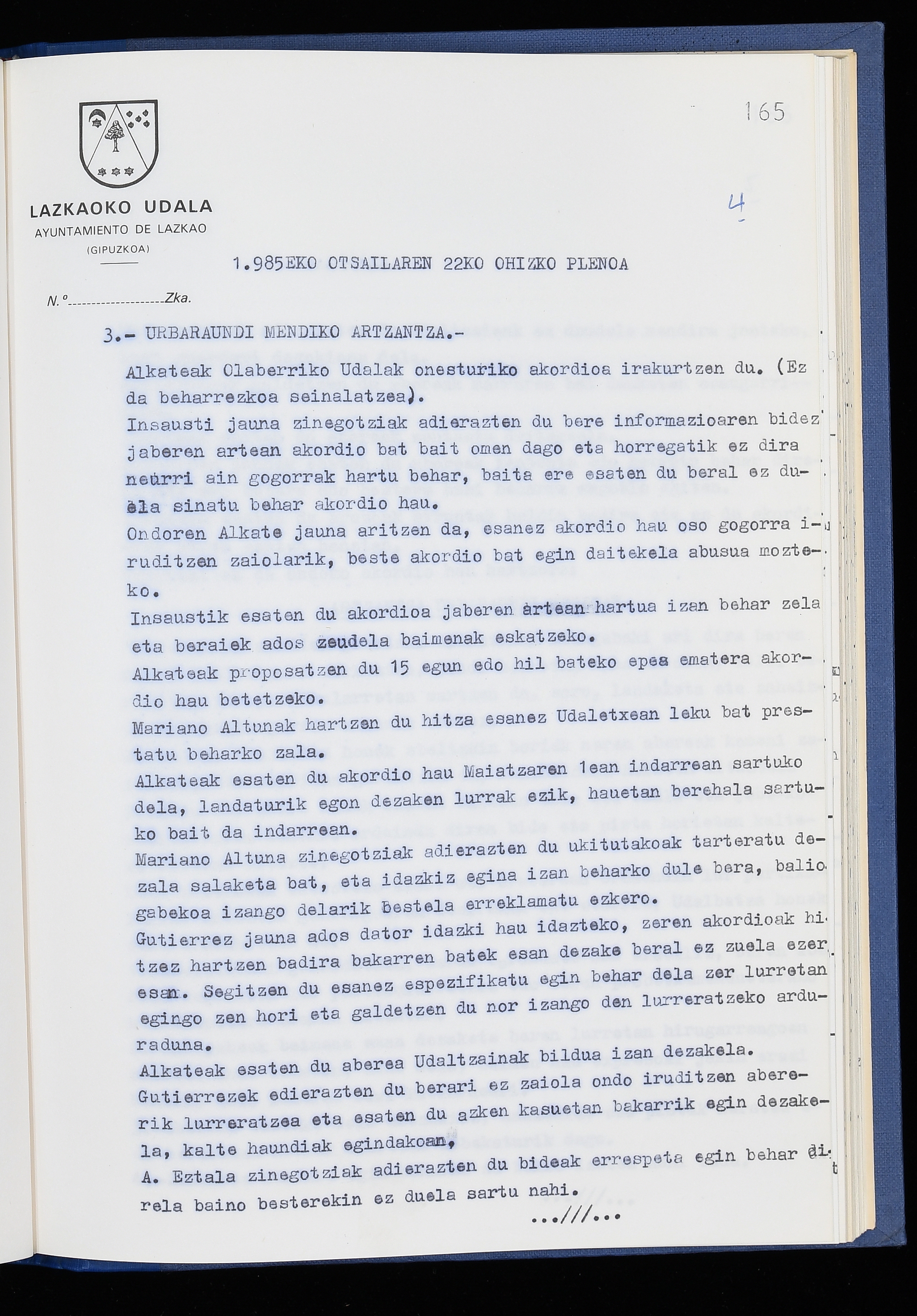 Log in to post commentsEdukiakSailkapenaFuntsaLazkaoko Udal ArtxiboaAtalakUdal AktakSailkapena1.1.4. Osoko Bilkuraren akta liburuakSailkapen berriaOsoko Bilkurako akta liburuakMultimediaIrudiakIdentifikazioaSignaturaakta liburua I-036Hasiera1984-06-01Amaiera1985-06-28AutoritateakTokiaLazkaoLog in to post commentsAkta eratu