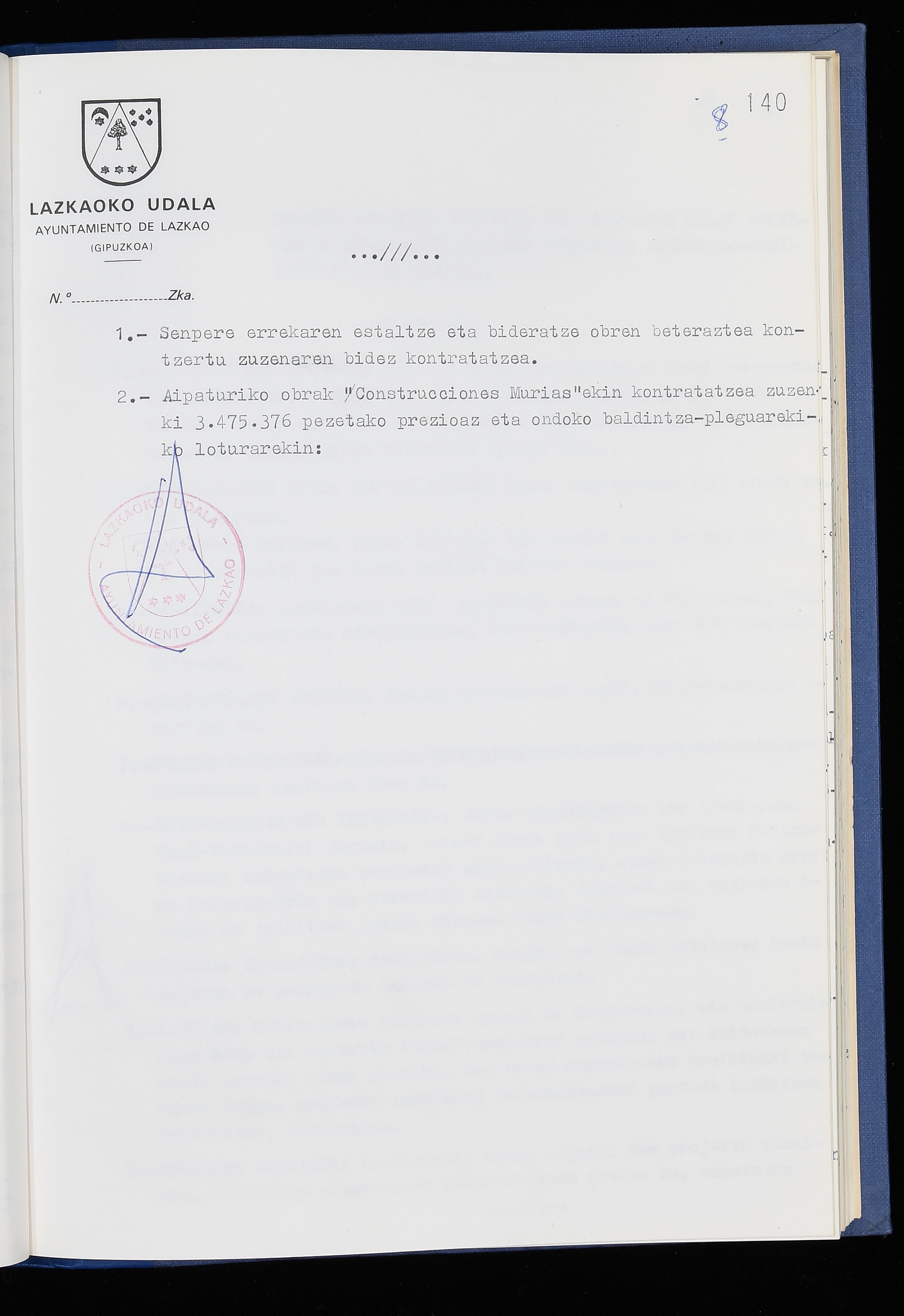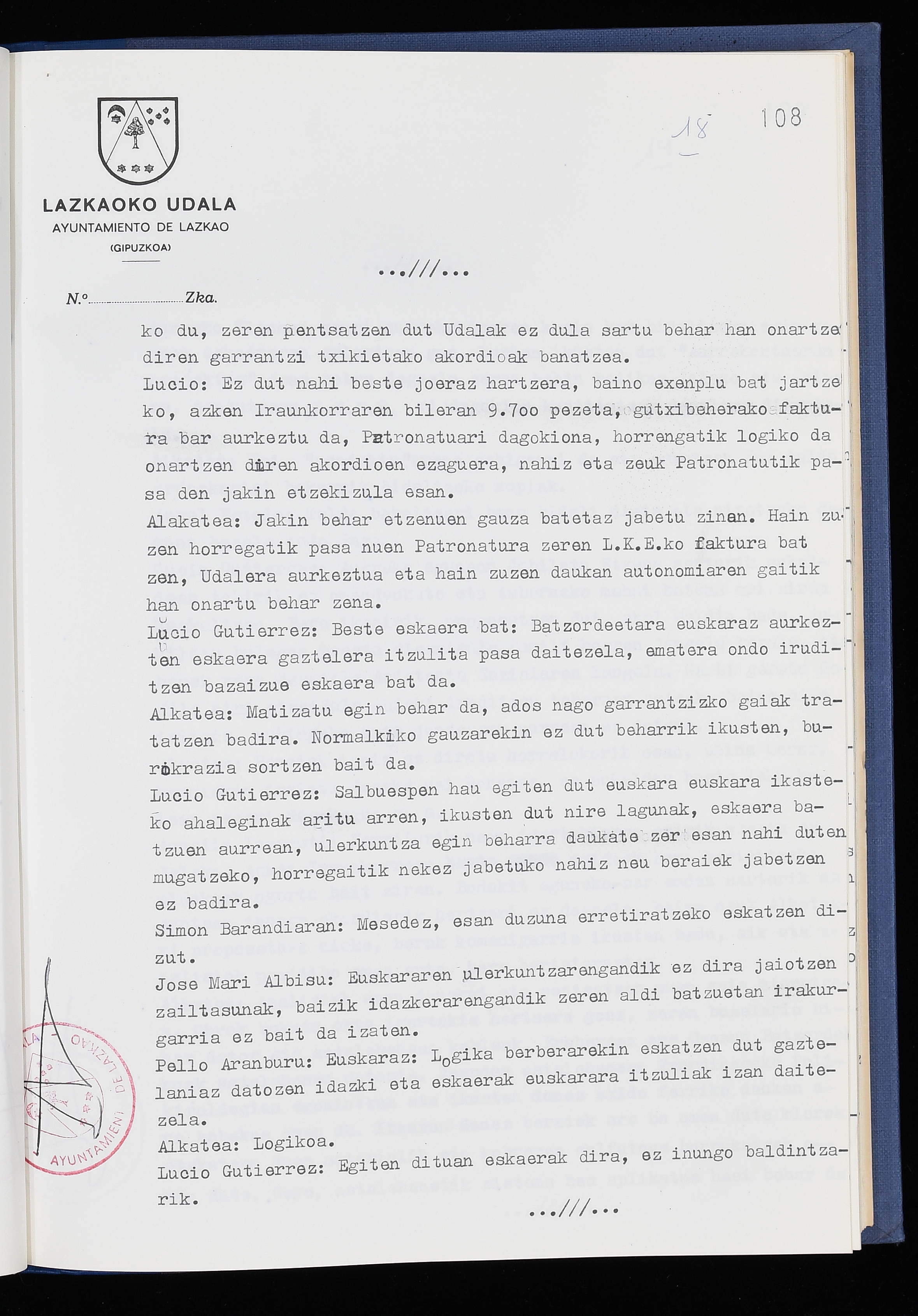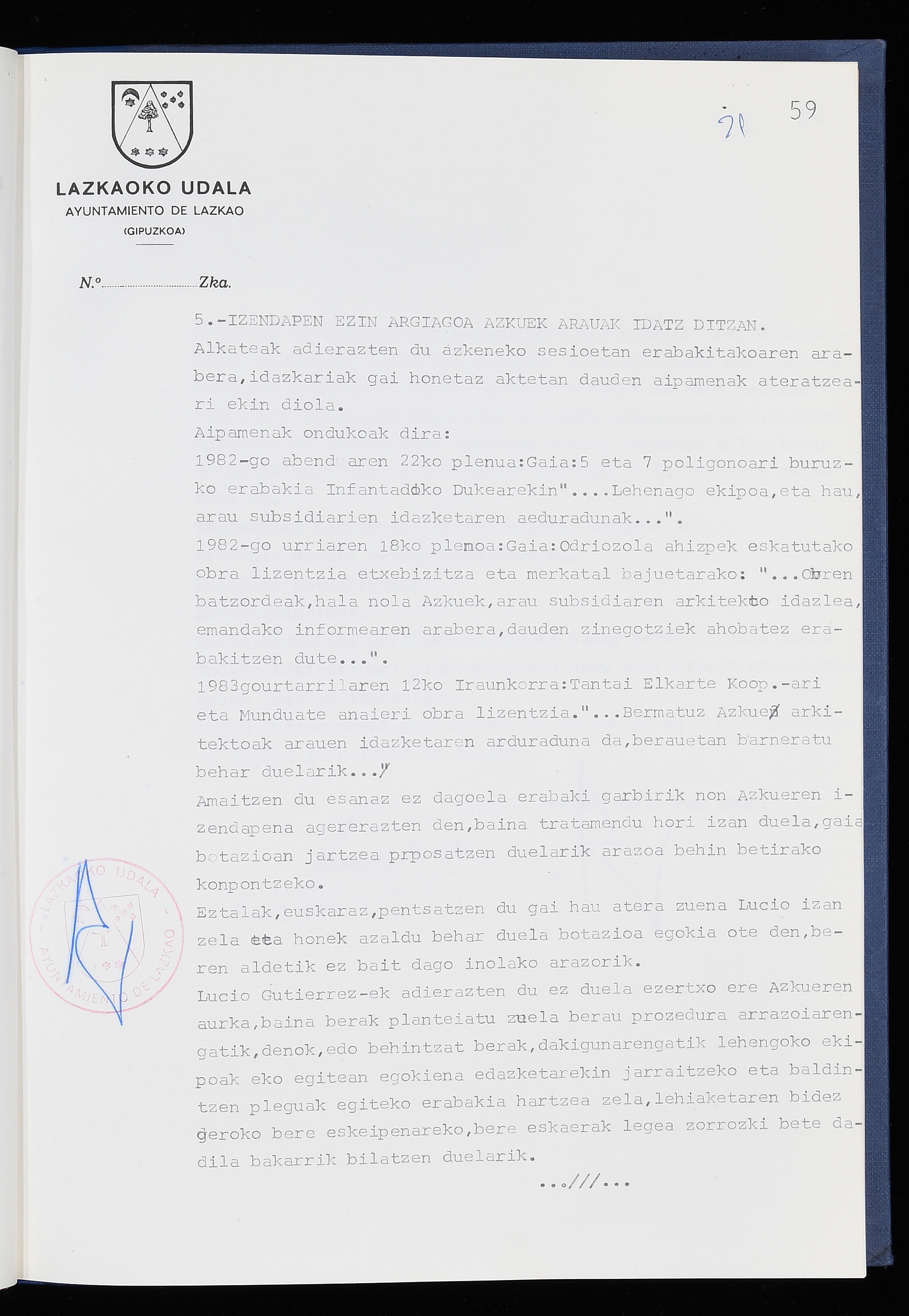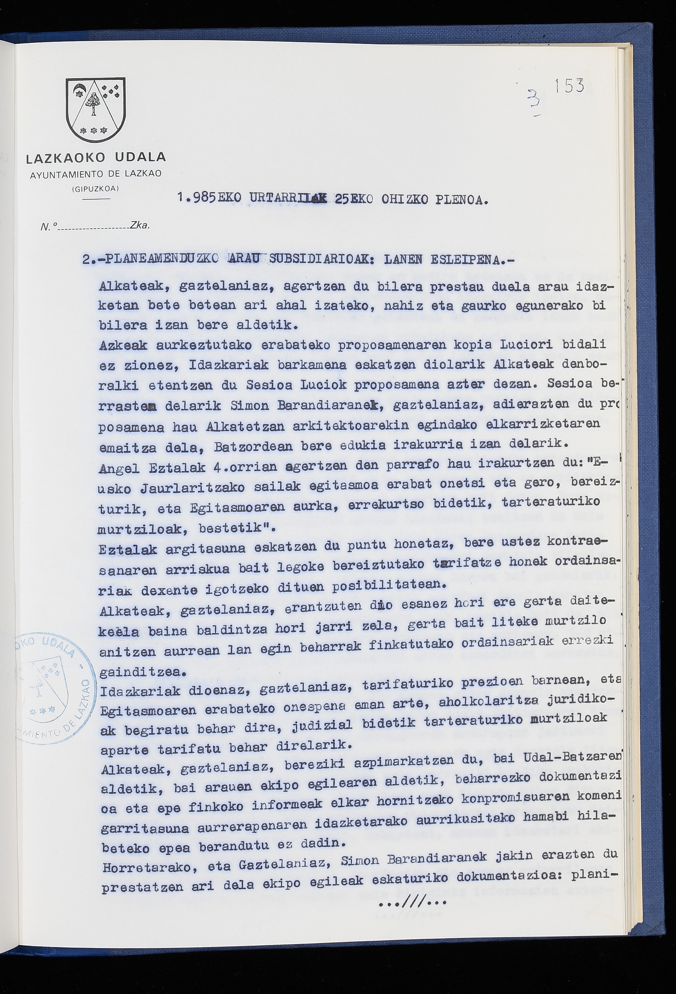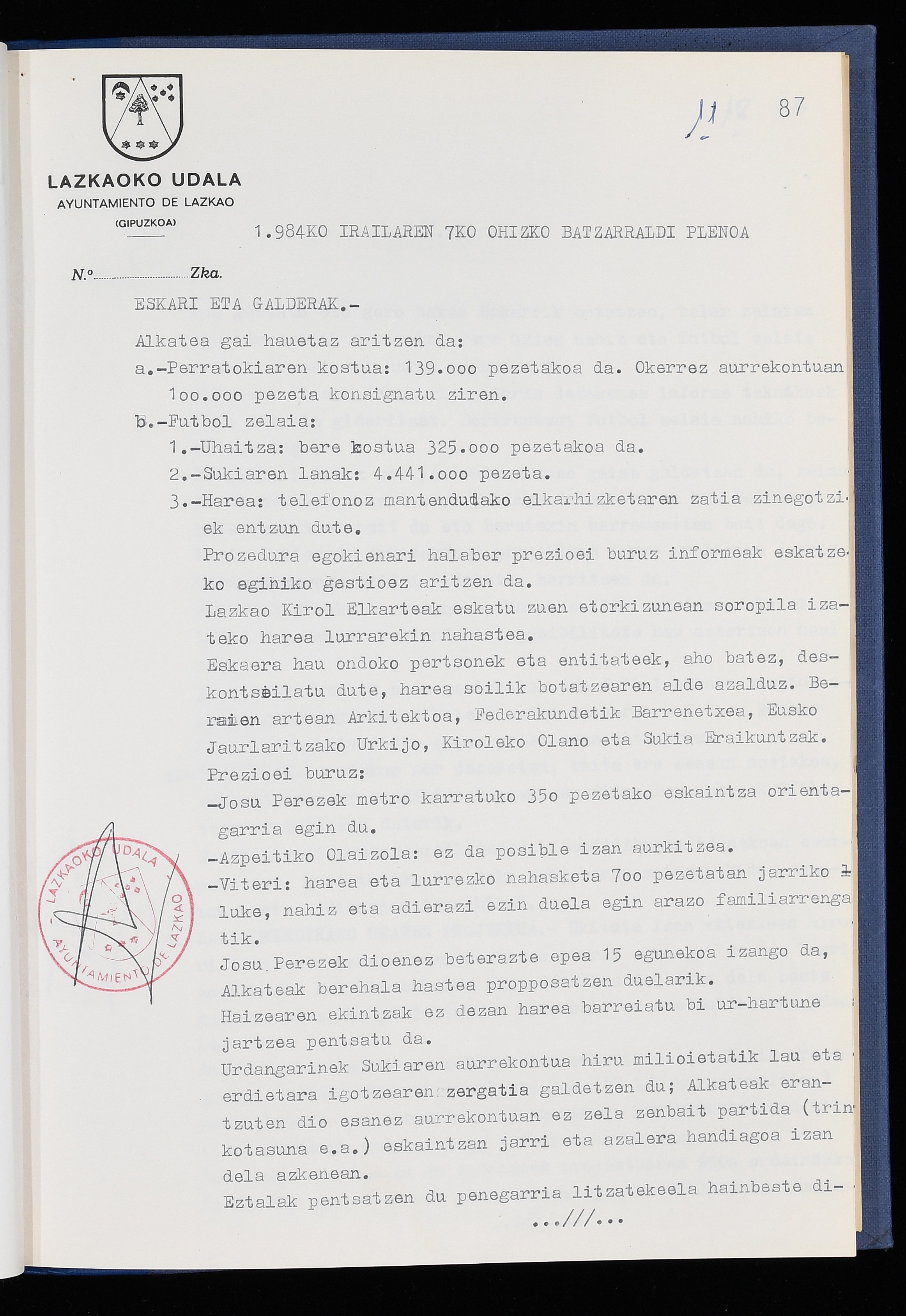 Log in to post commentsEdukiakSailkapenaFuntsaLazkaoko Udal ArtxiboaAtalakUdal AktakSailkapena1.1.4. Osoko Bilkuraren akta liburuakSailkapen berriaOsoko Bilkurako akta liburuakMultimediaIrudiakIdentifikazioaSignaturaakta liburua I-036Hasiera1984-06-01Amaiera1985-06-28AutoritateakTokiaLazkaoLog in to post commentsAkta eratu