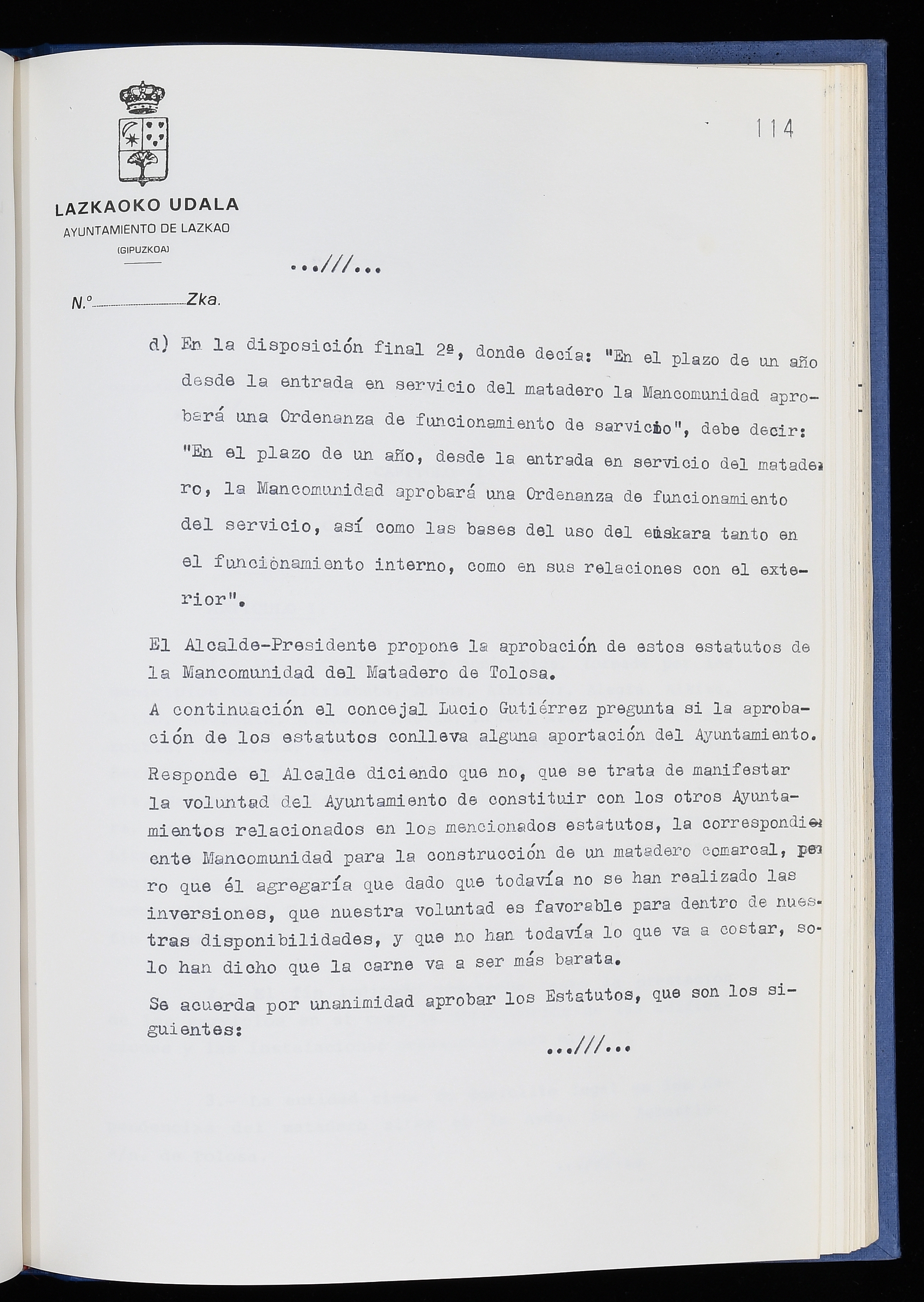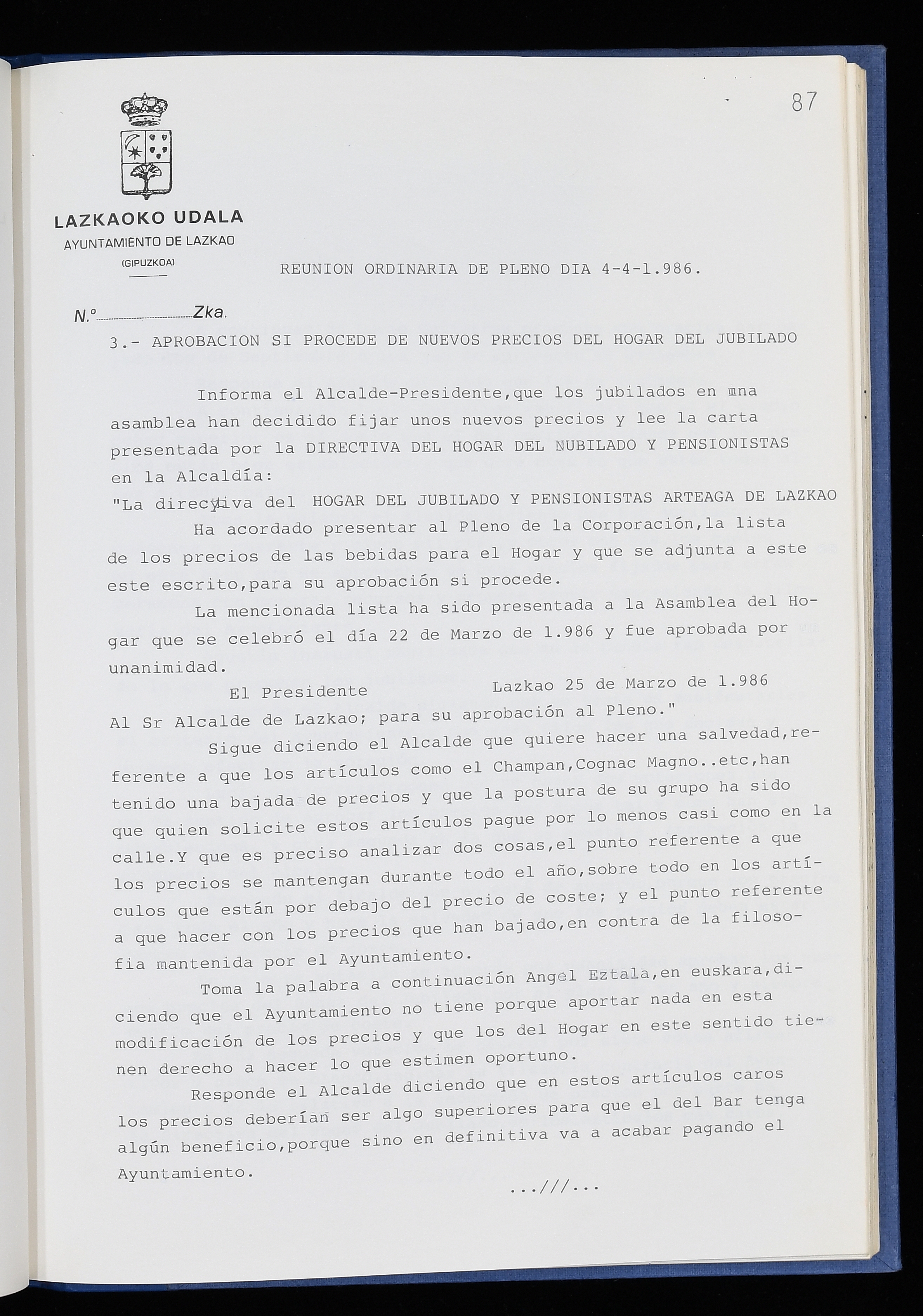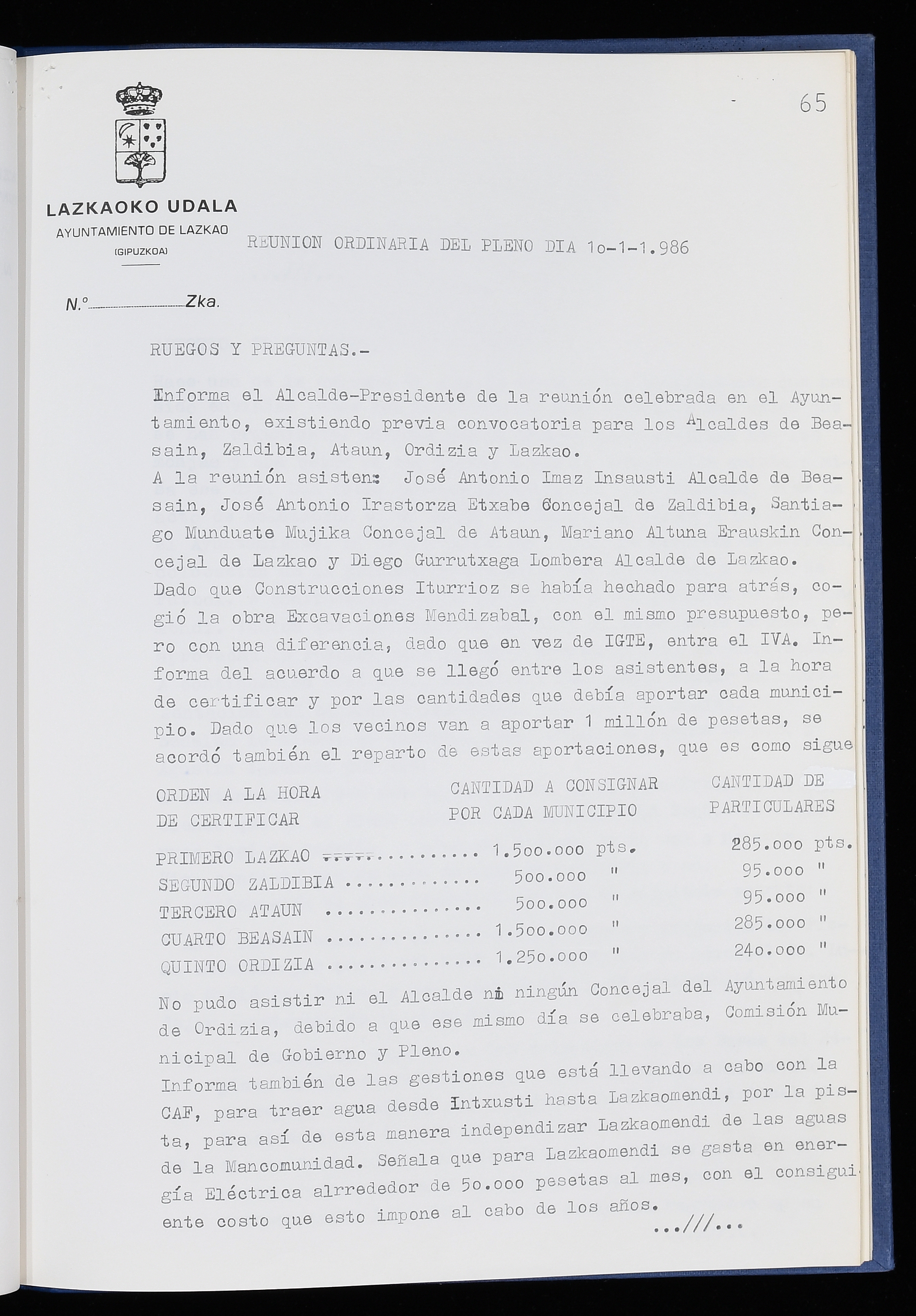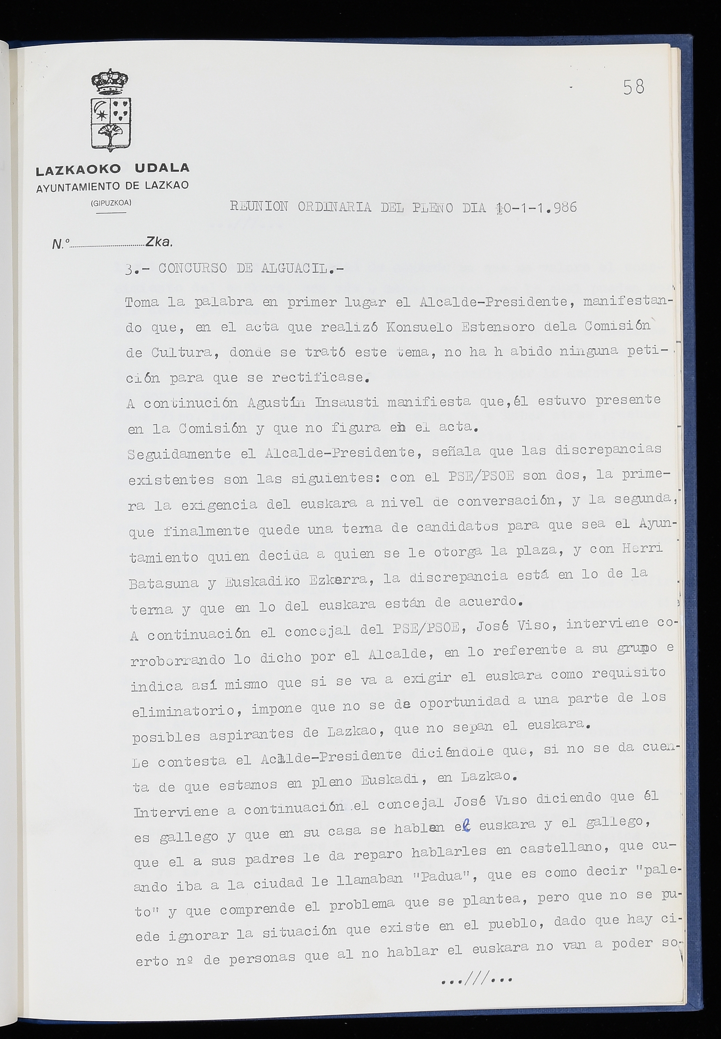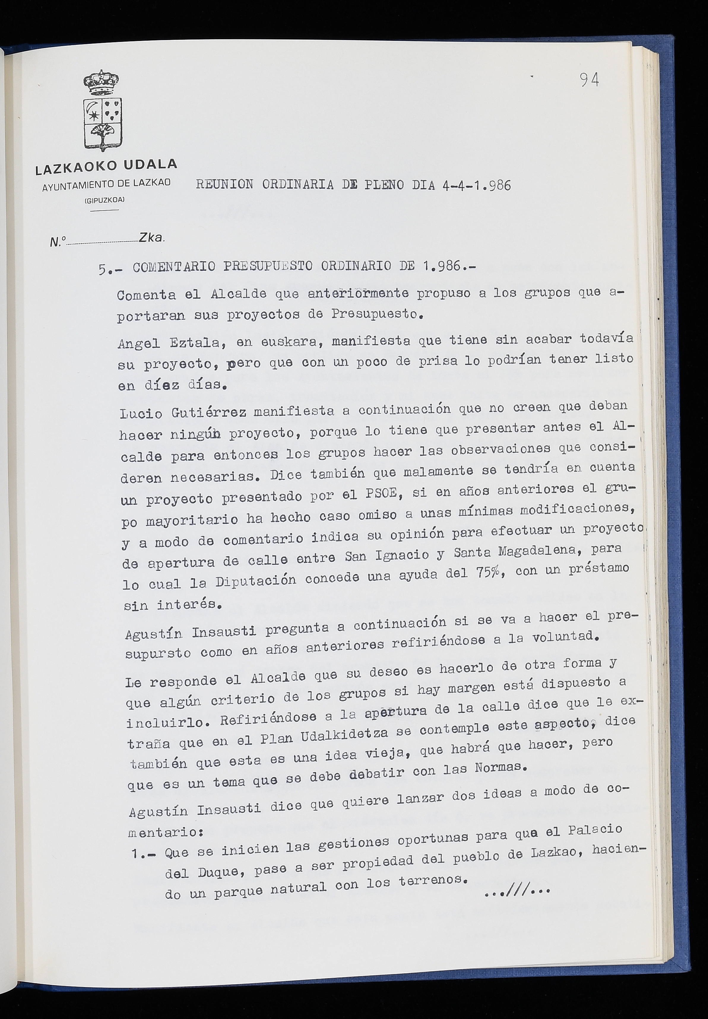 Log in to post commentsEdukiakSailkapenaFuntsaLazkaoko Udal ArtxiboaAtalakUdal AktakSailkapena1.1.4. Osoko Bilkuraren akta liburuakSailkapen berriaOsoko Bilkurako akta liburuakMultimediaIrudiakIdentifikazioaSignaturaakta liburua I-039Hasiera1985-07-22Amaiera1986-06-13AutoritateakTokiaLazkaoLog in to post commentsAkta eratu