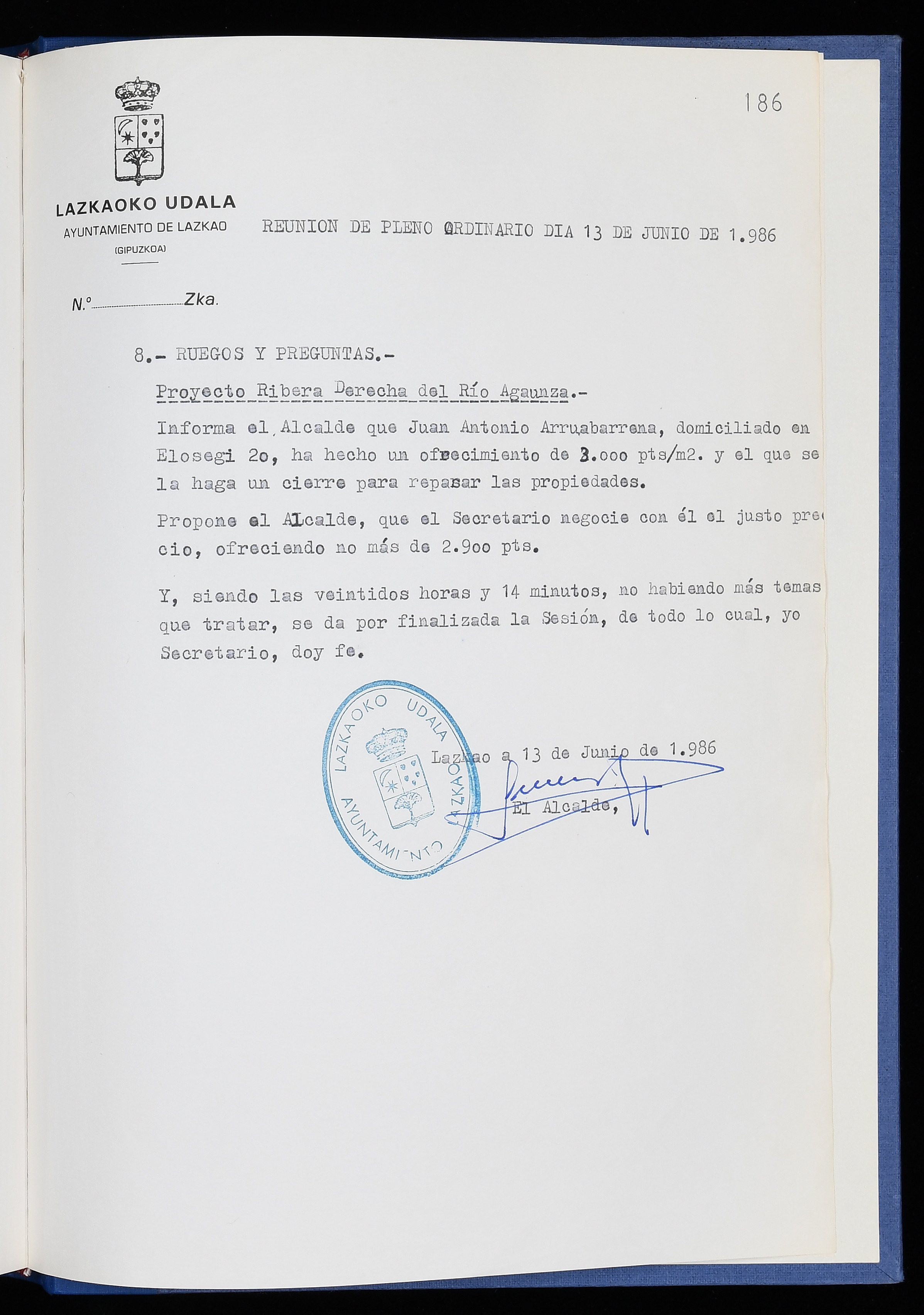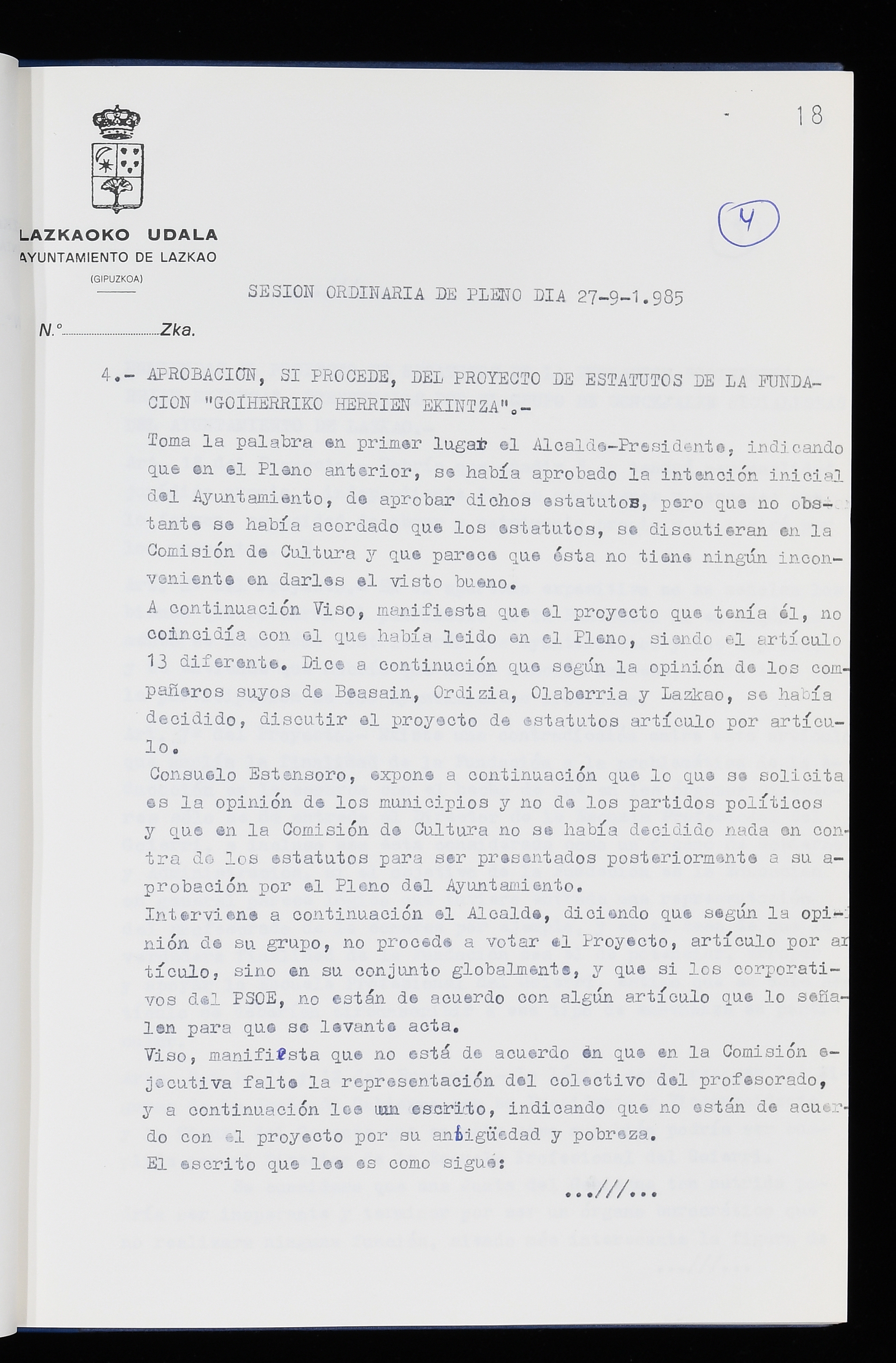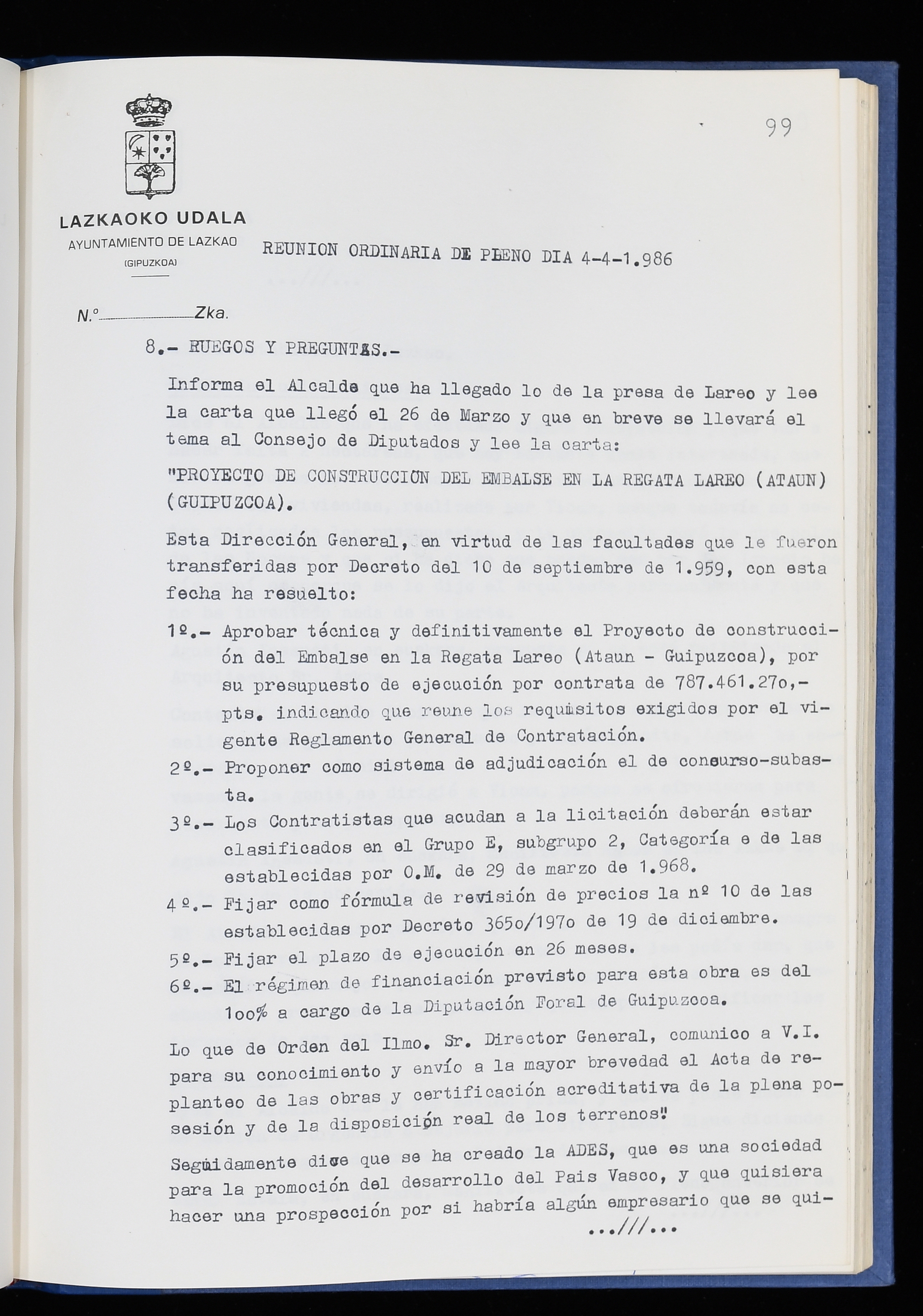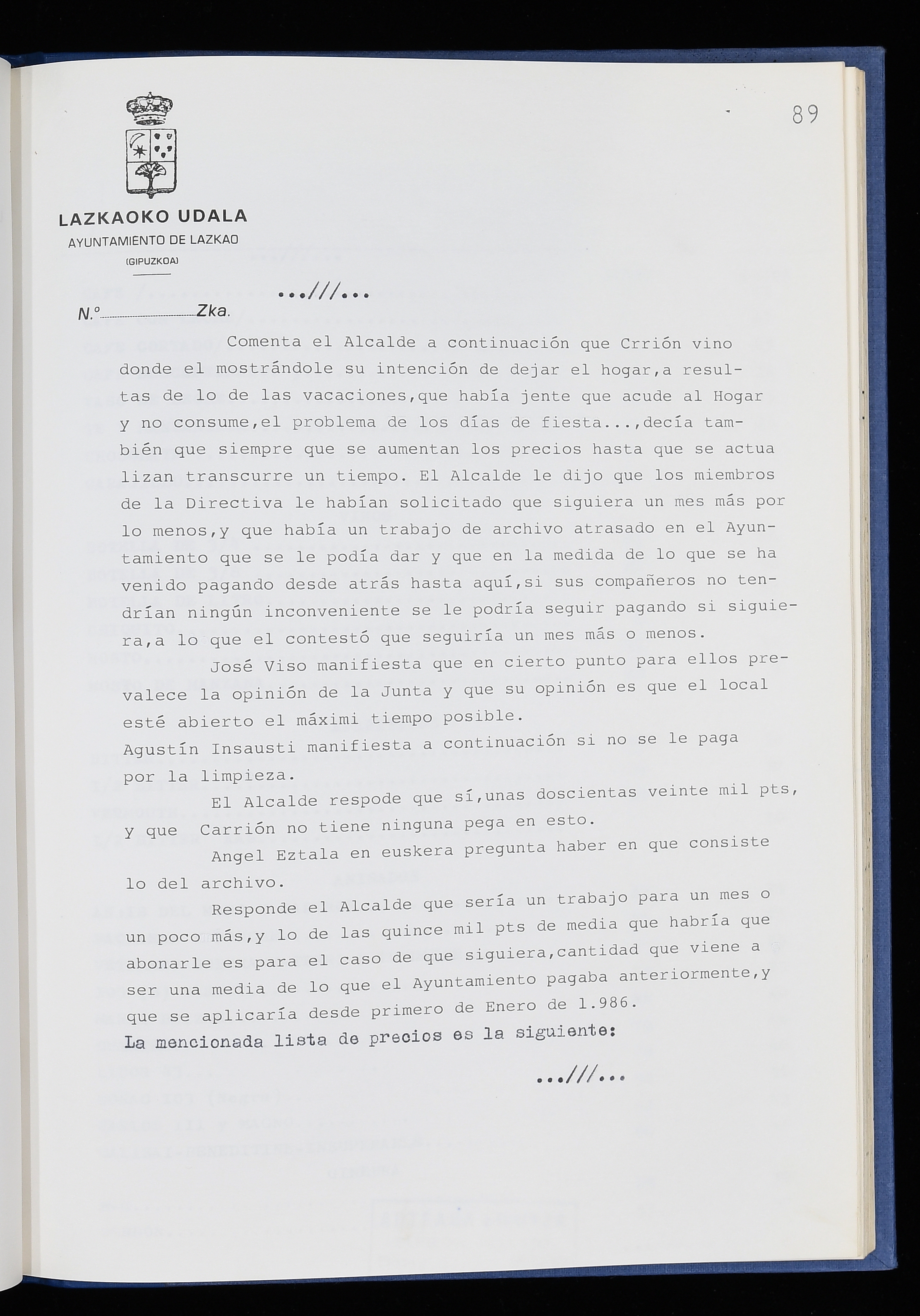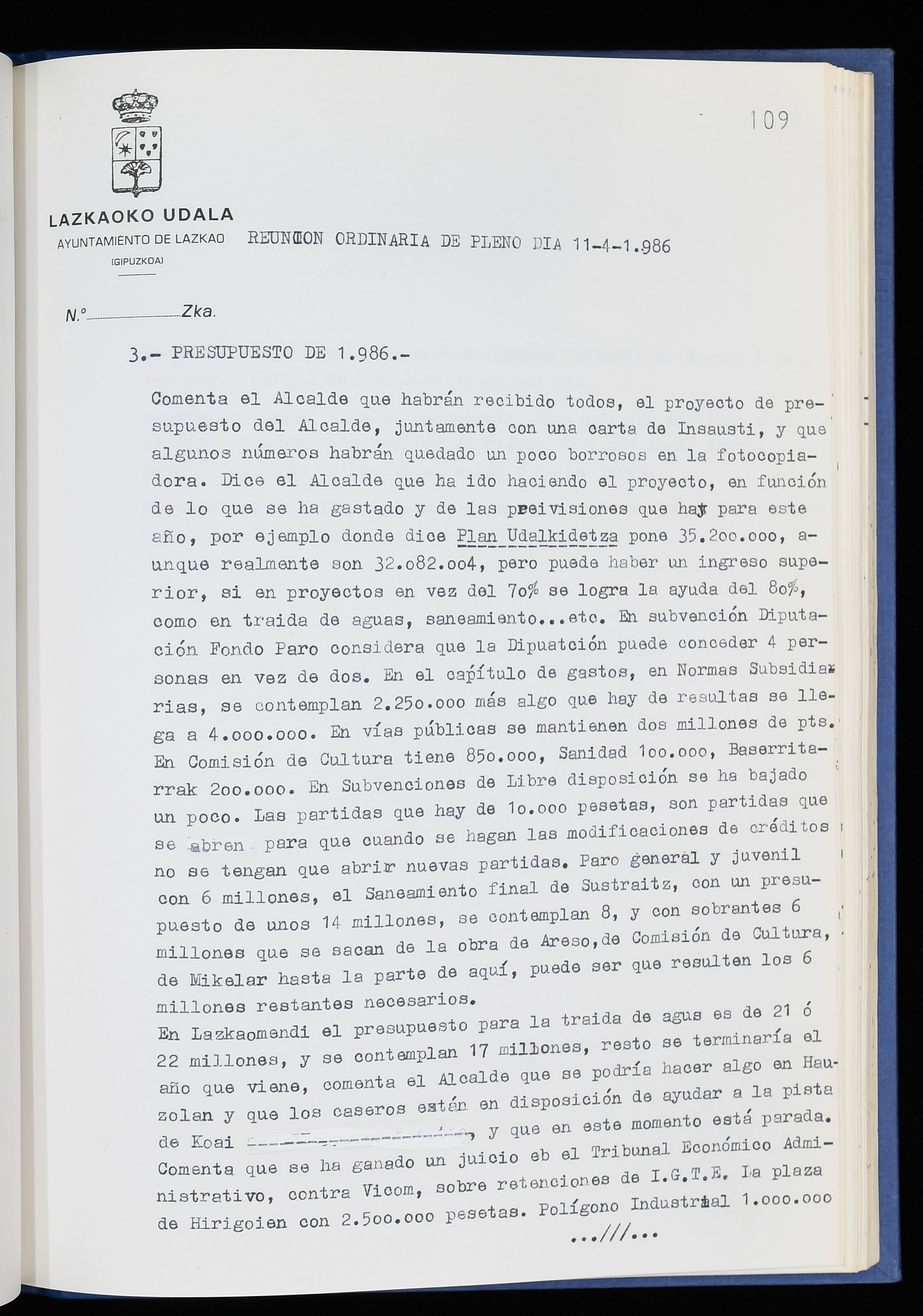 Log in to post commentsEdukiakSailkapenaFuntsaLazkaoko Udal ArtxiboaAtalakUdal AktakSailkapena1.1.4. Osoko Bilkuraren akta liburuakSailkapen berriaOsoko Bilkurako akta liburuakMultimediaIrudiakIdentifikazioaSignaturaakta liburua I-039Hasiera1985-07-22Amaiera1986-06-13AutoritateakTokiaLazkaoLog in to post commentsAkta eratu