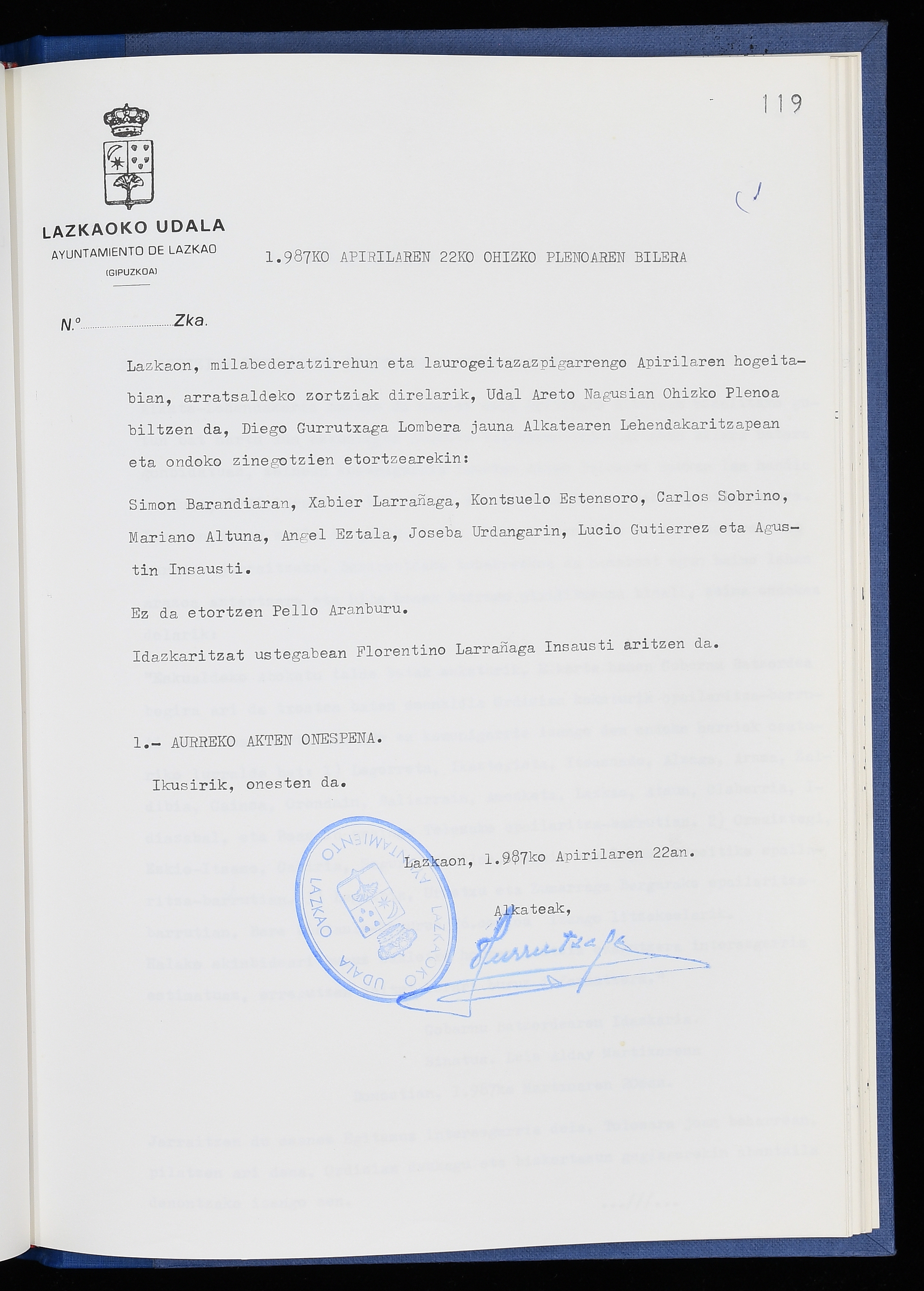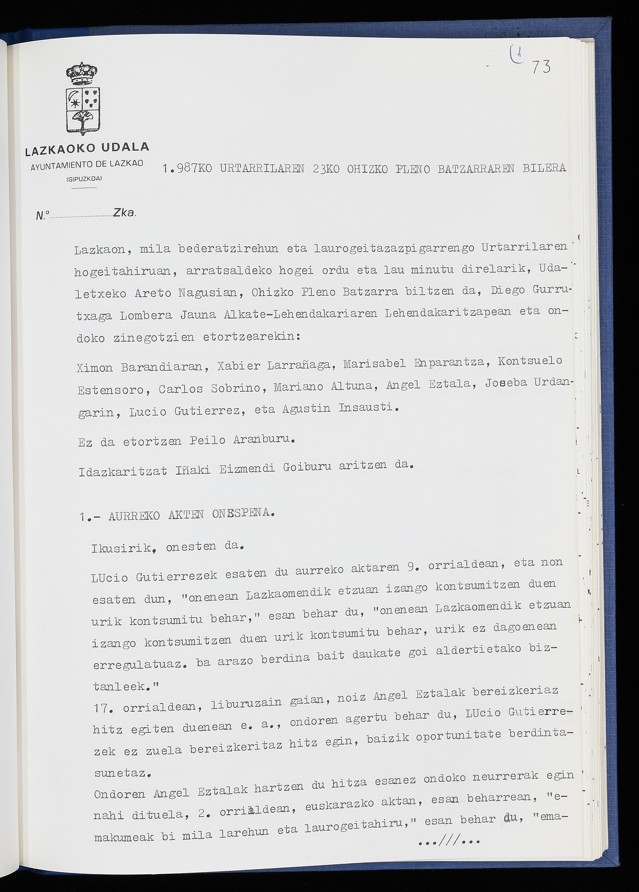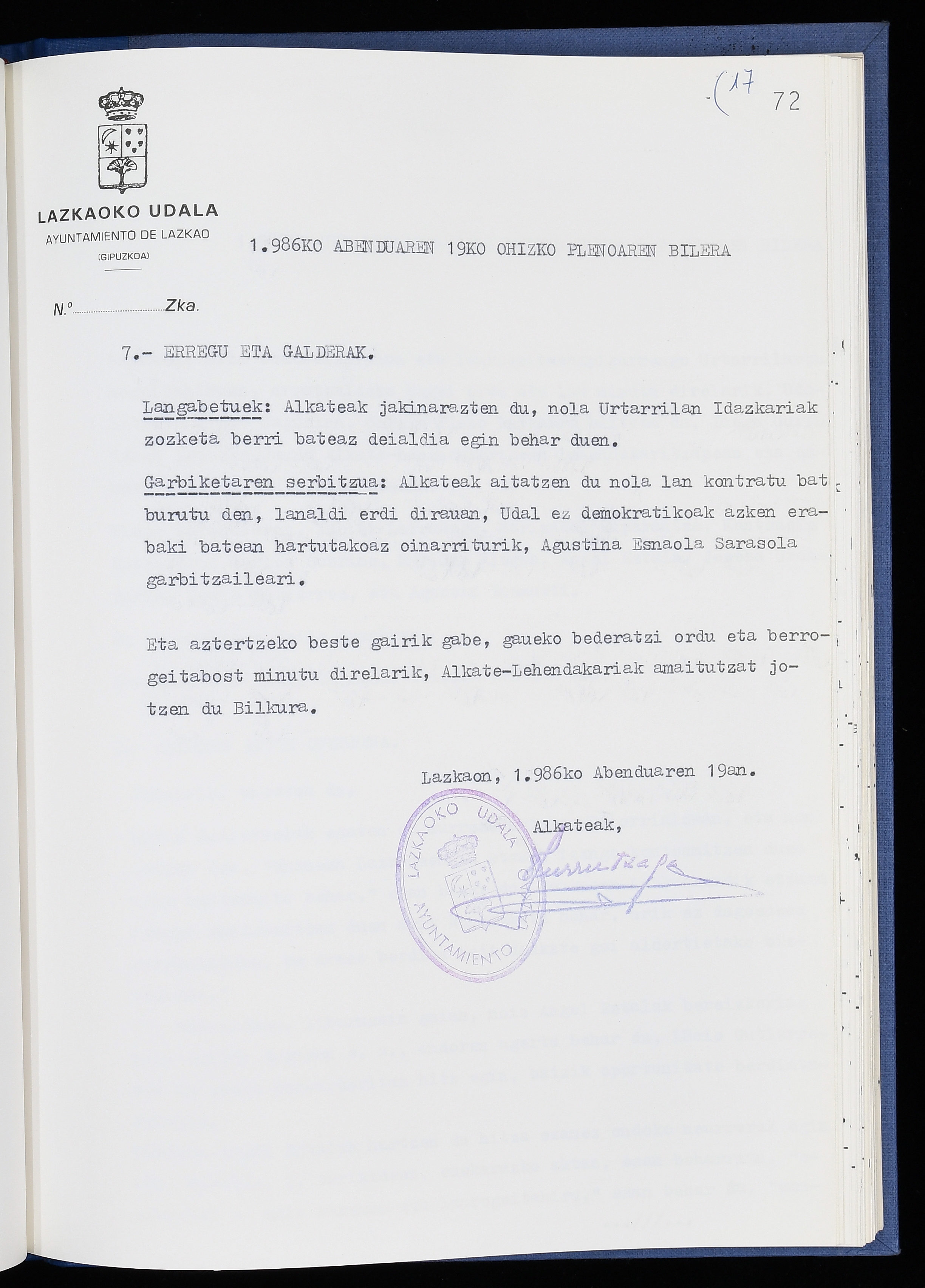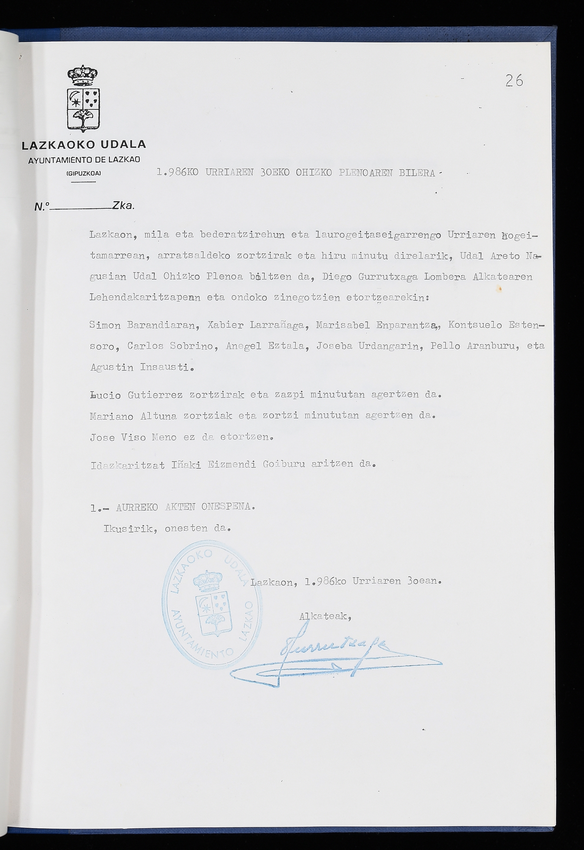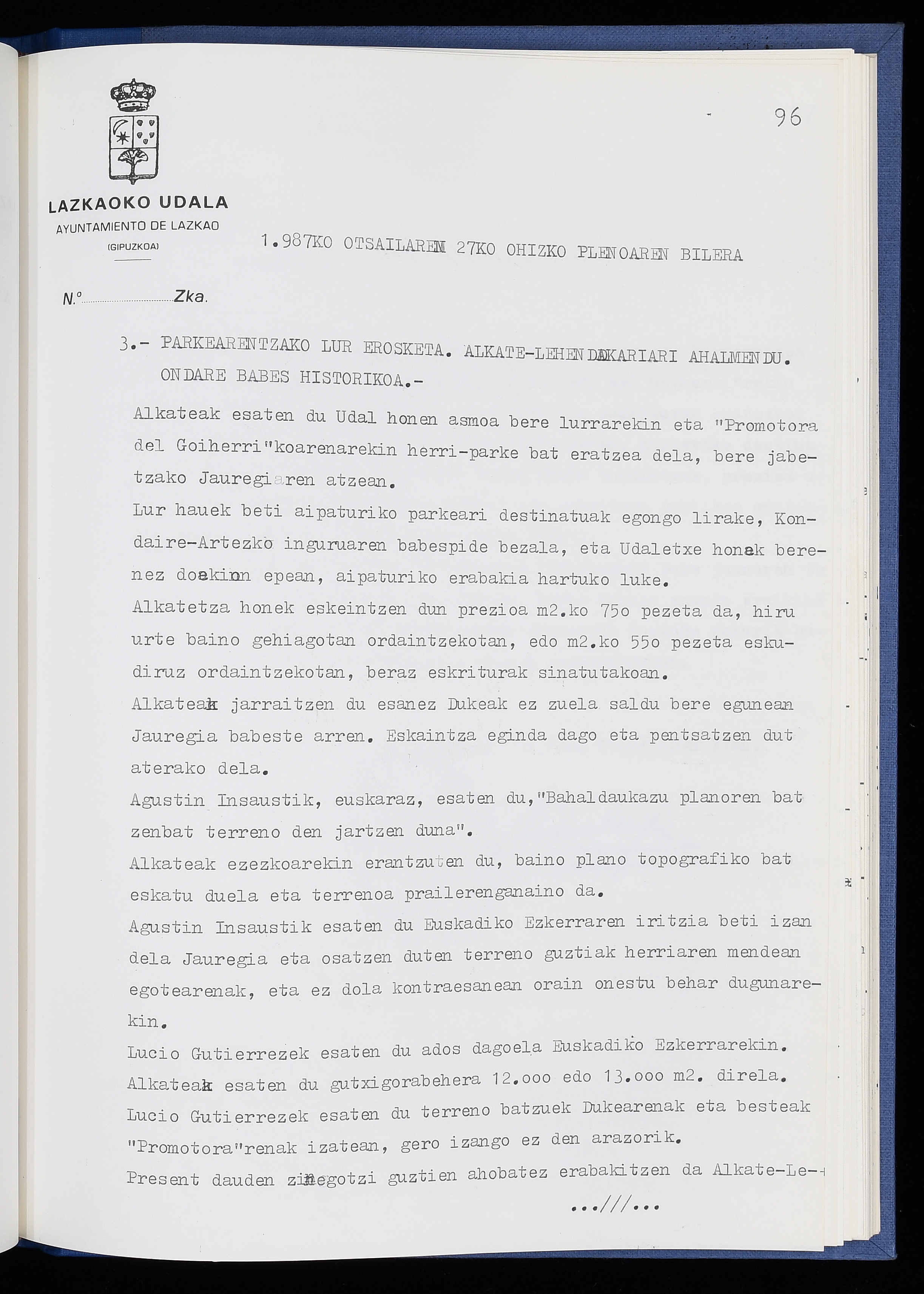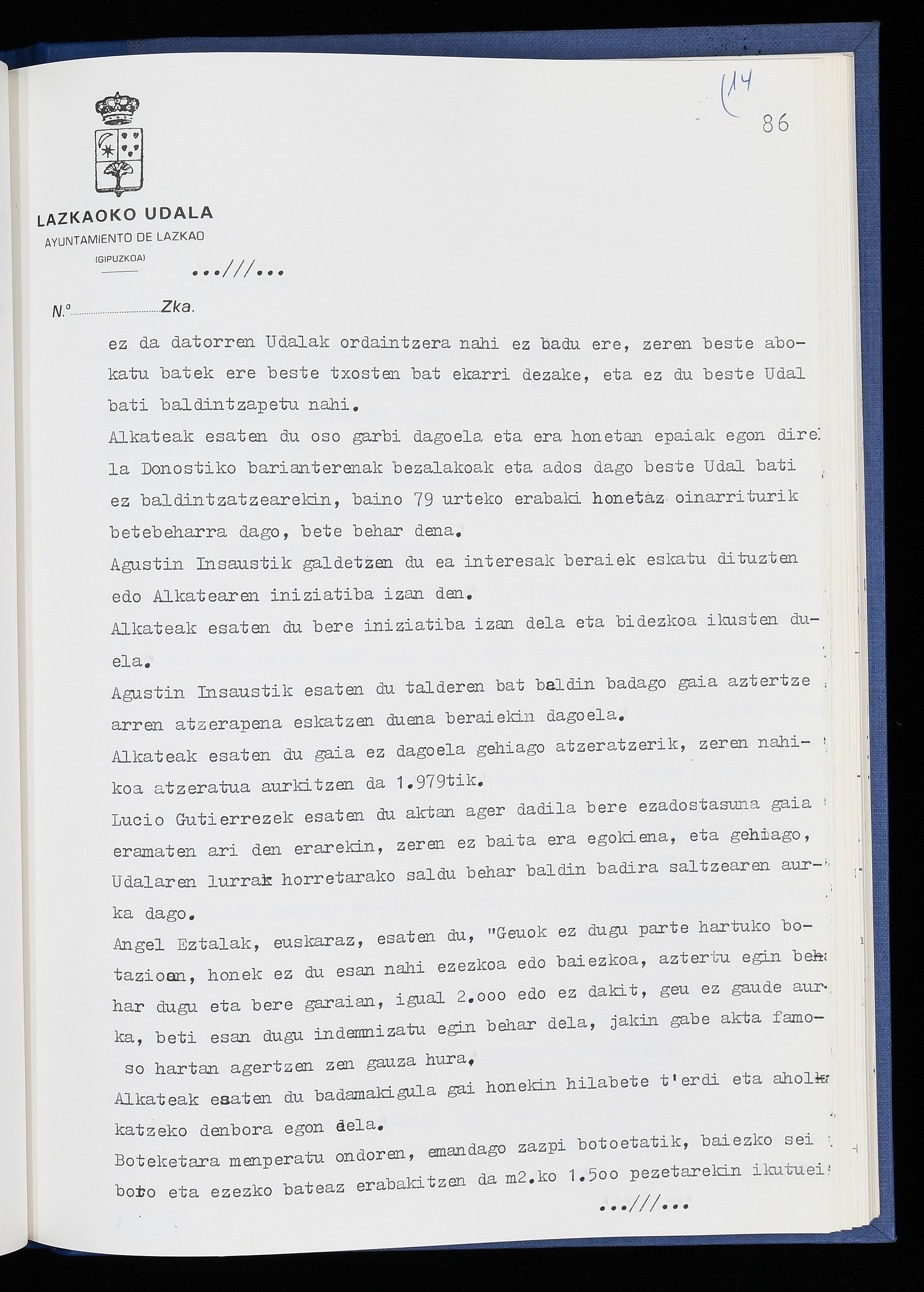Log in to post commentsEdukiakSailkapenaFuntsaLazkaoko Udal ArtxiboaAtalakUdal AktakSailkapena1.1.4. Osoko Bilkuraren akta liburuakSailkapen berriaOsoko Bilkurako akta liburuakMultimediaIrudiakIdentifikazioaSignaturaakta liburua I-040Hasiera1986-07-18Amaiera1987-06-30AutoritateakTokiaLazkaoLog in to post commentsAkta eratu