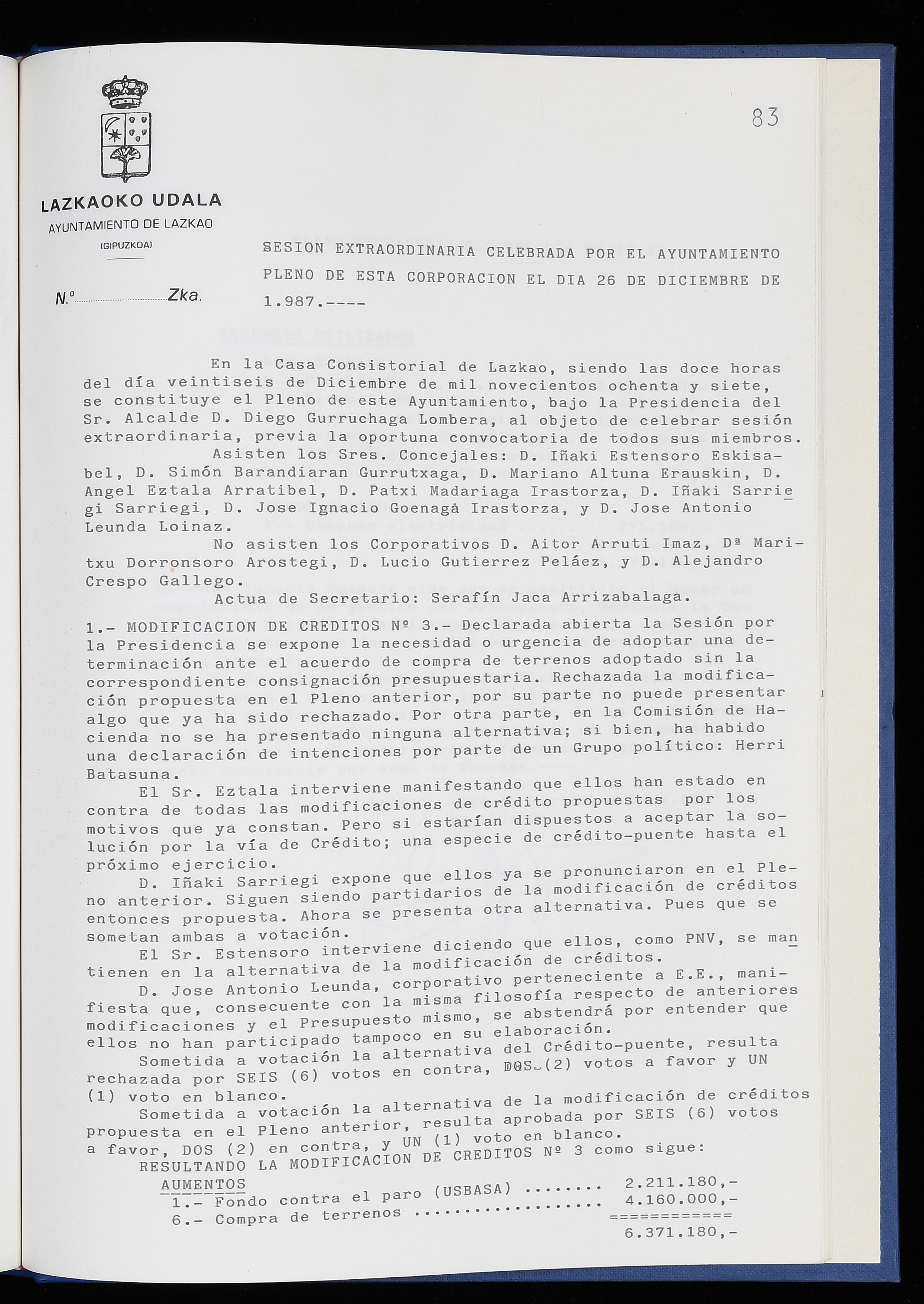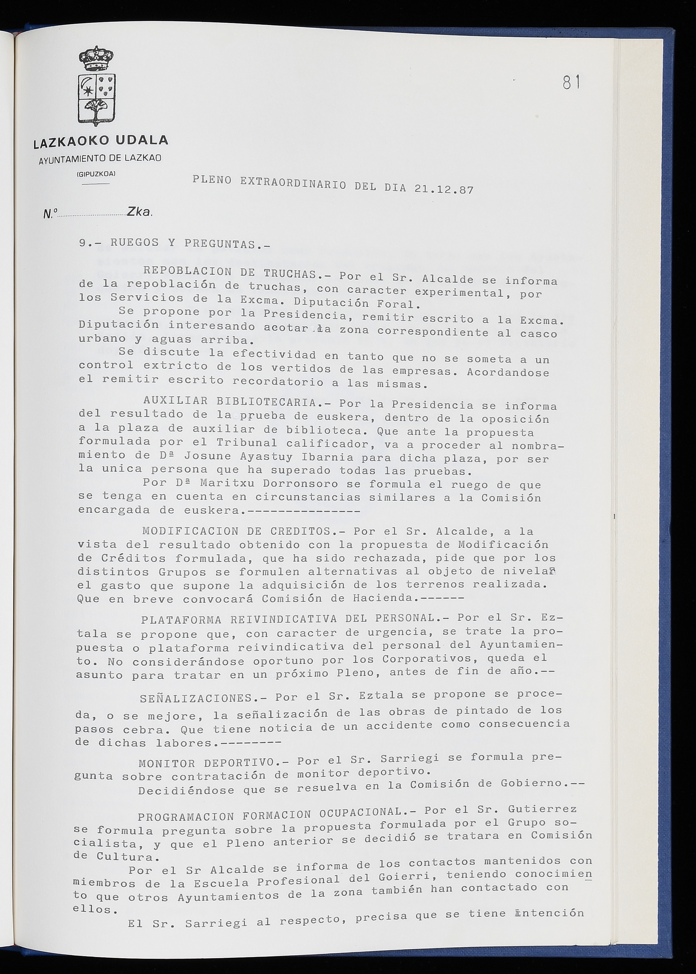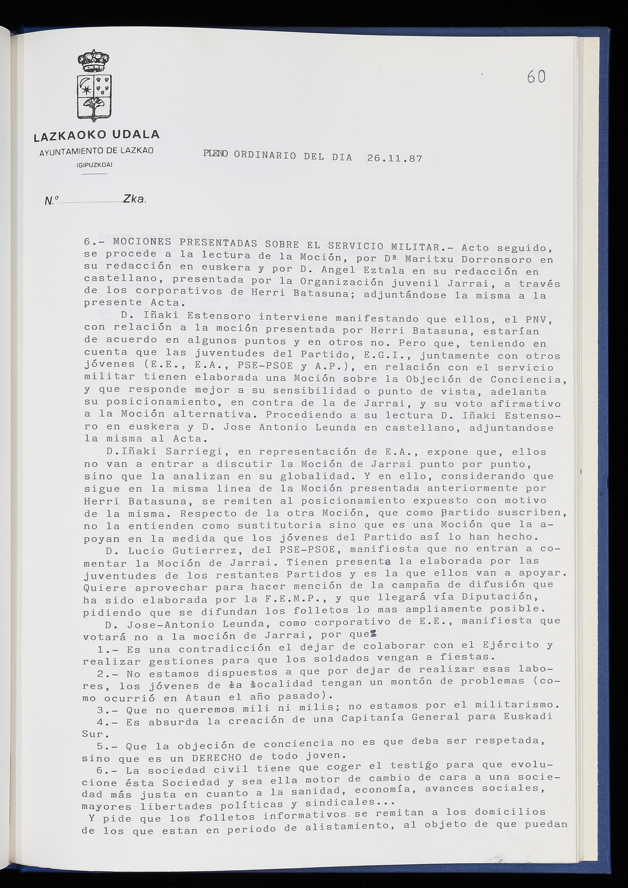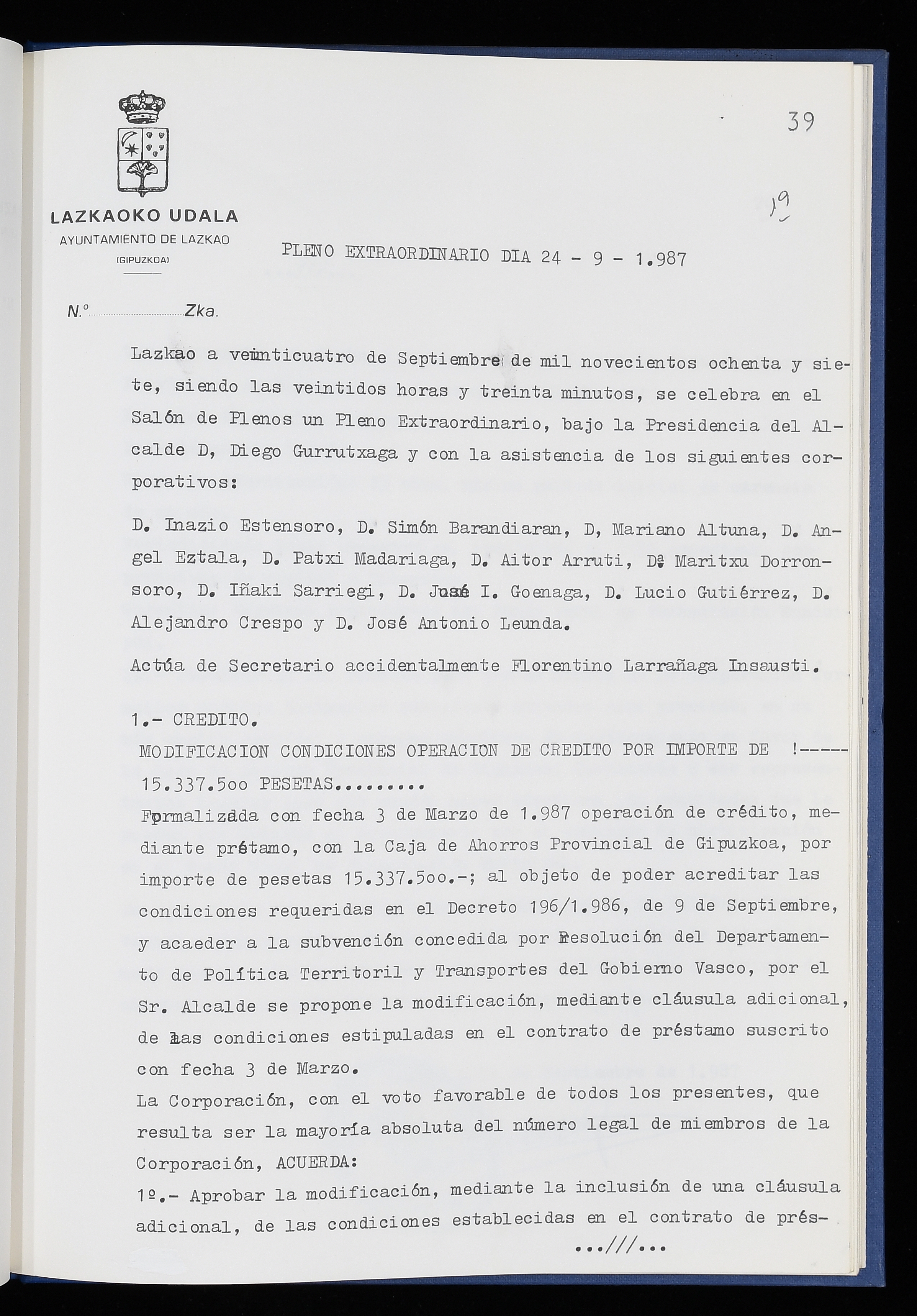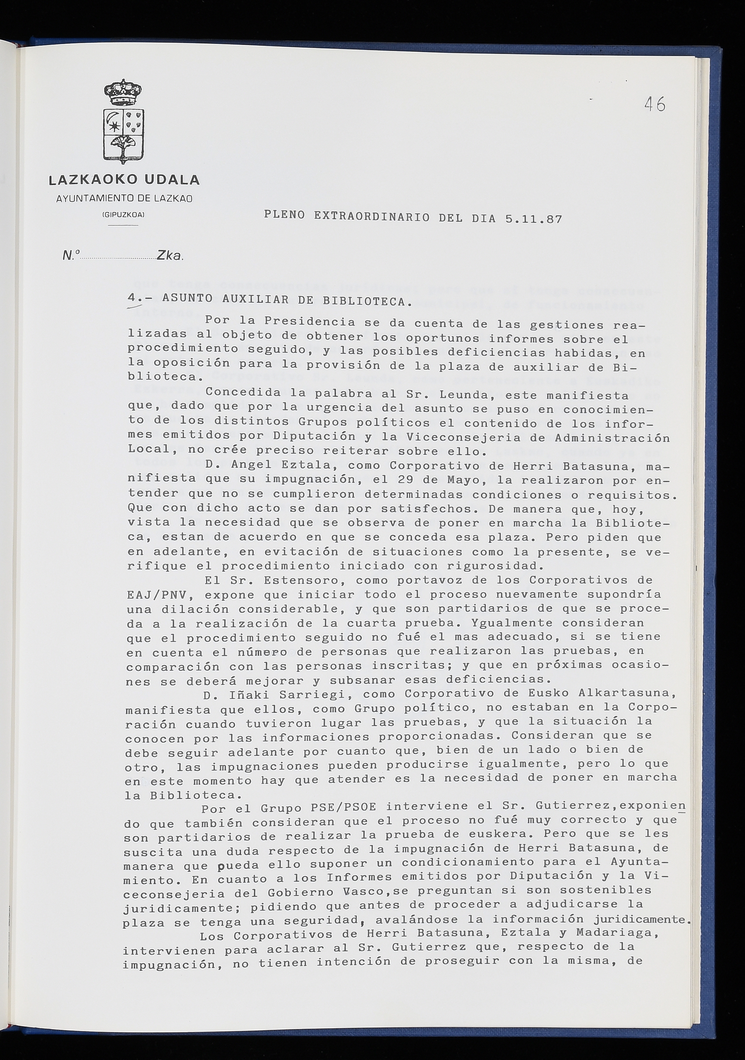 Log in to post commentsEdukiakSailkapenaFuntsaLazkaoko Udal ArtxiboaAtalakUdal AktakSailkapena1.1.4. Osoko Bilkuraren akta liburuakSailkapen berriaOsoko Bilkurako akta liburuakMultimediaIrudiakIdentifikazioaSignaturaakta liburua I-043Hasiera1987-07-23Amaiera1987-12-30AutoritateakTokiaLazkaoLog in to post commentsAkta eratu