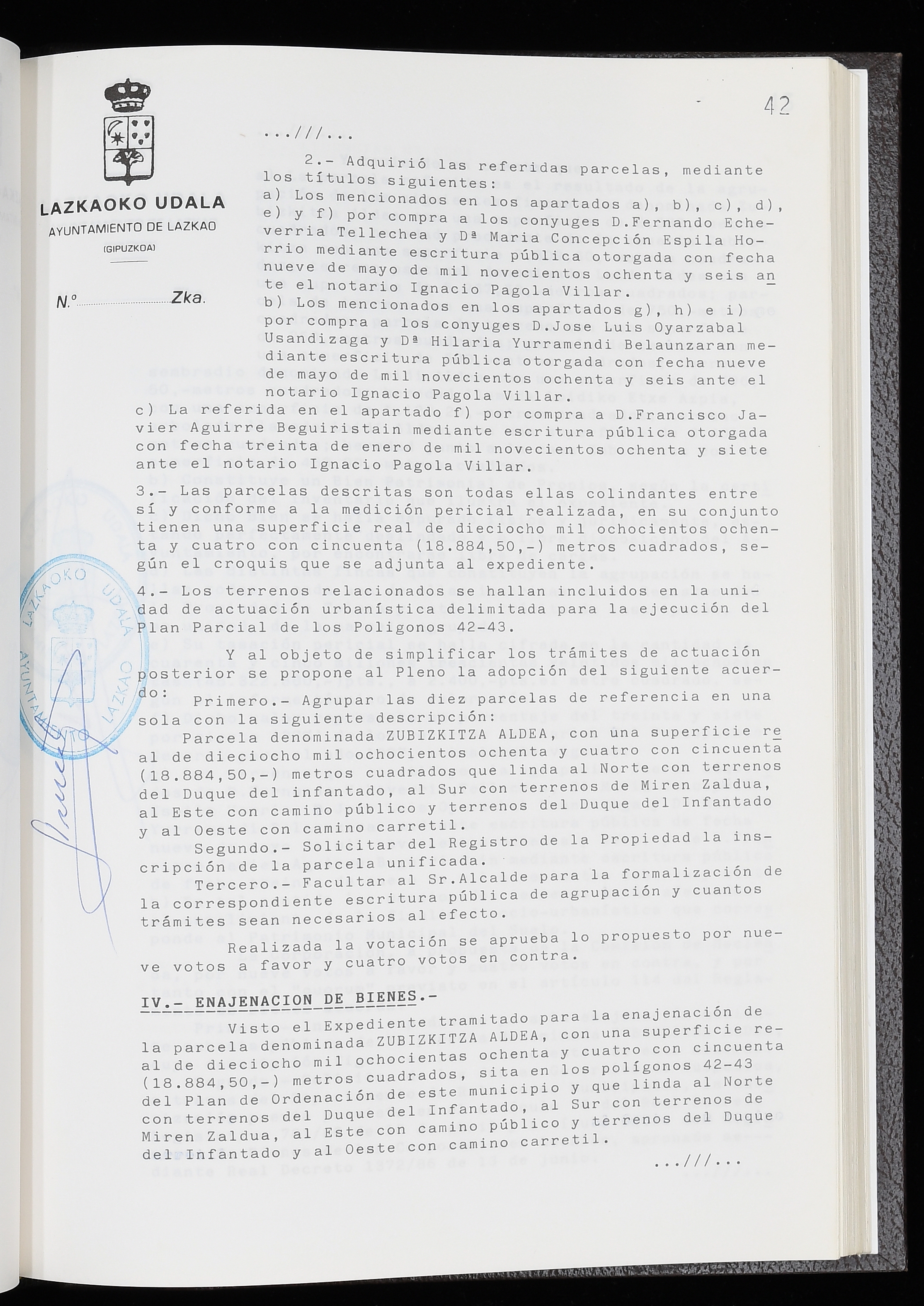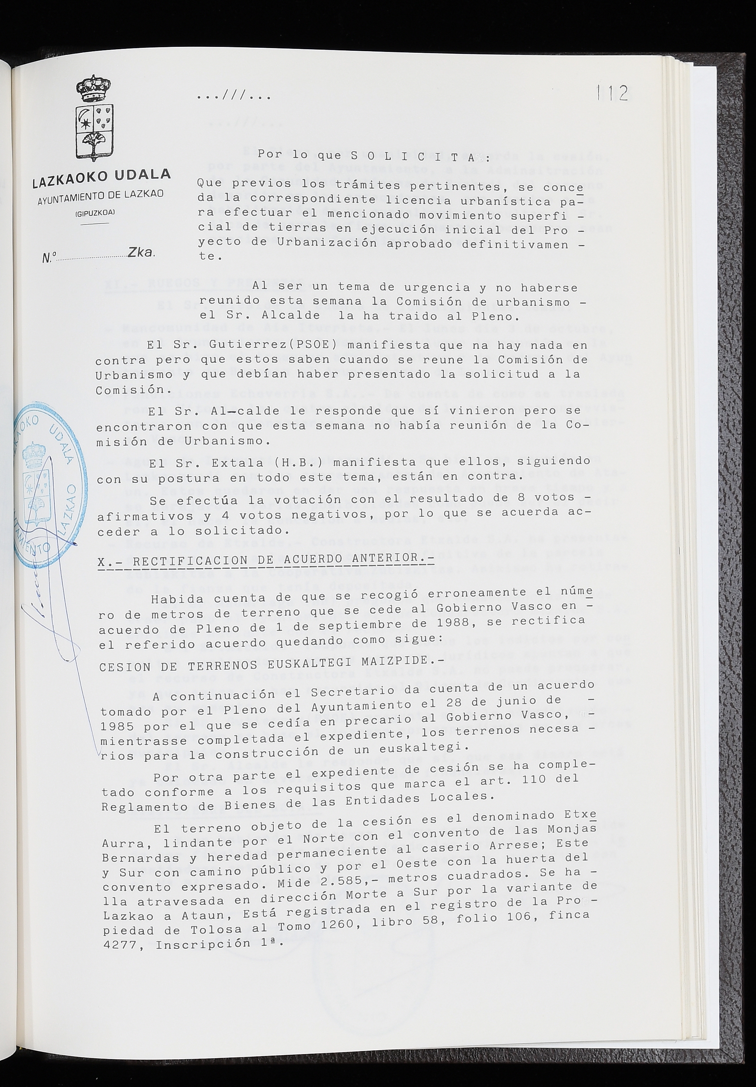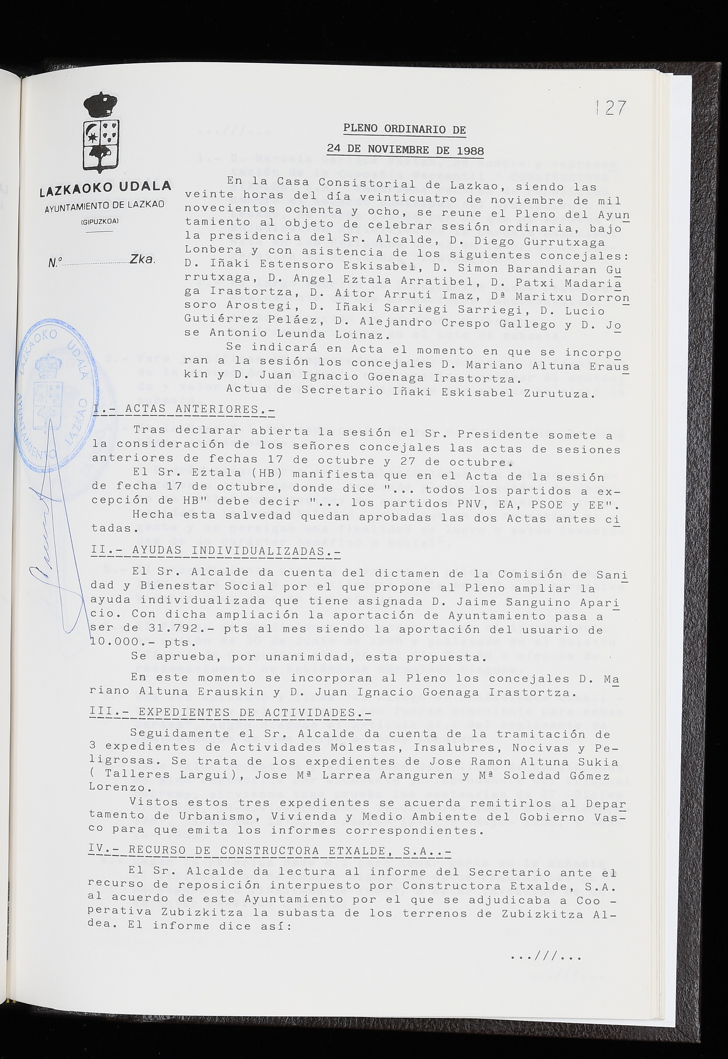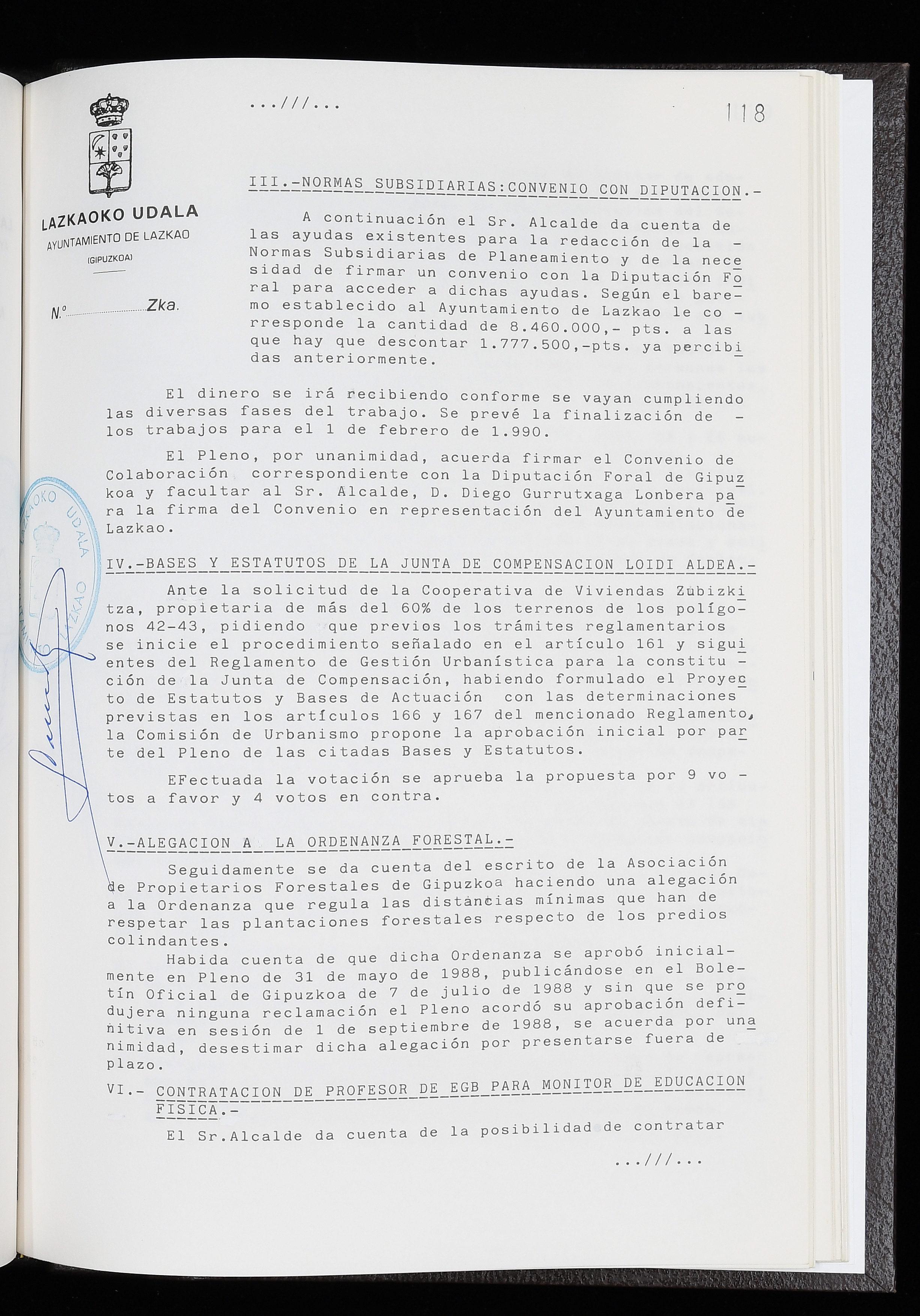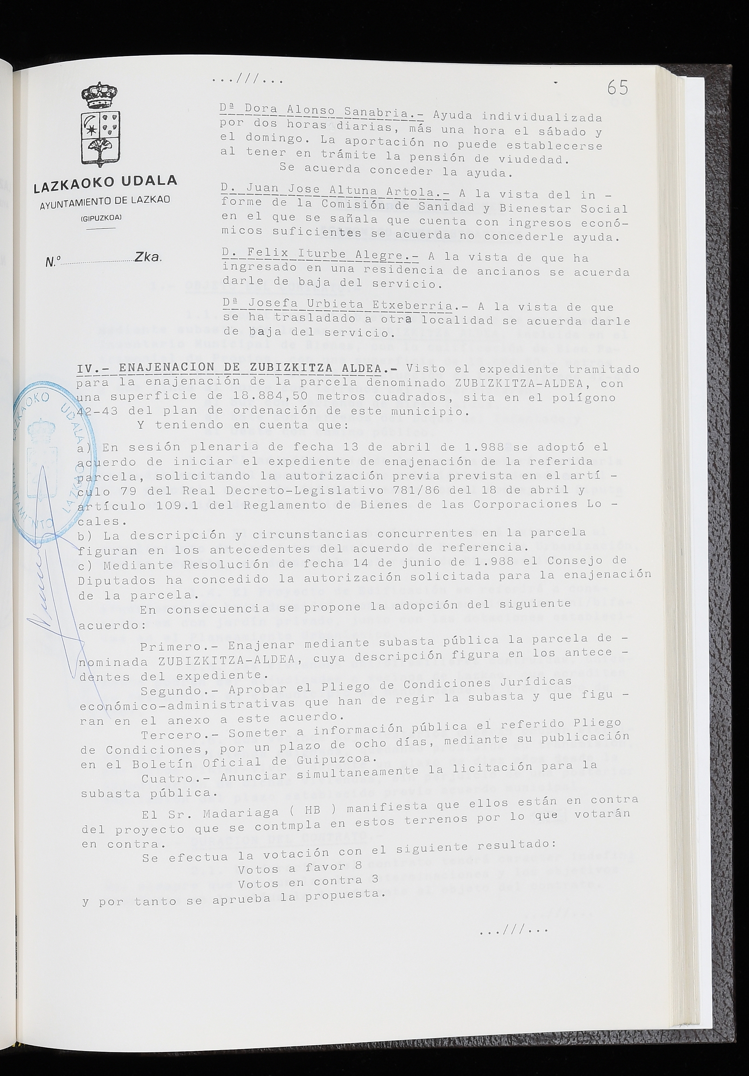 Log in to post commentsEdukiakSailkapenaFuntsaLazkaoko Udal ArtxiboaAtalakUdal AktakSailkapena1.1.4. Osoko Bilkuraren akta liburuakSailkapen berriaOsoko Bilkurako akta liburuakMultimediaIrudiakIdentifikazioaSignaturaakta liburua I-045Hasiera1988-01-28Amaiera1988-12-22AutoritateakTokiaLazkaoLog in to post commentsAkta eratu