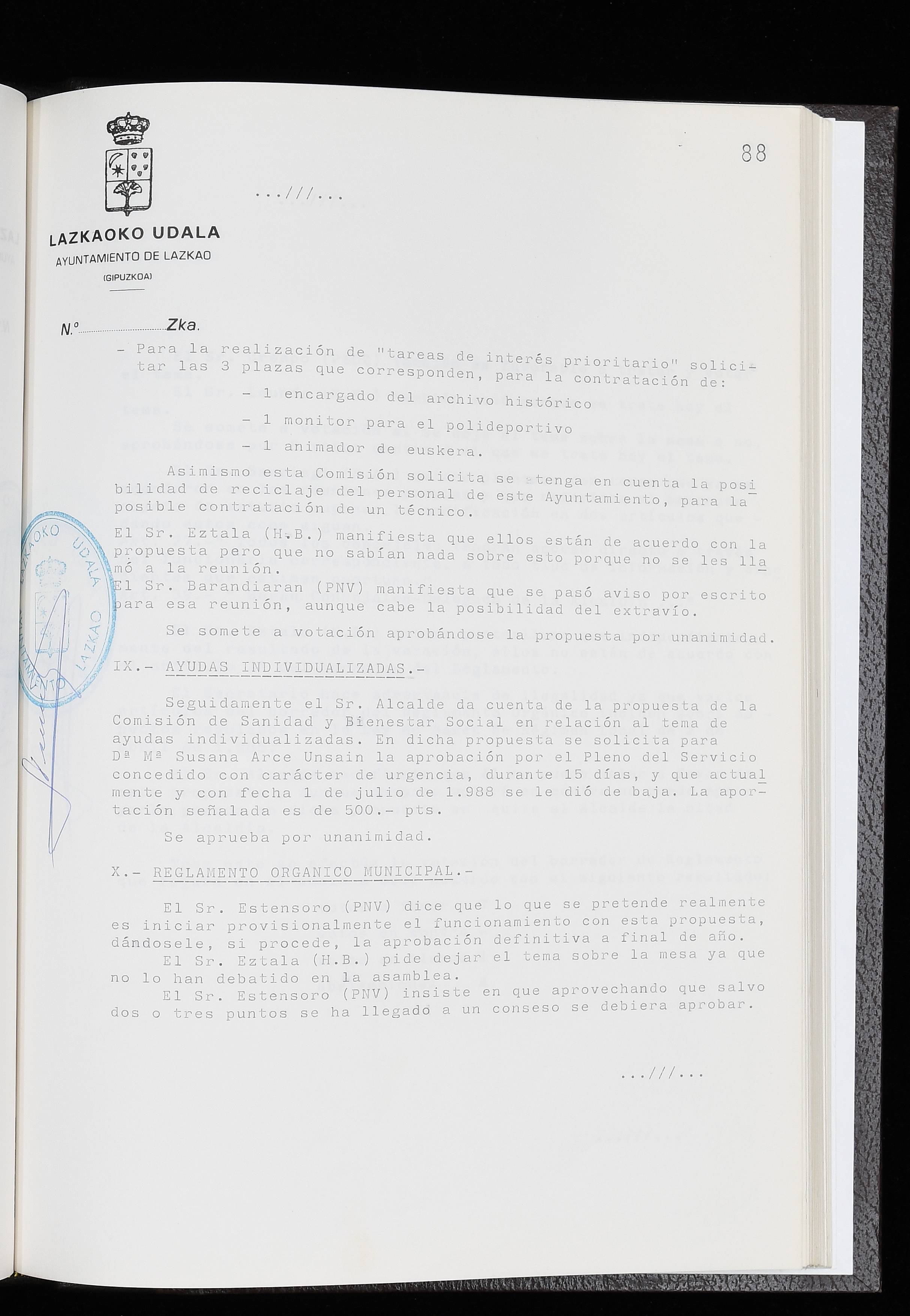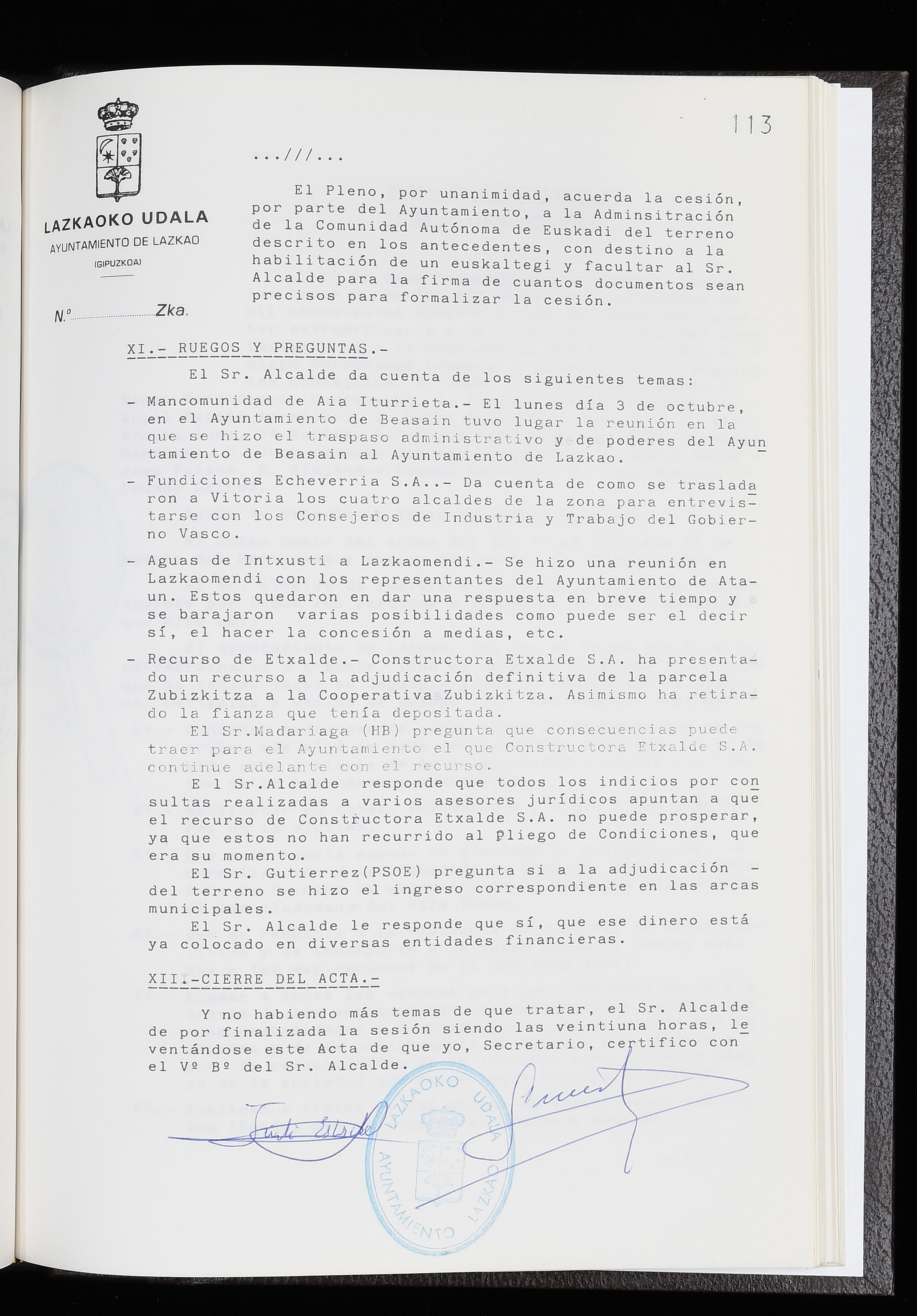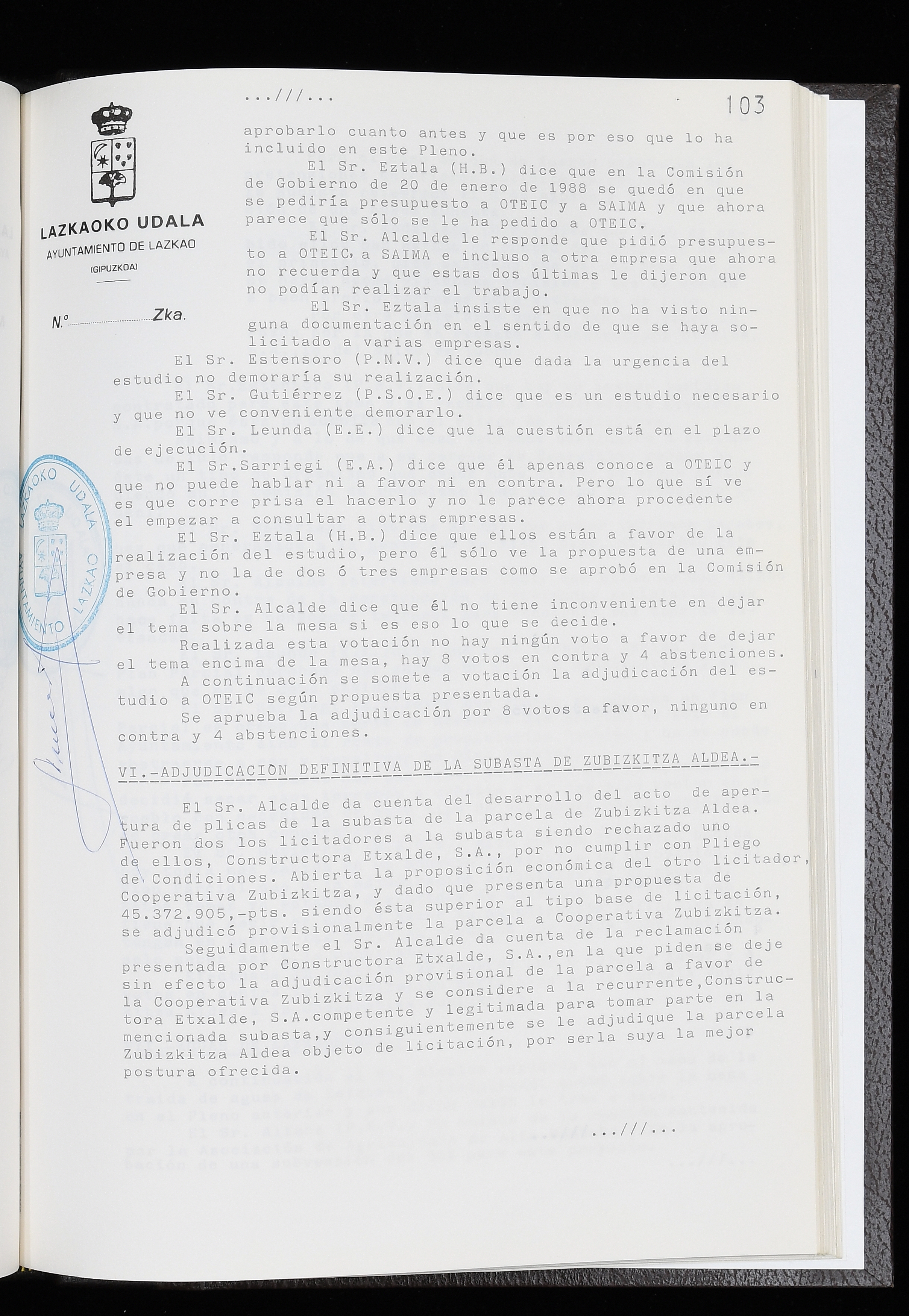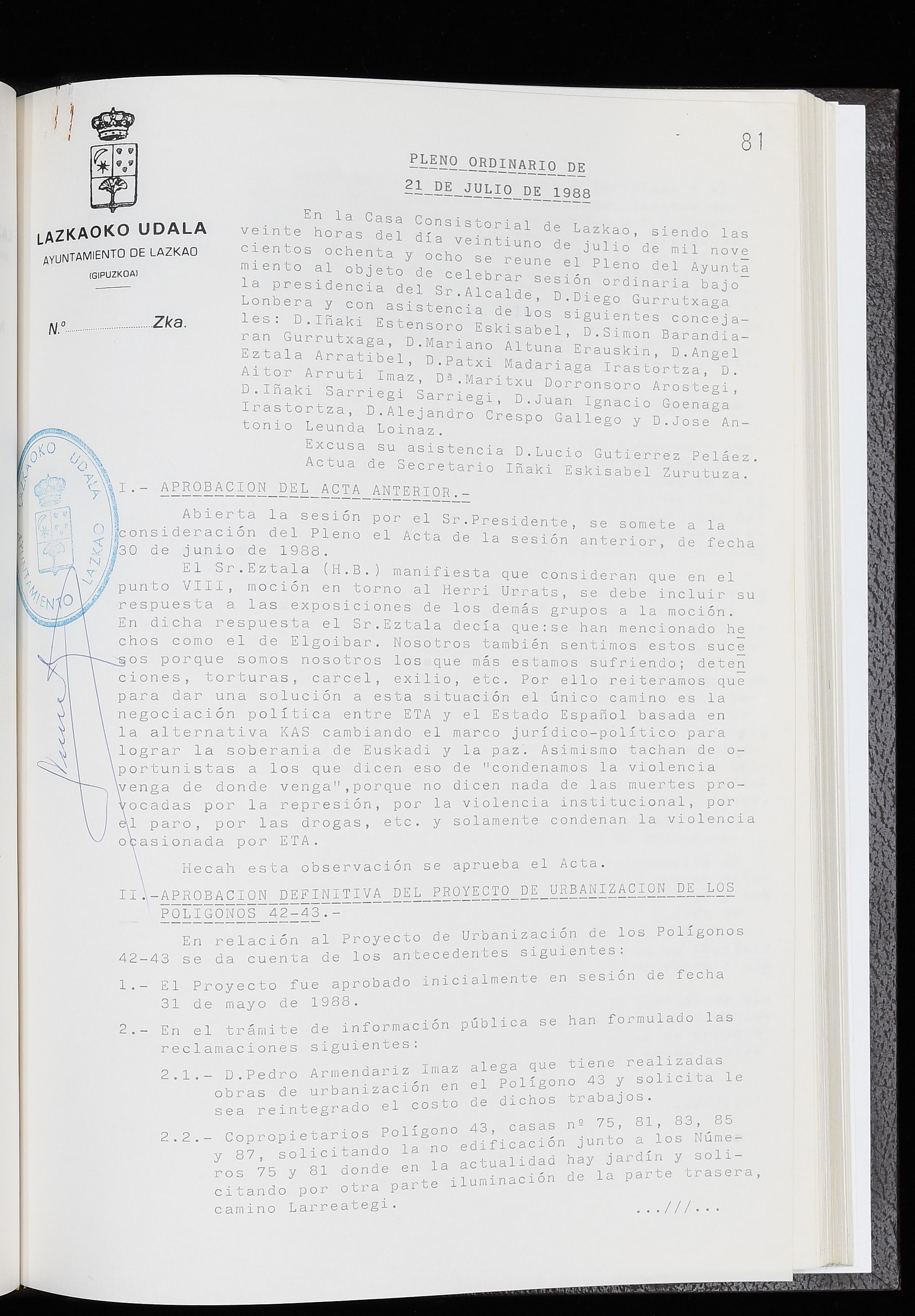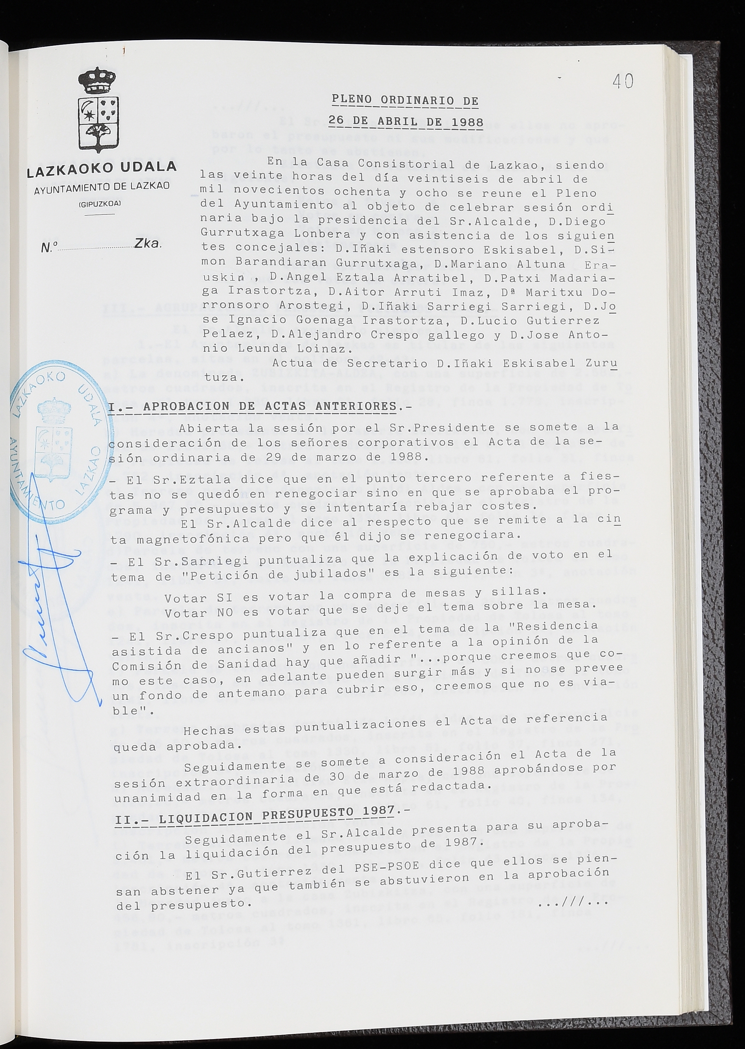 Log in to post commentsEdukiakSailkapenaFuntsaLazkaoko Udal ArtxiboaAtalakUdal AktakSailkapena1.1.4. Osoko Bilkuraren akta liburuakSailkapen berriaOsoko Bilkurako akta liburuakMultimediaIrudiakIdentifikazioaSignaturaakta liburua I-045Hasiera1988-01-28Amaiera1988-12-22AutoritateakTokiaLazkaoLog in to post commentsAkta eratu