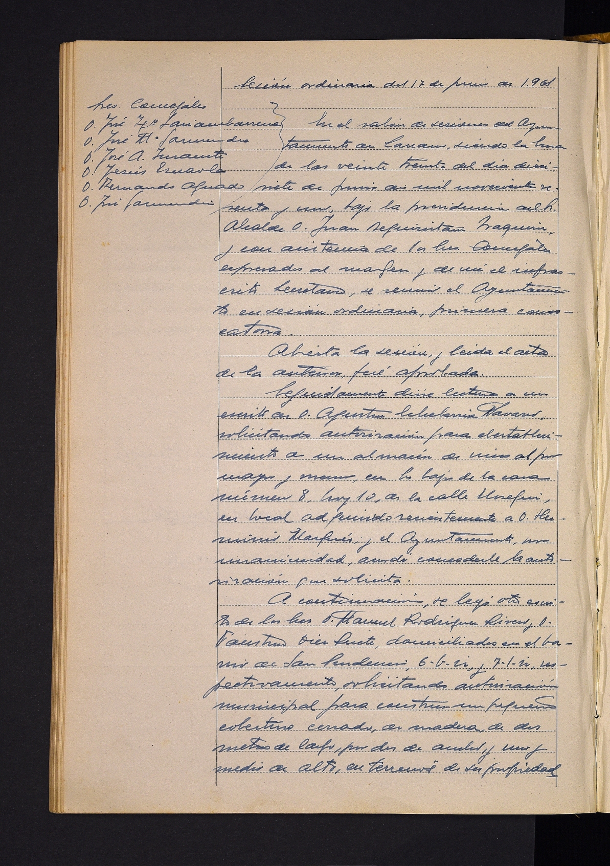 Agustin Echeverria Navarrori baimena ematea Elosegui kaleko 10 zenbakian ardo-biltegi bat irekitzeko. # Manuel Rodriguez Rivero eta Faustino Diezi baimena ematea San Prudentzio auzoko bere jabetzako lurretan estalpe bat eraikitzeko. # Jose Mugica Aguirre gordailuzainari baimena ematea Ogasun Ordezkaritzan kobrantzak egiteko. # Zigorrak ezartzea zenbait umeri hilerrian leihoak hausteagatik. # Maiatzeko gastuak eta diru-sarrerak onartzea. # Comevasa enpresak aurkeztutako eskaera, Senpere auzoko bere jabetzako lurrak ixteko. # Lucio Irizar Izak aurkeztutako eskaera, Elosegi kaleko 96 zenbakian garaje bat eraikitzeko. # Hainbat faktura onartzea.