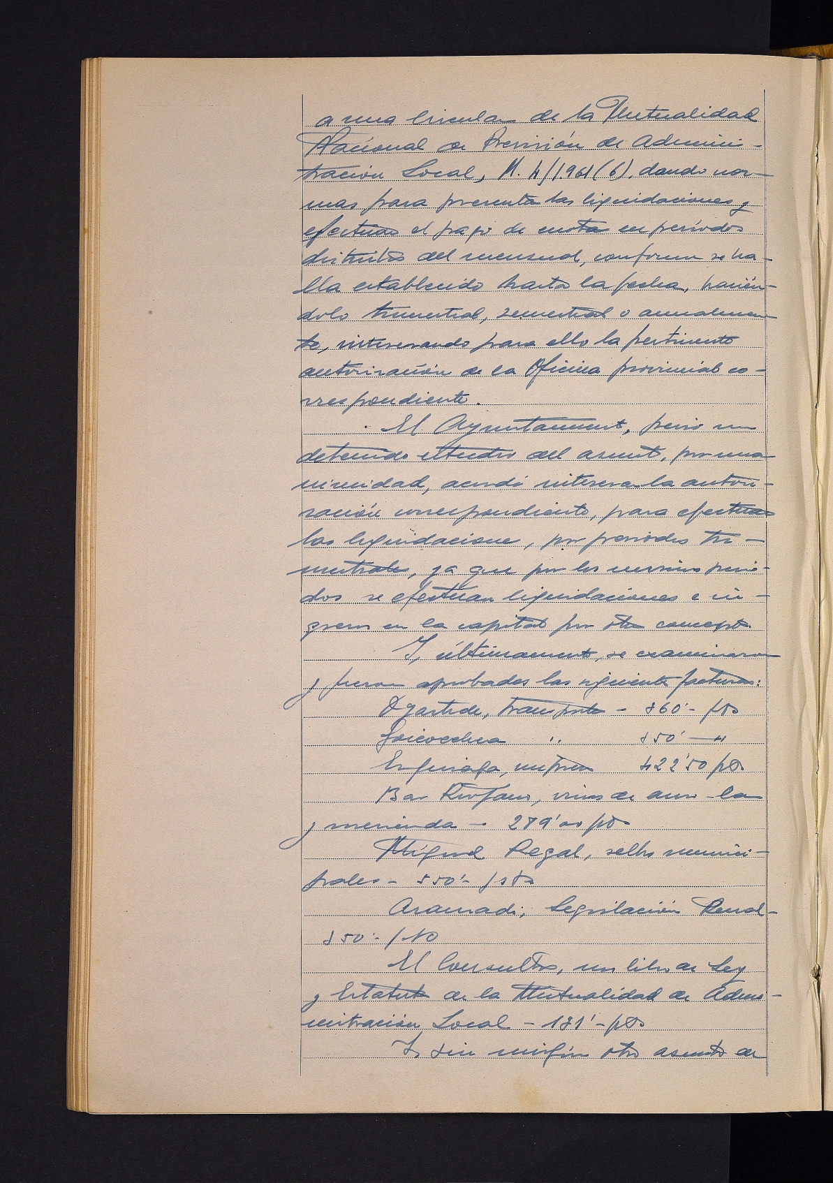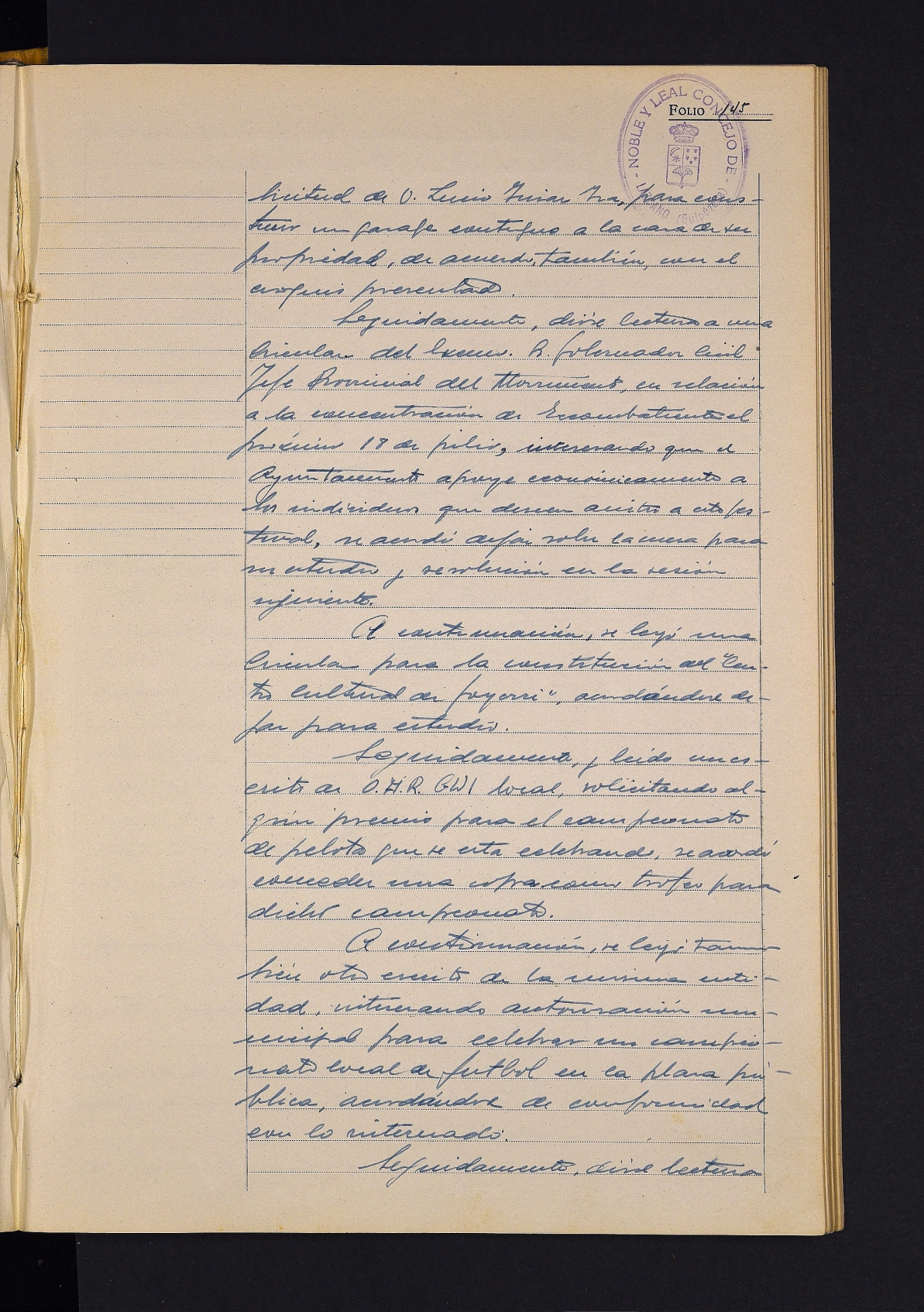 Comevasa enpresari baimena ematea bere jabetzako lurrak ixteko. # Lucio Irizar Izari baimena ematea bere jabetzako lurretan garajea eraikitzeko. # Gobernu zibilak aurkeztutako eskaera, uztailaren 18an egingo den soldadu ohien elkarteratzerako laguntza ekonomikoa emateko. # Goierriko kultur etxearen eraketa iragartzen duen zirkularra. # Oarguik prestatutako pilota txapelketarako trofeoa ematea. # Oarguiri baimena ematea futbol txapelketa egiteko. # Kitapenak aurkezteko arauekin bidalitako zirkularraren irakurketa. # Hainbat faktura onartzea.