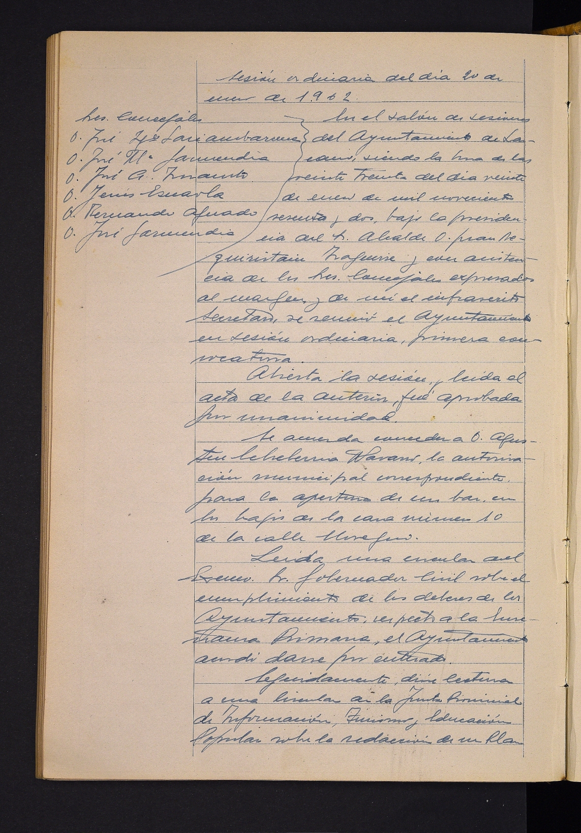Agustin Echeverria Navarrori baimena ematea Elosegui kaleko 10 zenbakian taberna irekitzeko. # Gobernadore Zibilaren zirkularraren irakurketa, Udalek lehen hezkuntzari dagokionez dituzten betebeharrei buruzkoa. # Probintziako turismo-plan bat idazteari buruzko zirkularraren irakurketa. # Gobernu Zibilaren zirkularra, eraikuntza-lizentziak emateari buruzkoa. # Dolores eta Candelaria Sarasola Alegria ahizpei Beasaingo Ongintzan sartzeko baimena ematea. # Maria del Carmen Arregui Fernandez praktikantea bizi den etxearen errentaren kitapena. # 1961eko aurrekontuaren kitapena onartzea. # Abenduko gastuak eta diru-sarrerak onartzea.