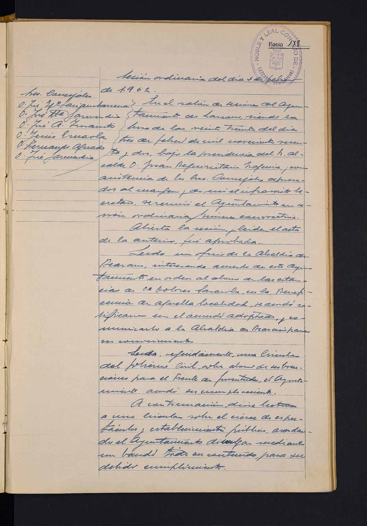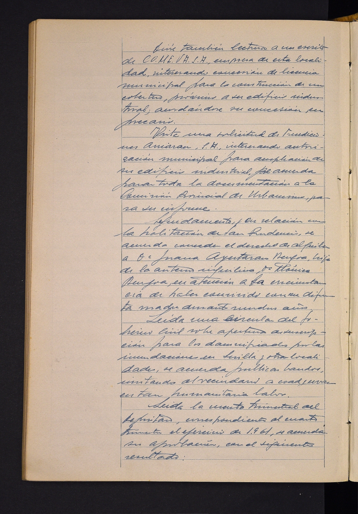 Beasaingo alkatetzaren ofizioa, Dolores Sarasolak Beasaingo Ongintzan egindako egonaldia ordaintzeari buruzkoa. # Gobernu Zibilaren zirkularra, Frente de Juventudeserako dirulaguntzak ordaintzeari buruzkoa. # Ikuskizun eta establezimendu publikoak ixteko orduari buruzko zirkularra. # Comevasa enpresari baimena ematea bere industria-eraikinetik gertu estalpe bat eraikitzeko. # Fundiciones Arriaranek aurkeztutako eskaera, bere industria-eraikina handitzeko. # Juana Ayestaran Bengoari San Prudentzioko gelaren alokairua ematea. # Gobernu Zibilaren zirkularra, Sevillako uholdeen kaltetuentzako laguntza eskatzeko. # 1961eko ekitaldiko laugarren hiruhileko kontuak onartzea. # Hainbat fakturaren onarpena.
