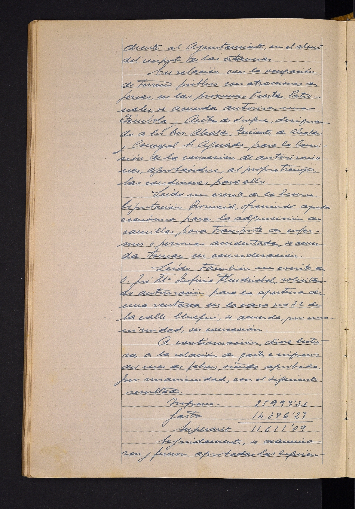 Comevasa enpresak aurkeztutako eskaera estolderia bat margotzeko. # Hijos de Albisu enpresaren idazkia, argiteriaren kuota handitzeari buruzkoa. # Aldundiaren jakinarazpena, Pilar Lopez Fernandez neskatoa Deustuko gormutuen ikastetxean sartzeari buruzkoa. # Herriko jaietan barrakak jartzeko baimenak aztertzea. # Aldundiaren idazkia, gaixoak garraiatzeko ohatilak erosteko dirulaguntzak eskainiz. # Jose Maria Zufiria Mendizabali baimena ematea Elosegi kaleko 32 zenbakian leiho bat irekitzeko. # Otsaileko gastuak eta diru-sarrerak onartzea. # Zenbait fakturaren onarpena.