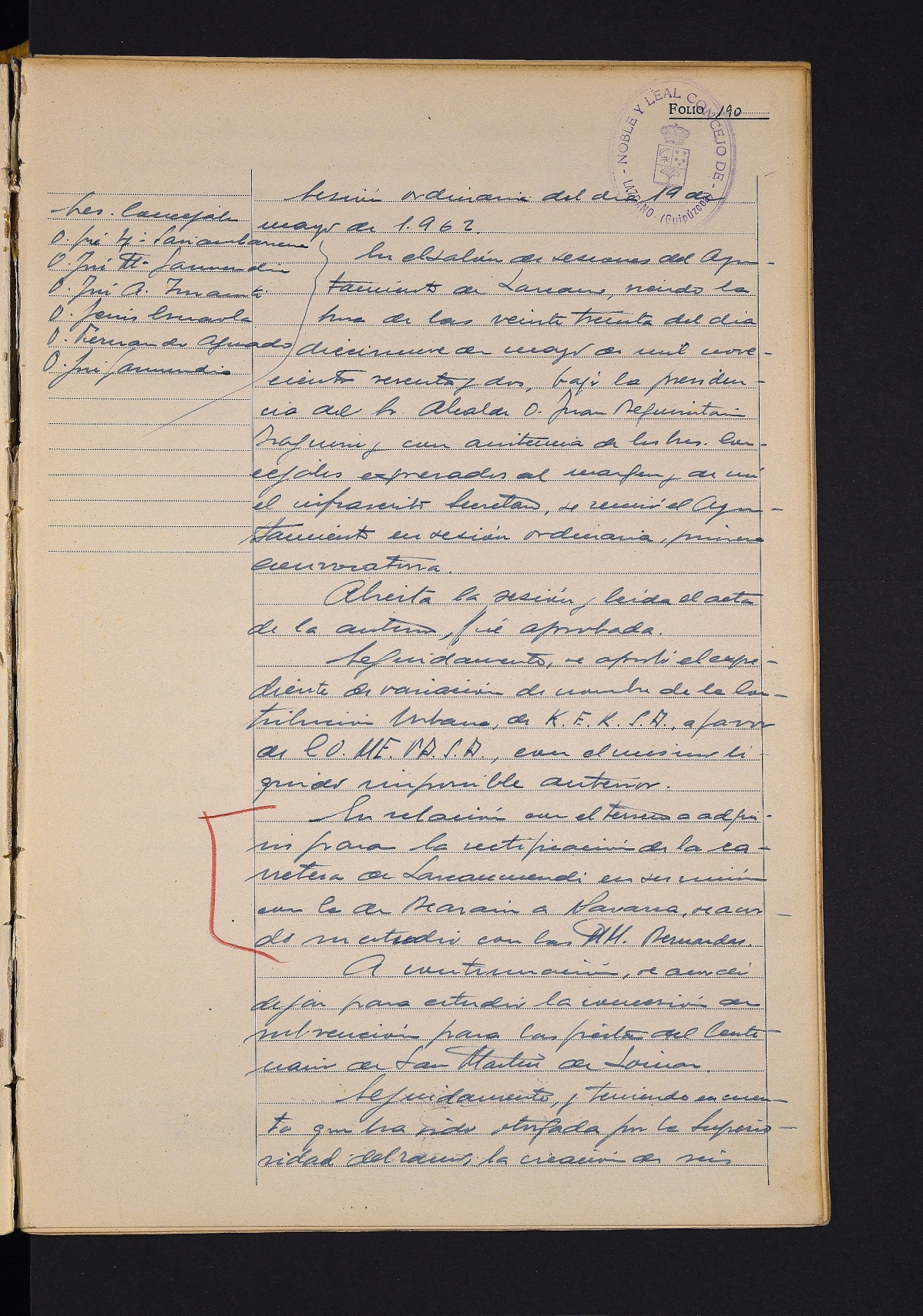 Hiri-kontribuzioan jabetzak aldatzeko espedienteak onartzea. # Lazkaomendiko errepidea zuzentzeko lursailaren eskurapena aztertzea. # Loinazko San Martinen mendeurreneko festarako dirulaguntza ematea aztertzeko uztea. # Maistrarentzat etxebizitza eskatzea erabakitzea. # Zenbait fakturaren onarpena.