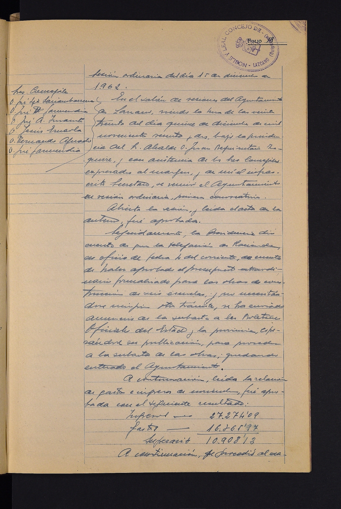 Ogasun Ordezkaritzaren idazkia, eskolak eraikitzeko ezohiko aurrekontua onartuz. # Azaroko gastuak eta diru-sarrerak onartzea. # Argiteria publiko berria jartzeko proiektuaren azterketa. # Udalak Banco Guipuzcoanon duen kontua berrikustea. # Soldaten eta aparteko ordainsarien ordainketak onartzea. # Arbitrioen ordainketetan izandako atzerapenen zerrenda. # Zenbait faktura onartzea.