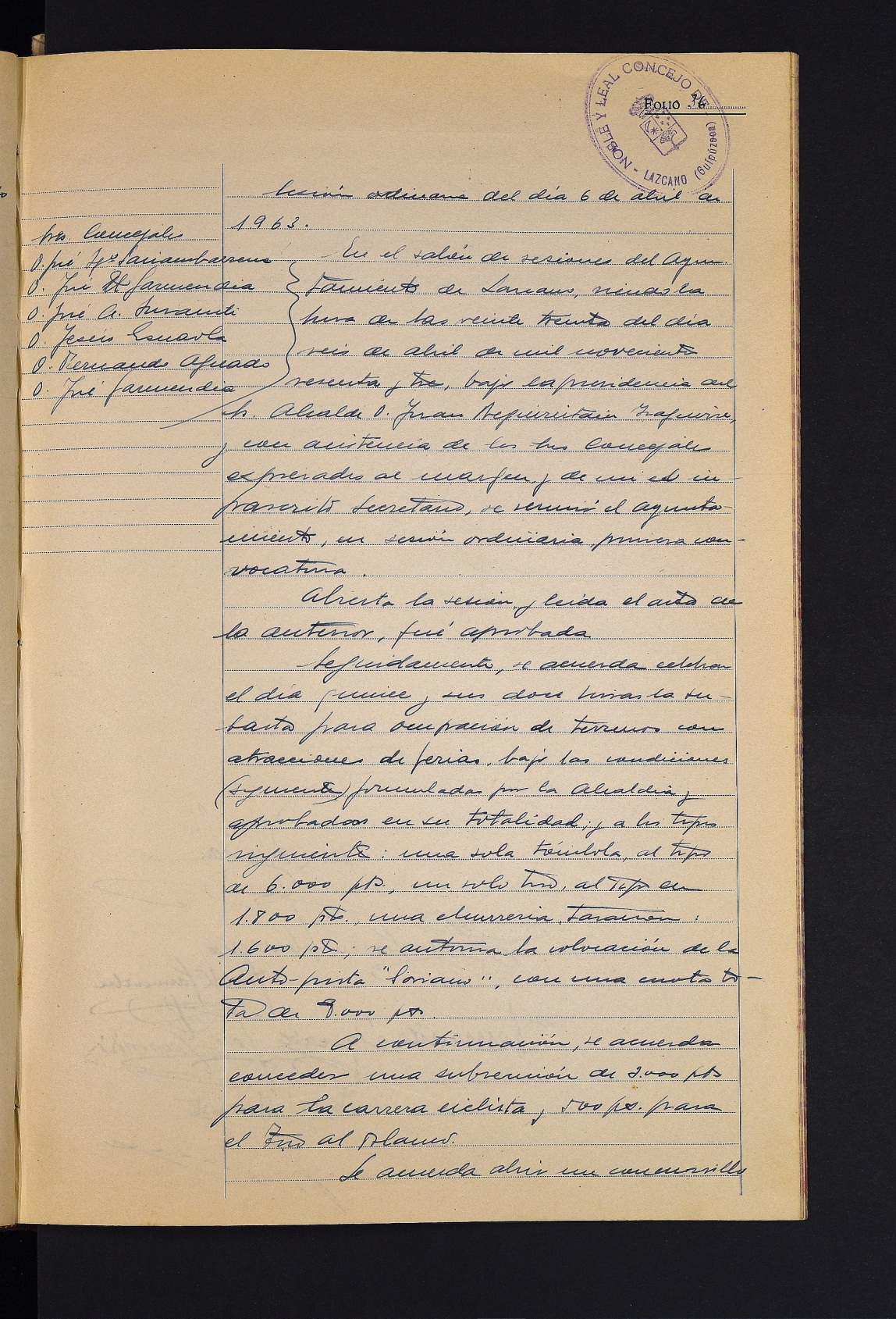 Barrakak jartzeko lurren esleipena onartzea. # Txirrindulari-lasterketarako eta plater-tiroko lehiaketarako dirulaguntzak onartzea. # Udal-bulegoak zuritzeko lehiaketa irekitzea. # Ogasun Ordezkaritzaren ofizioaren irakurketa, 1963ko ekitaldirako ohiko aurrekontuaren onarpenarekin. # Hainbat faktura onartzea.