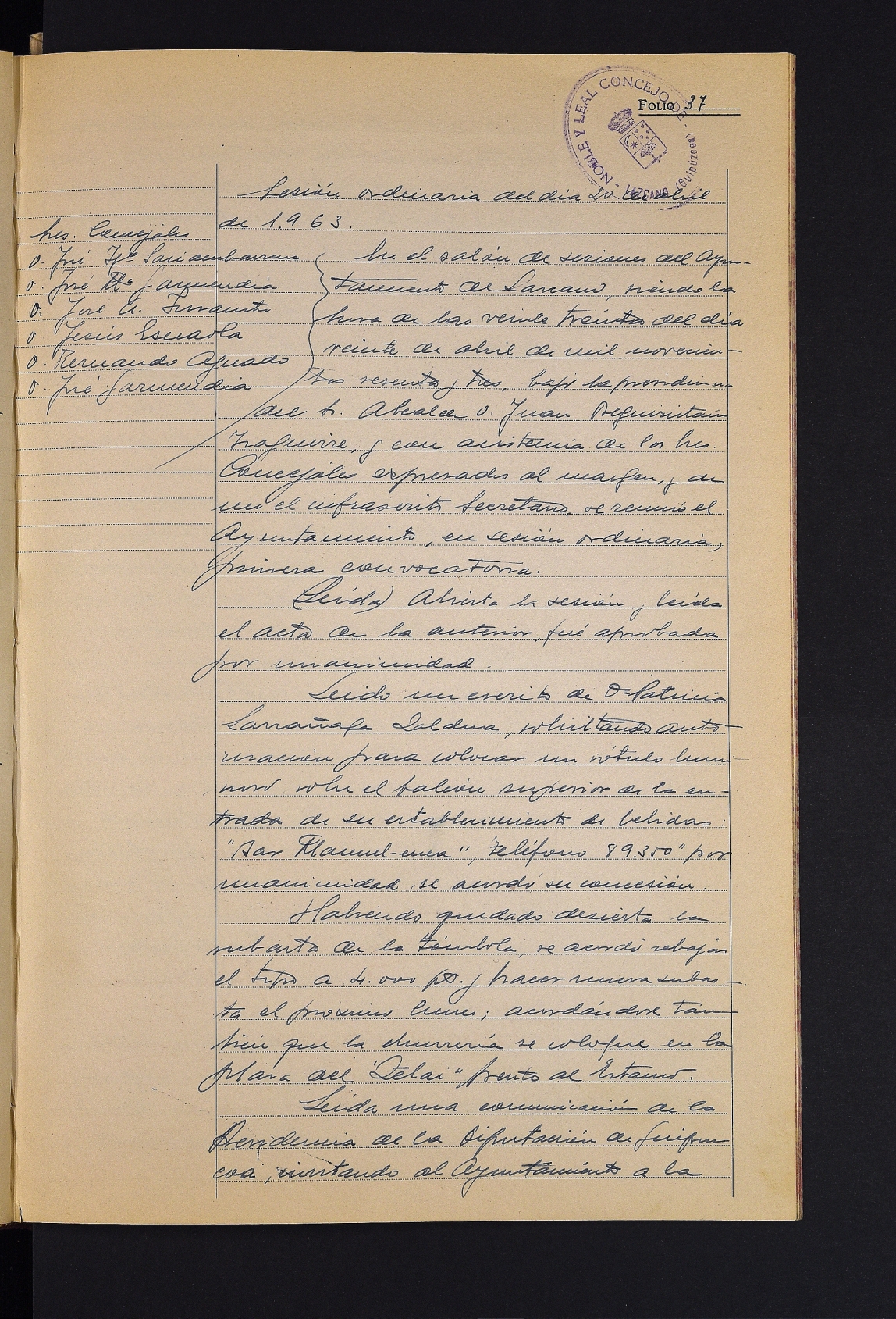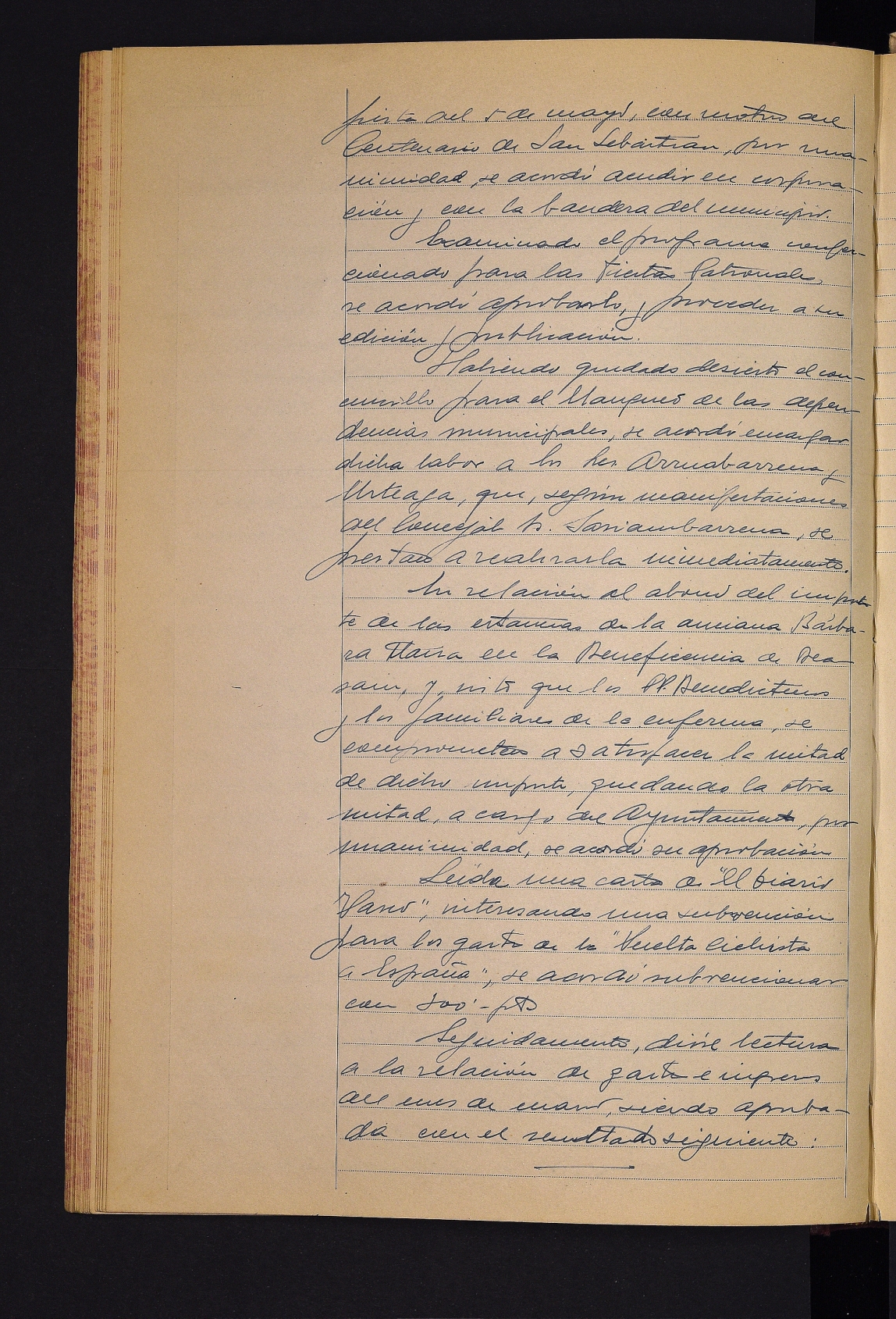 Patricia Larrañaga Zalduari baimena ematea bere tabernako sarreran errotulu bat jartzeko. # Barrakak eta txurro-denda jartzeko kokalekua adostea. # Aldundiaren gonbidapena onartzea Donostiako mendeurrenaren ospakizunera joateko. # Herriko jaietarako egitaraua onartzea. # Udal bulegoak zuritzeko lana Arruabarrenari eta Urteagari ematea. # Barbara Maiza Beasaingo Ongintzan egoteko ordainketa adostea. # Espainiako txirrindularitza itzulirako dirulaguntza onartzea. # Martxoko gastuak eta diru-sarrerak onartzea. # Hainbat fakturaren onarpena. # Juan Miguel Rezola Aizpurua arkitektoak egindako Hirigintza Antolamenduko Plan Orokorra onartzea.