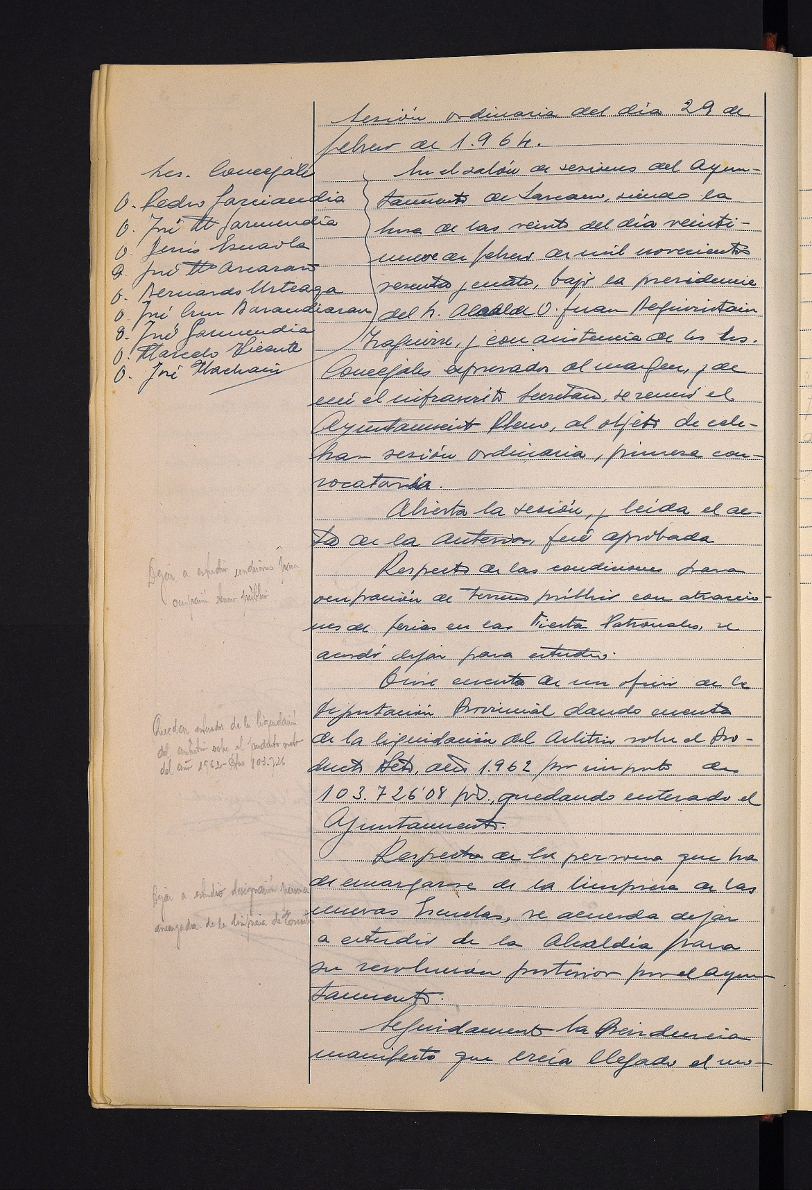 Barraketarako lursail publikoa lagatzea aztertzeko uztea.# Aldundiaren ofizioa, produktu garbiaren gaineko arbitrioaren kitapenarekin. # Eskola berrien garbiketaren arduradunaren izendapena aztertzera uztea. # Eskola berrien obren kitapena eta Aldundiak emandako dirulaguntza handitzeko eskaera. # Lorenzo Amenabarro Esnaolak aurkeztutako, San Prudentzio auzoan, Olaberriako errepidearen mugakide gunearen Plan Partzialaren Urbanizazio Proiektua behin-behinean onartzea. # Zerbitzu Teknikoen Batzorde Probintzialari linea elektriko berria jartzeko proiektua aurkeztea. # Zenbait fakturaren onarpena.