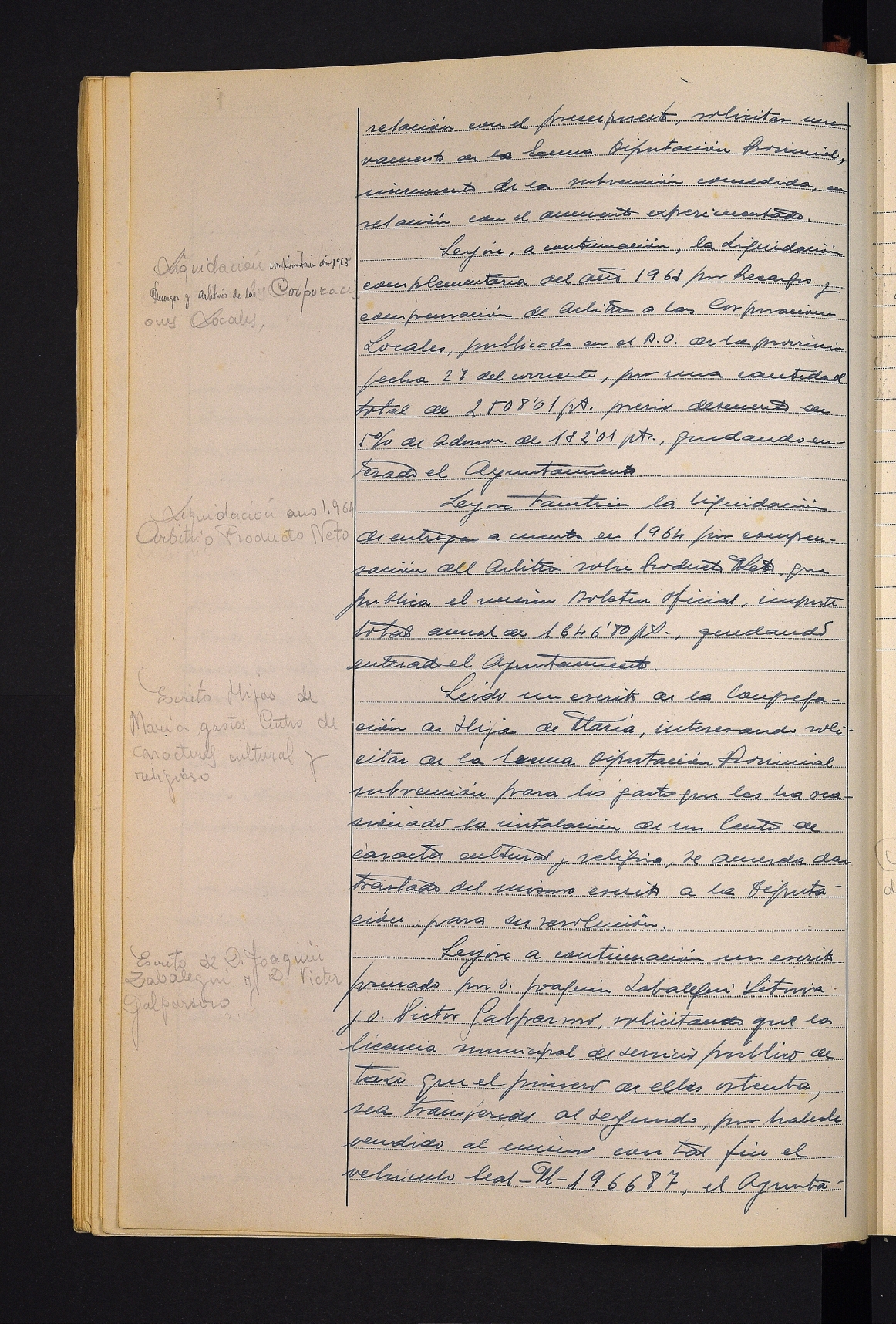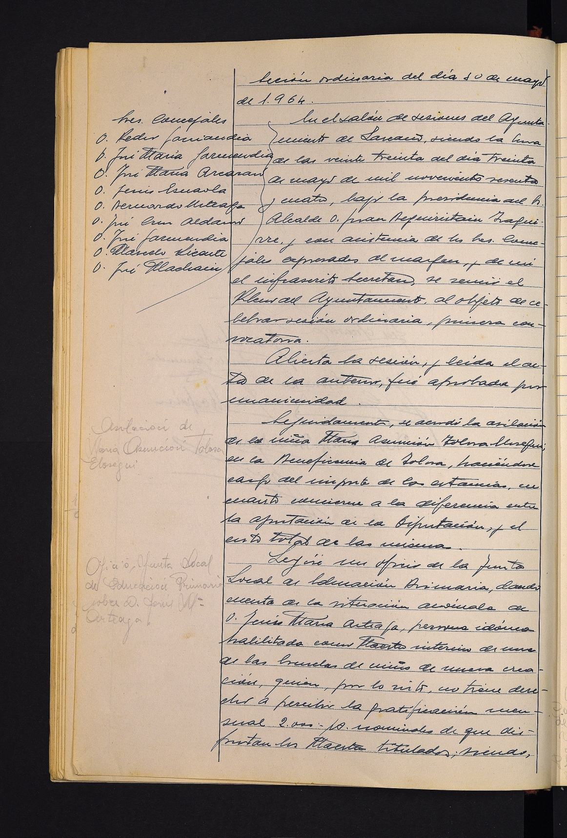 Maria Asunción Tolosa Elosegui neskatoa Tolosako Ongintzan sartzea onartzea. # Lehen Hezkuntzako Toki Batzordearen ofizioa, Jesus Maria Arteaga eskola berrietako maisuaren ezohiko egoerari buruzkoa. # Arkitektura eta Hirigintzako Batzorde Probintzialaren txostena eta erabakia, Lazkaoko Hiri Antolamenduko Plan Orokorrari buruzkoa, udalerriko industrialdea handitzeko beharra erakutsiz. # Estatuko Aldizkari Ofizialean irakasleentzako etxebizitzen enkanteari buruzko iragarkia. # Francisca Arruabarrena Iraolari baimena ematea bere etxea eraberritzeko. # Rezola arkitektoari kitapena eskola-taldea eraikitzeko obrengatik. # 1963ko kitapen osagarria onartzea. # 1964rako produktu garbiaren arbitrioaren kitapena. # Mariaren Alaben Kongregazioaren idazkia, zentro bat jartzeak eragindako gastuetarako Aldundiari dirulaguntza eskatuz. # Joaquin Zabalegui Leturiaren eskaera, Victor Galparsorori taxi-lizentzia eskualdatzeko. # Angel Sasianbarrena Garmendiari baimena ematea plaka-ereduen tailer bat instalatzeko. # Lehen hiruhileko kontuak onartzea.