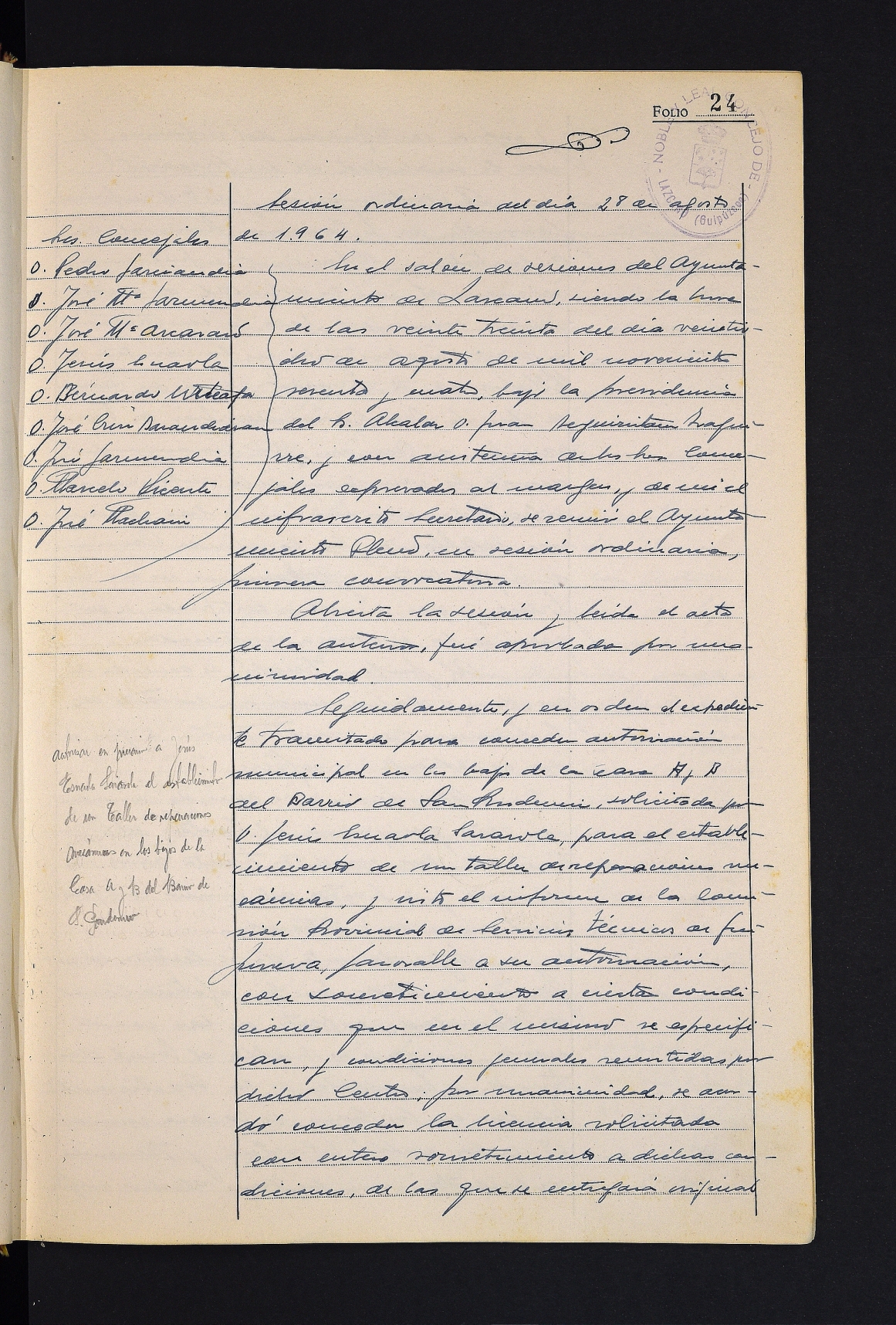 Jesus Esnaola Sarasolak San Prudentzio auzoan tailer mekaniko bat irekitzeko egindako eskaera onartzea. # Probintziako Arkitektura eta Hirigintza Batzordearen baimena Ordiziatik Lazkaorako errepidean industria-nabeak eraikitzeko. # Industria-nabeak eraikitzeko lizentziaren likidazioa. # Udaletxeko idazkariarentzako bosturtekoa onartzea. # Praktikantearen lokalaren baldintzei buruzko Tokiko Osasun Buruzagitzaren txostena. # San Ignazio taldera doan errepidea zolatzeko aurrekontuaren azterlana. # Bigarren hiruhileko kontuak onartzea. # Idazkaritzarako administrari laguntzaile bat kontratatzearen gaia aztertzea, Felipe Erausquin Iztueta proposatuz posturako. # Nesken eskoletan argiztapen berria jartzea adostea. # Jose Antonio Insausti Tolosari eskolak zuritzeko lana ematea. # Herriko argiteriaren lanen zati bat ordaintzea. # Zabor-bilketaren gaia Julio Garmendiarekin aztertzea. # Andraiturritik datorren uraren egoera aztertzea. # Agauntza errekan horma bat eraikitzeko enkantea iragartzea.