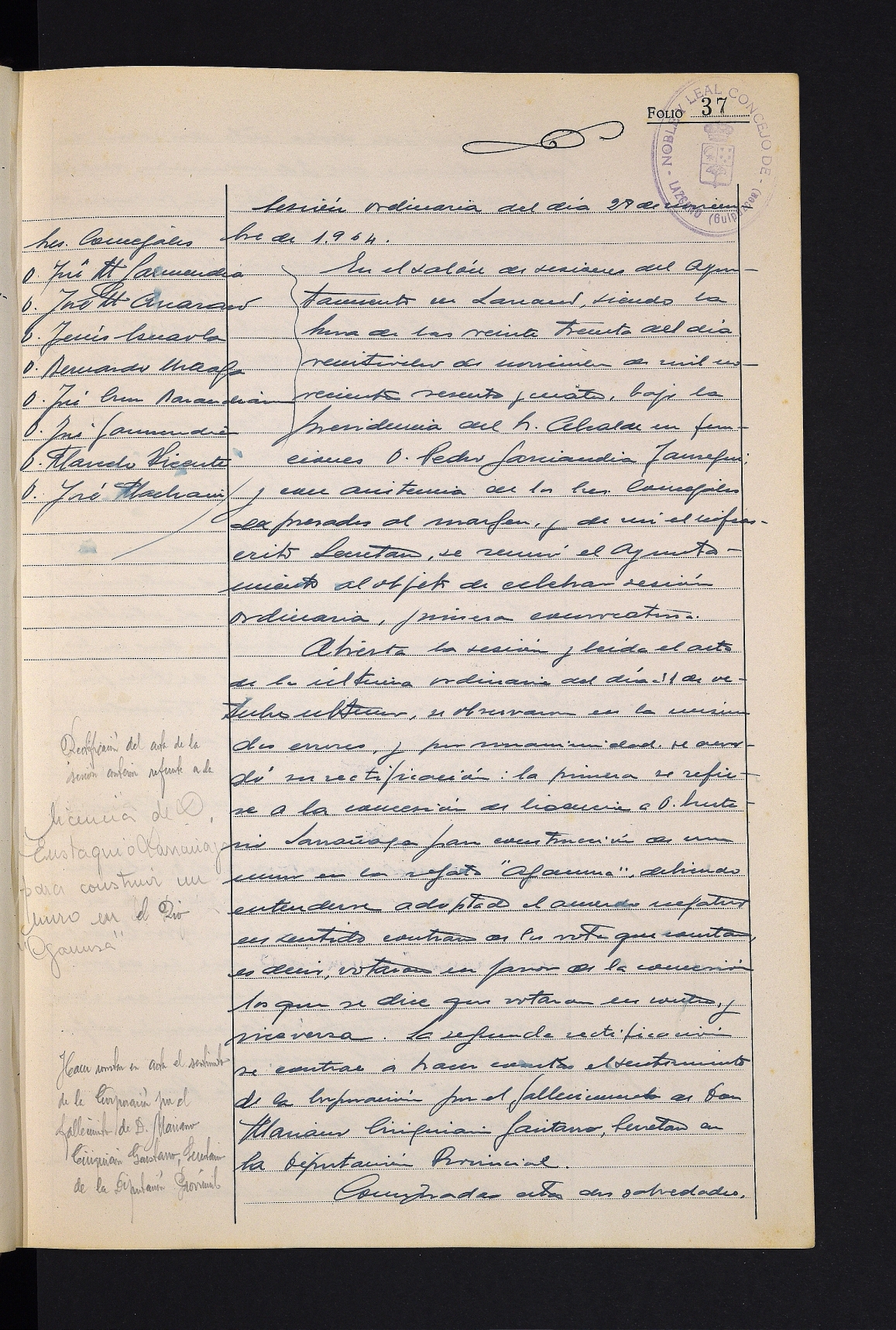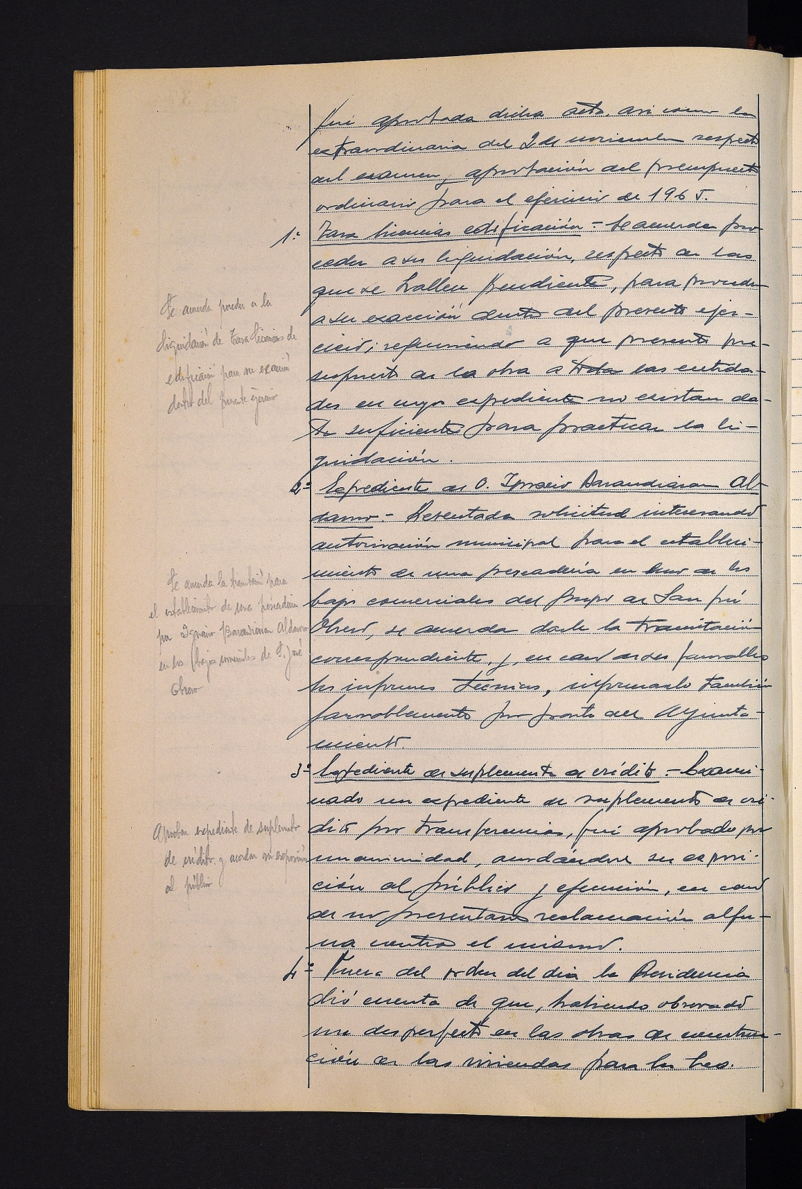 Aurreko bilkuretako aktetan hainbat zuzenketa eta zehaztapen egitea. # Eraikuntzako lizentzien tasen kitapena. # Ignacio Barandiaran Aldasorok San Jose Obrero taldean arrandegi bat irekitzeko aurkeztutako eskabidea onartzea. # Kreditu gehigarriaren espedientea onartzea. # Irakasleentzako etxeak eraikitzeko obretan izandako kalteak konpontzeko hartu beharreko neurriak adostea.