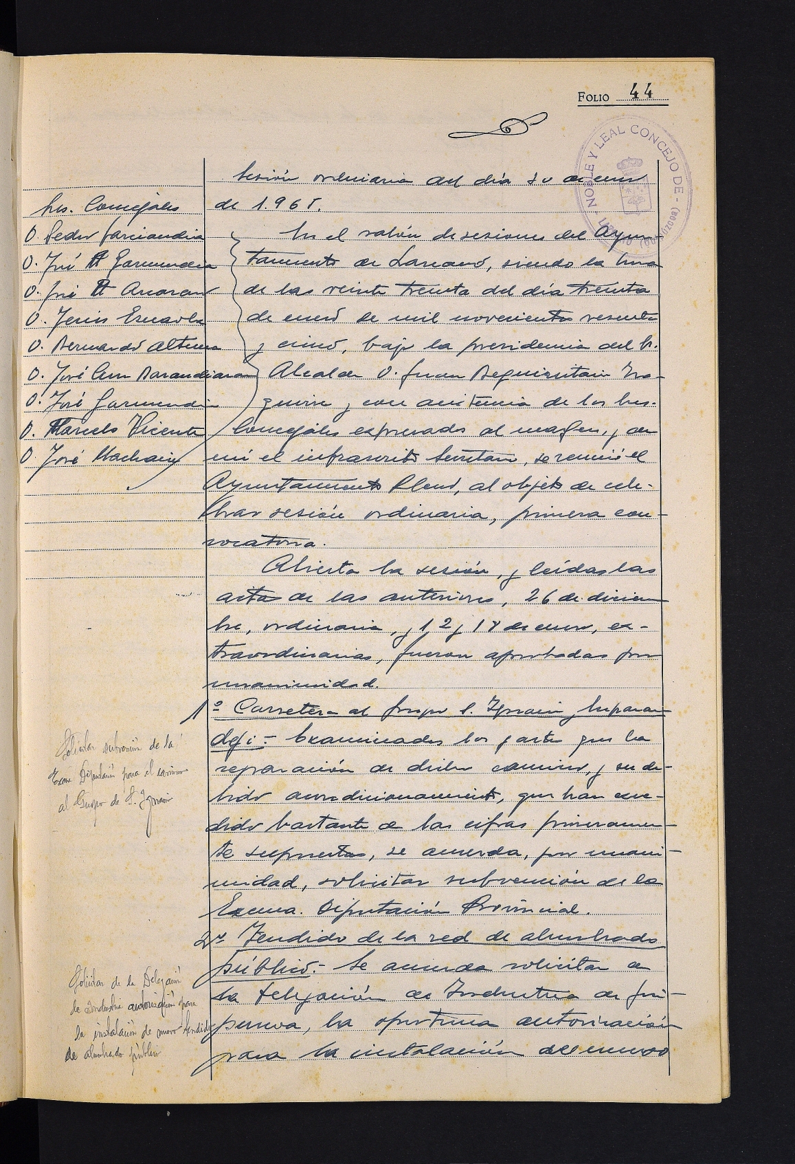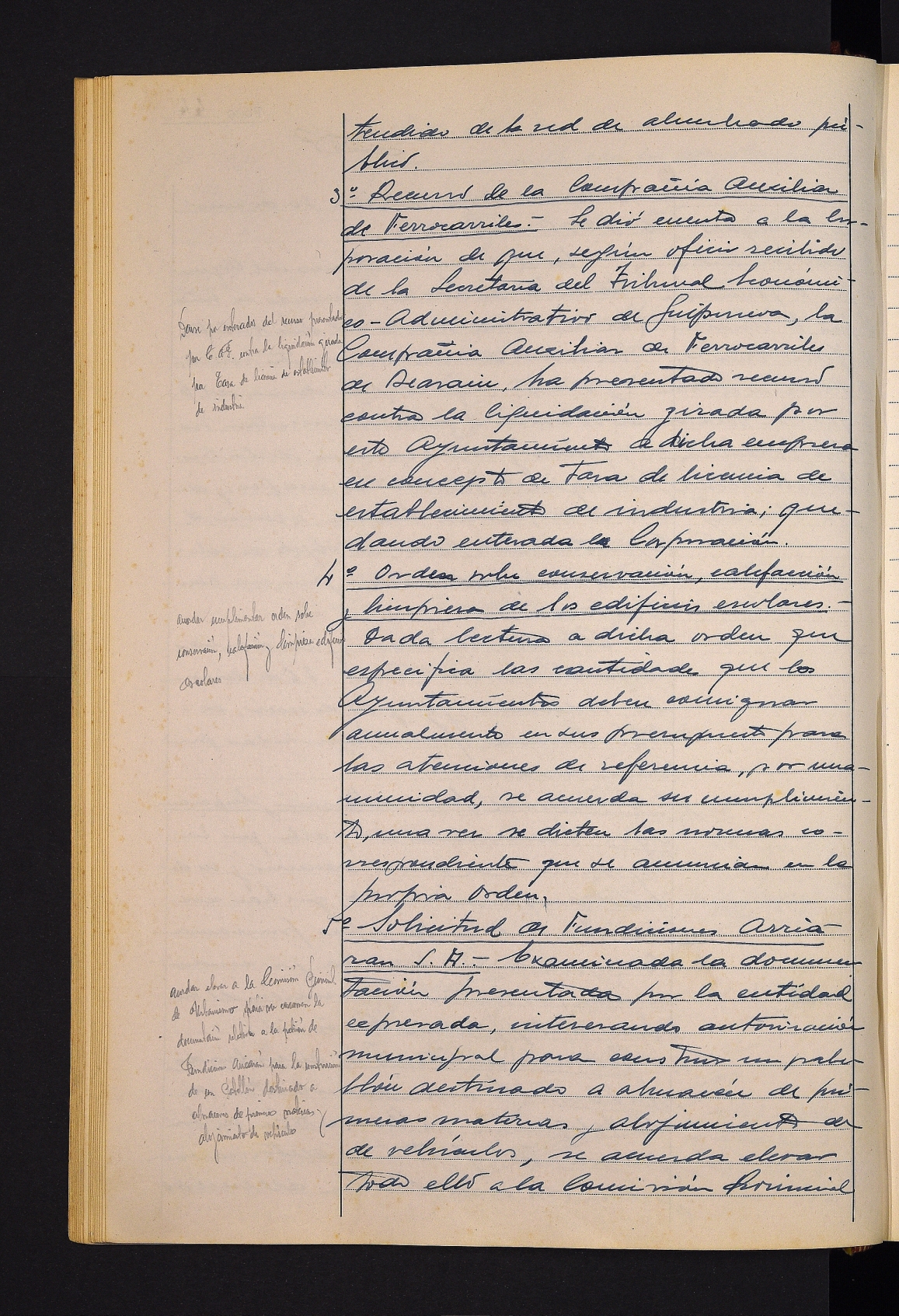 Aldundiari dirulaguntza eskatzea, San Inazio taldera eta Enparandegira doan errepideko obrengatik. # Industria Ordezkaritzari linea elektrikoa jartzeko baimena eskatzea. # CAF enpresak aurkeztutako errekurtsoa baloratzea, industria ezartzeko lizentzia-tasa kobratzeagatik. # Udalek beren aurrekontuetan eskola-eraikinak kontserbatzeko urtero esleitu behar dituzten kopuruei buruzko aginduaren irakurketa. # Arkitektura eta Hirigintzako Batzorde Probintzialean Fundiciones Arriaran enpresak industria-pabiloi bat eraikitzeko egindako eskaera aurkeztea. # Eskola berrien eraikuntzaren obren kitapena.