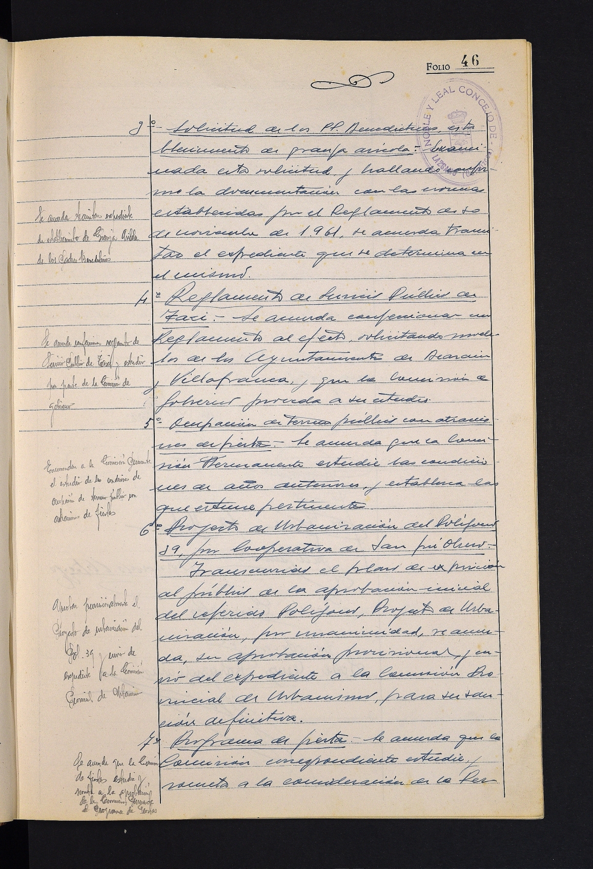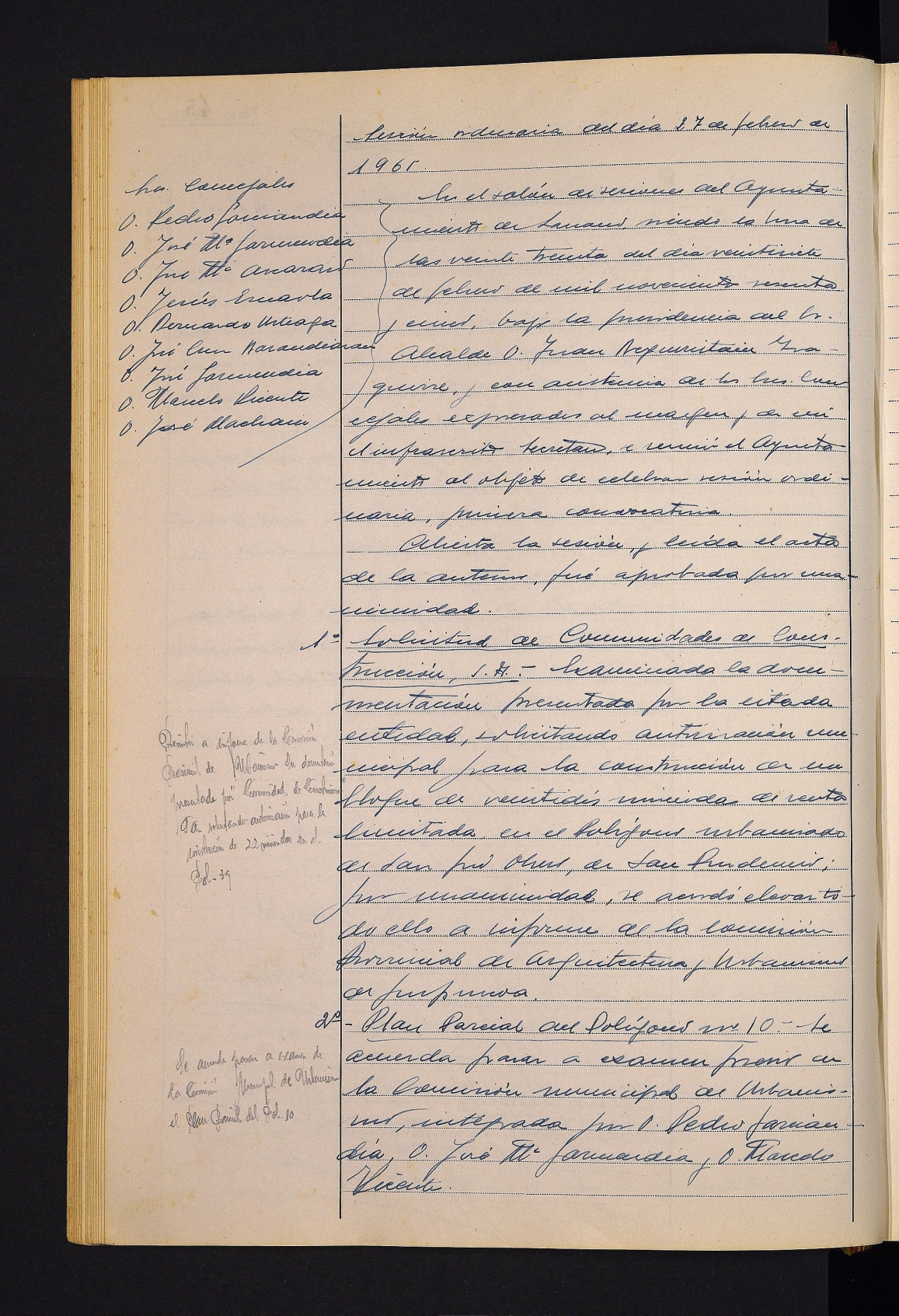 Comunidades de Construcción enpresak San Prudentzio auzoan etxebizitzak eraikitzeko egindako eskaera. # Udaleko Hirigintza Batzordeak 10. poligonoko plan partziala aztertzea adostea. # Beneditarrek nekazaritzako etxalde bat ezartzeko egindako eskaera onartzea. # Barrakentzako lurrak lagatzeko baldintzak ezartzea. # 39. poligonoko urbanizazio proiektuaren behin-behineko onarpena. # Jaietako egitaraua onartzea. # Soldadutza luzatzeko espedienteen onarpena.