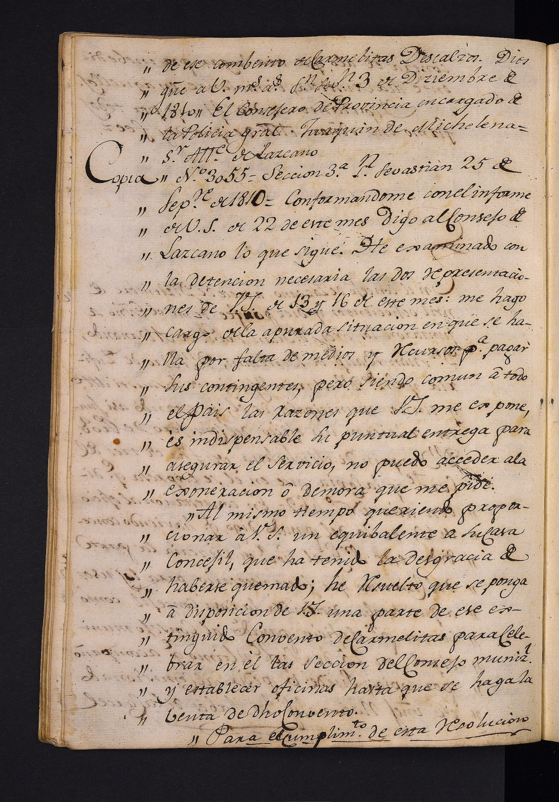 Joaquin de Michelena Probintziako kontseilariaren ofizioaren irakurketa, kontzeju-etxeak dituen erabilerei buruzkoa. Kontzeju-etxea erre ondoren, Karmeldarren komentua erabiltzea baimentzen du udal kontseiluaren bilkurak egiteko.