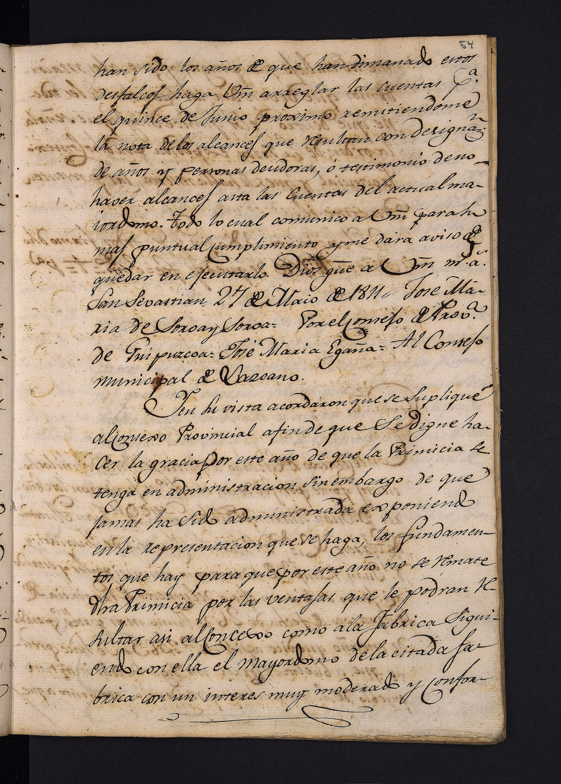 Probintziako Kontseiluaren ofizioaren irakurketa, herrietako primizien kudeaketari buruzko jarraibideekin.