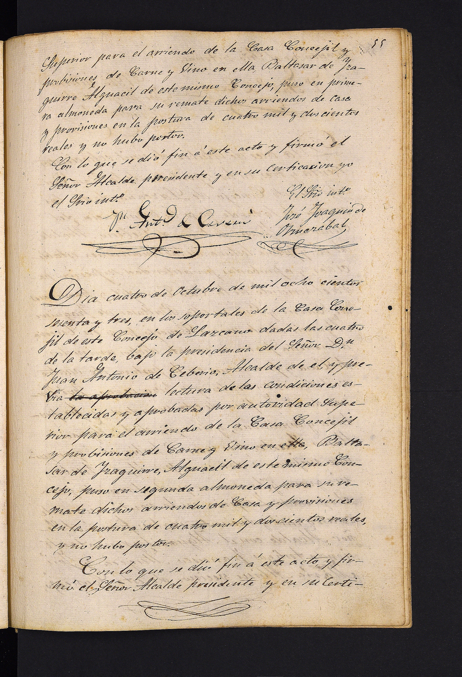 Kontzeju-etxearen eta bertan dauden haragi eta ardo horniduren errentamendurako, agintari gorenak ezarritako eta onartutako baldintzen irakurketa. Baltasar de Izaguirre aguazilak, kontzeju-etxea eta hornigai horiek errematerako lehen enkantean jarri ondoren, ez da eskaintzailerik aurkezten.
