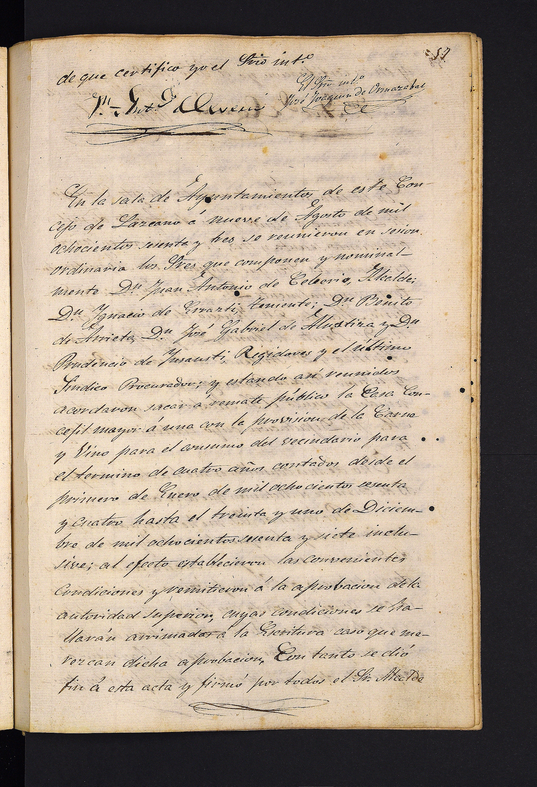 Kontzeju-etxearen eta bertan dauden haragi eta ardo horniduren errentamendurako, agintari gorenak ezarritako eta onartutako baldintzen irakurketa. Baltasar de Izaguirre aguazilak, kontzeju-etxea eta hornigai horiek errematerako hirugarren enkantean jarri ondoren, Jose Fernando de Zufiria eskaintzen da enkantea onartzeko.