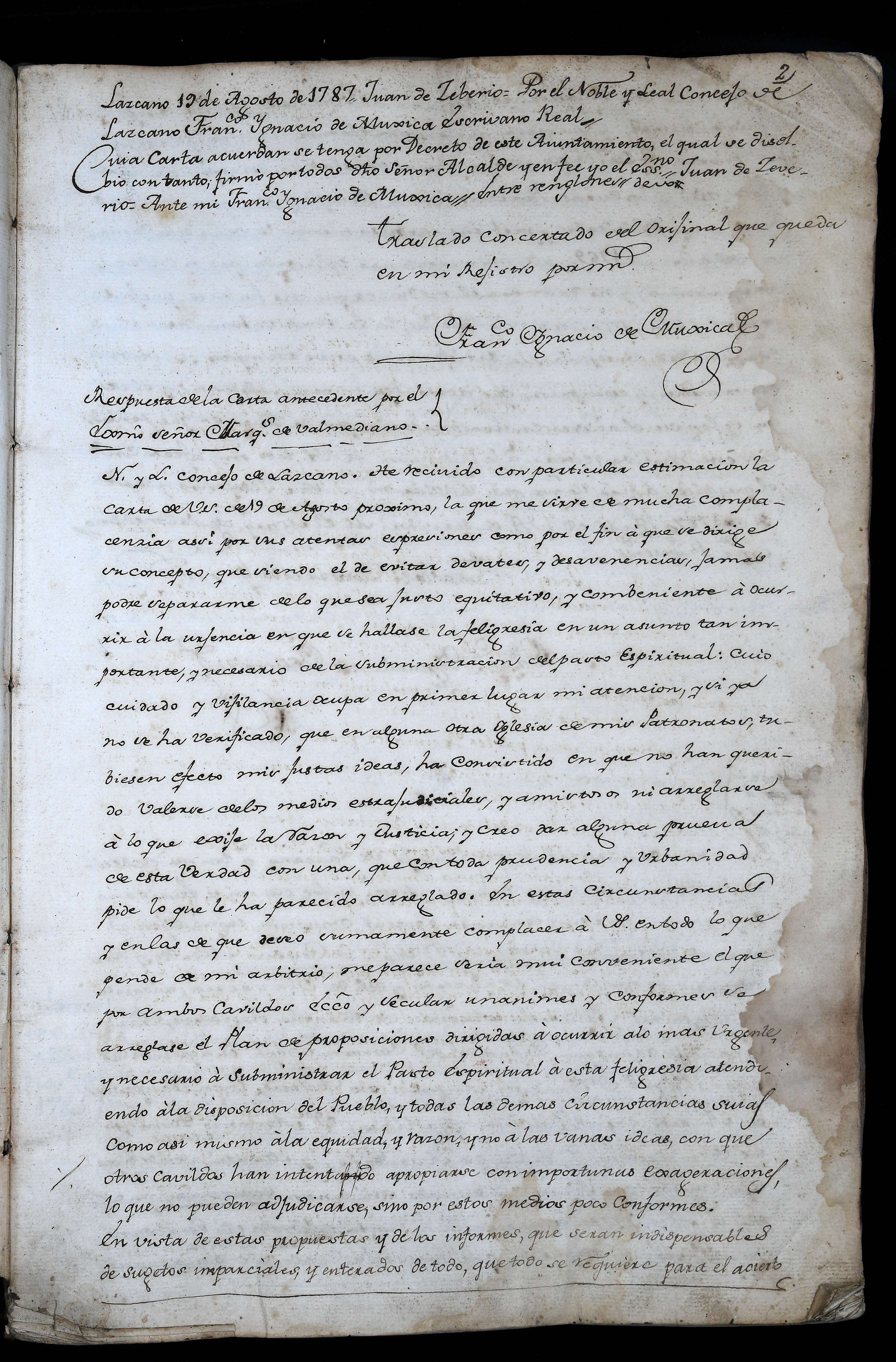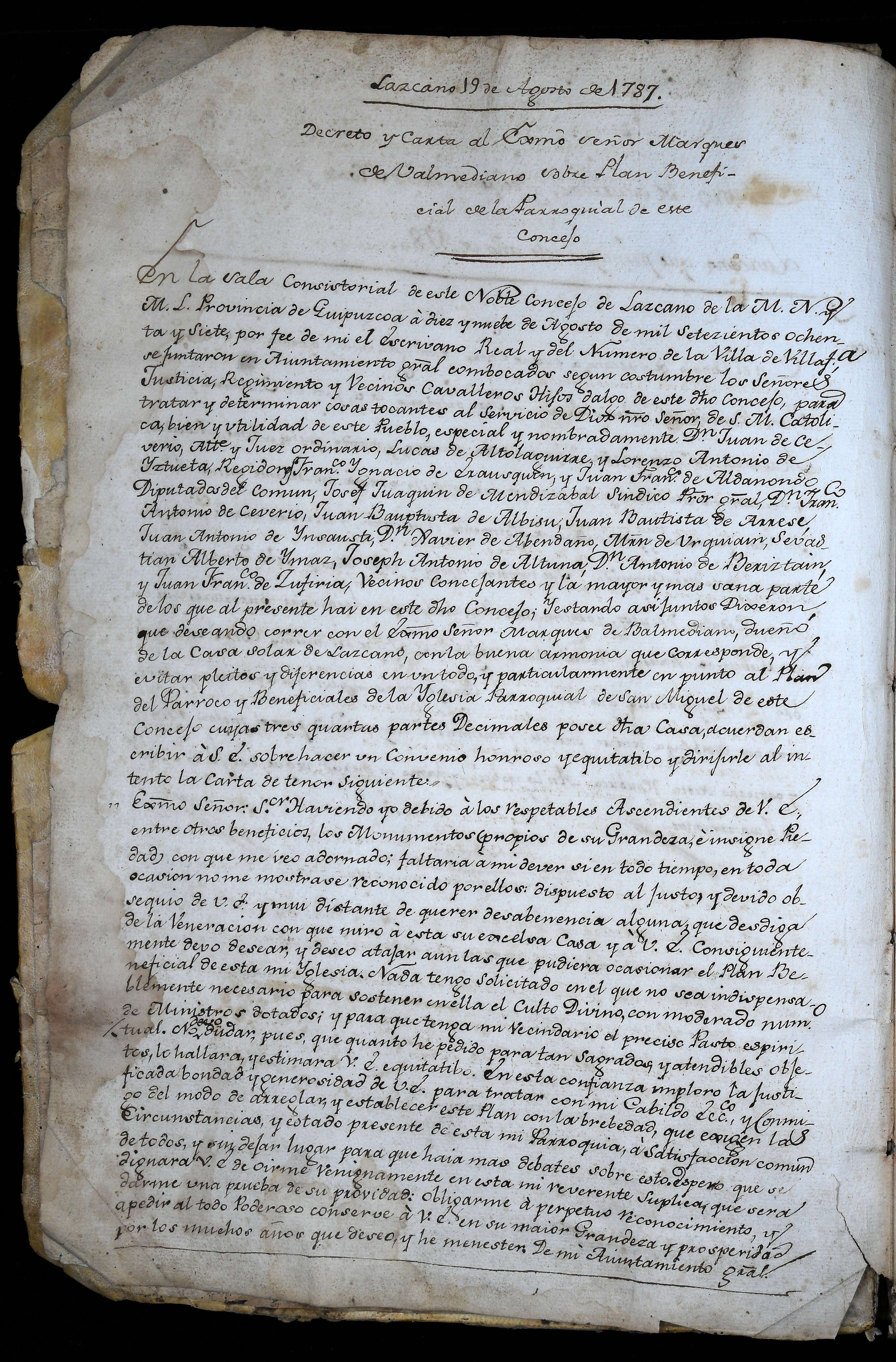 Lazkaoko oinetxearen jabea den Valmedianoko markesari gutun bat bidaltzea erabakitzen da, San Migel parrokia-elizaren plan onuragarriari buruz. Bidalitako gutunaren testua eta Valmedianoko markesaren erantzuna jasotzen dira.