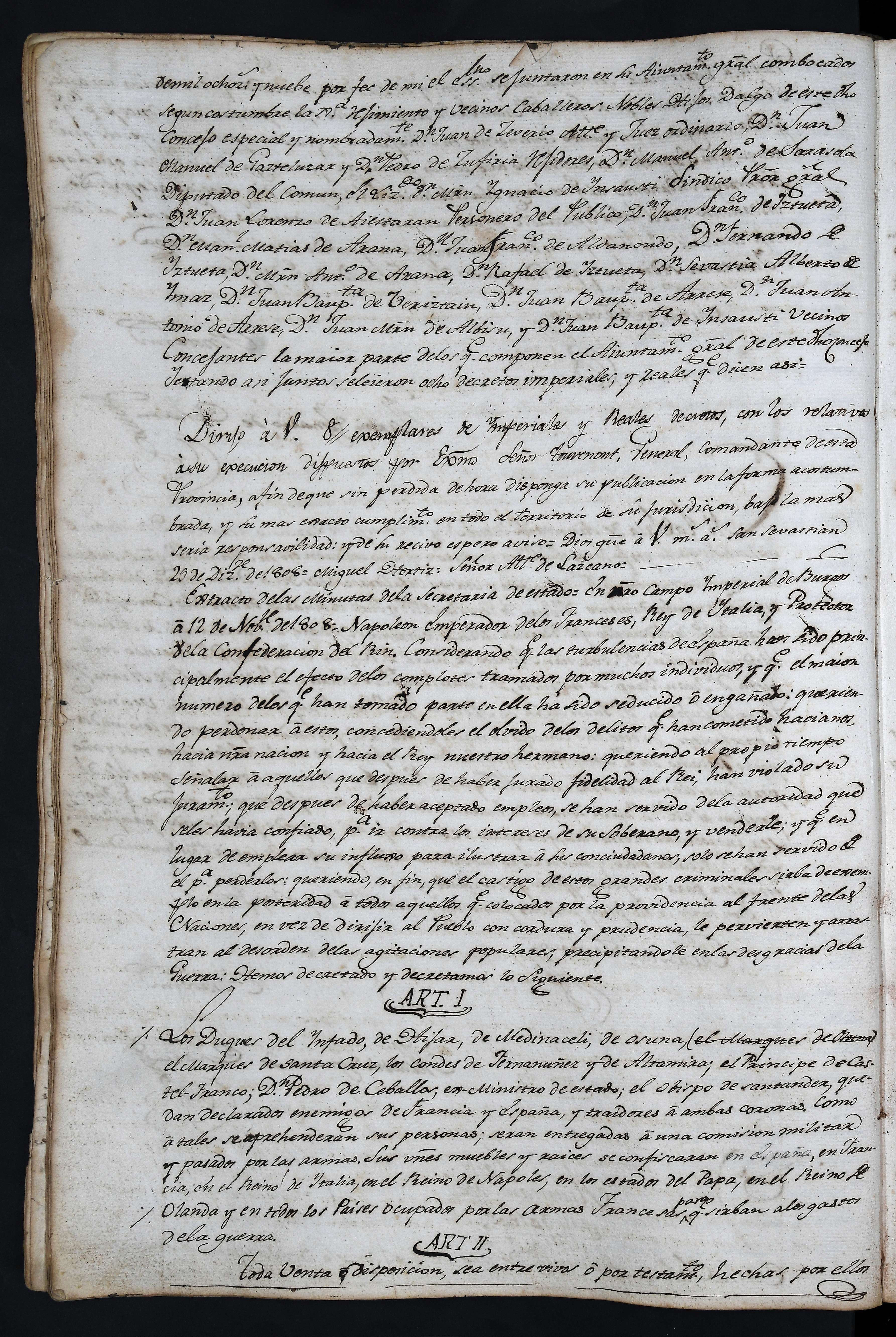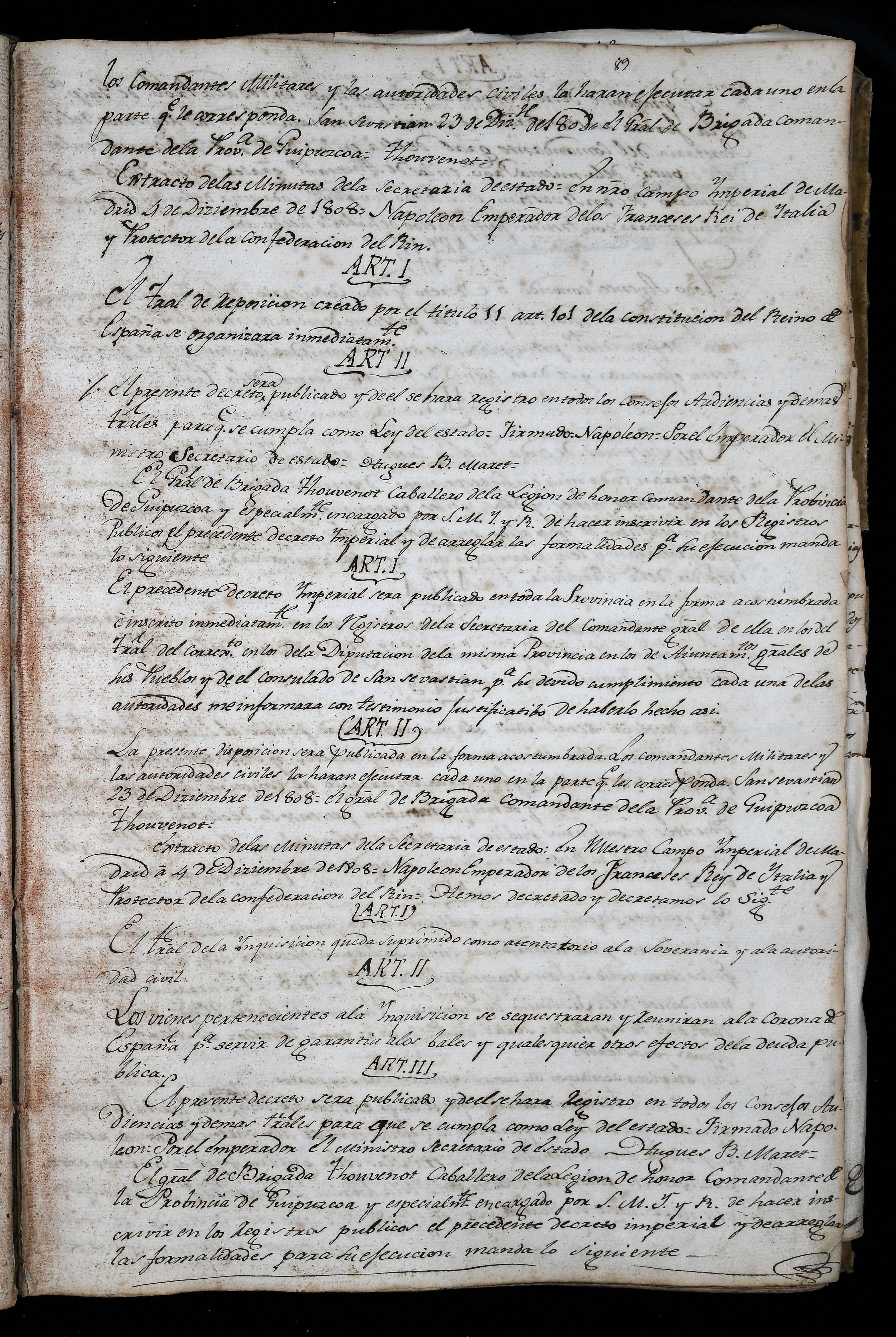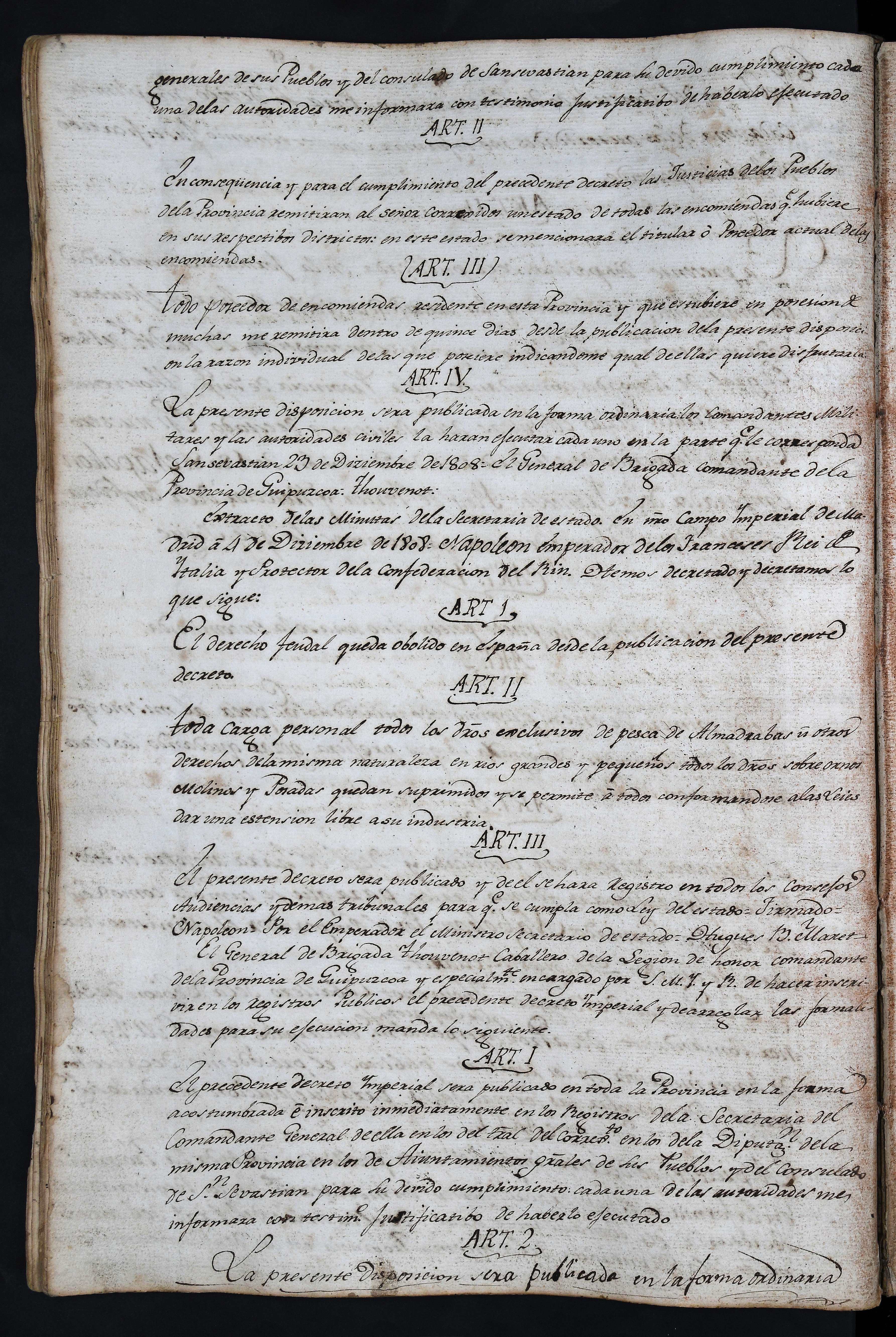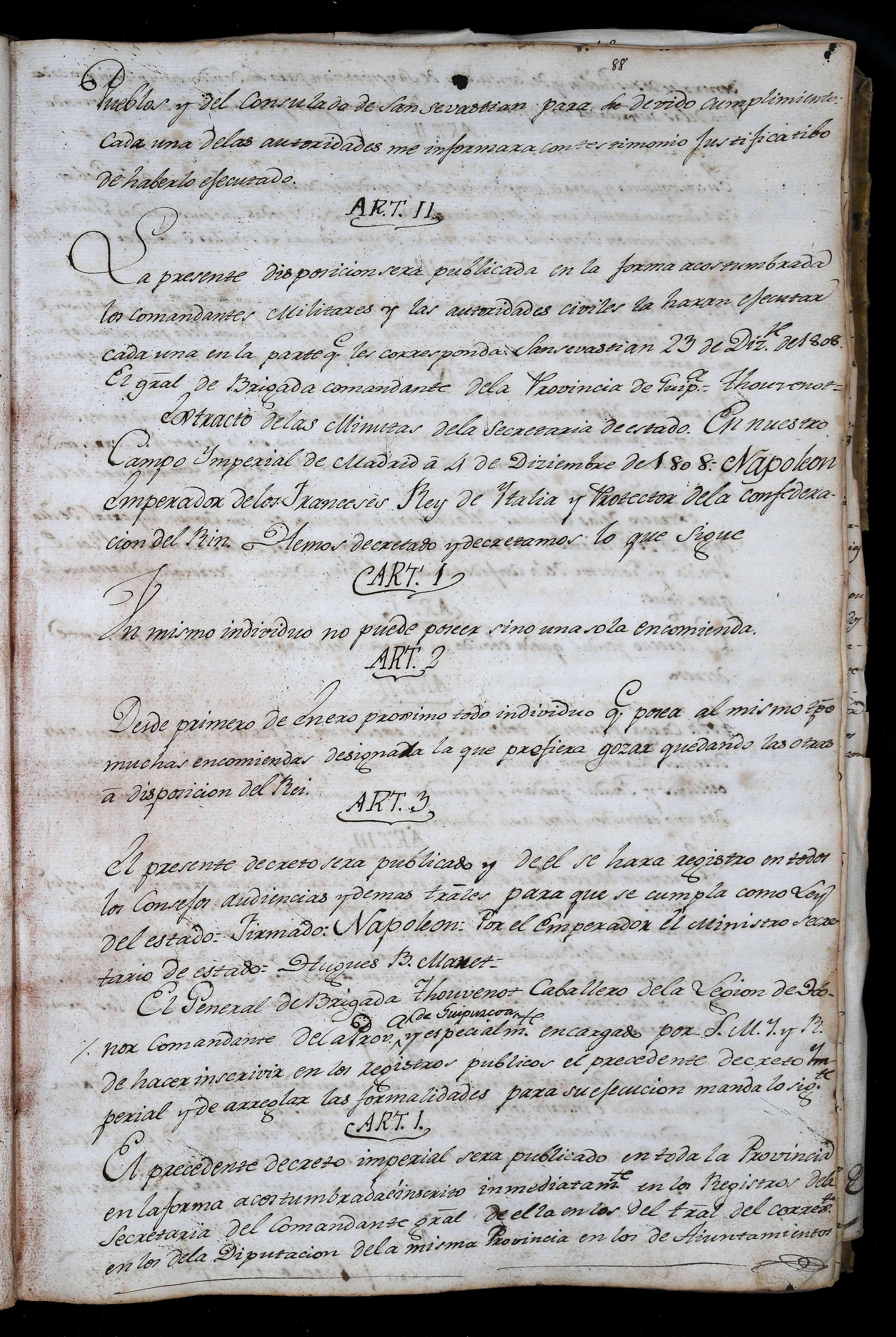 Napoleonek Frantziaren aurkako gerraren ondoren emandako zortzi dekretu inperial eta errealen irakurketa. Dekretuen testuak jasotzen dira.