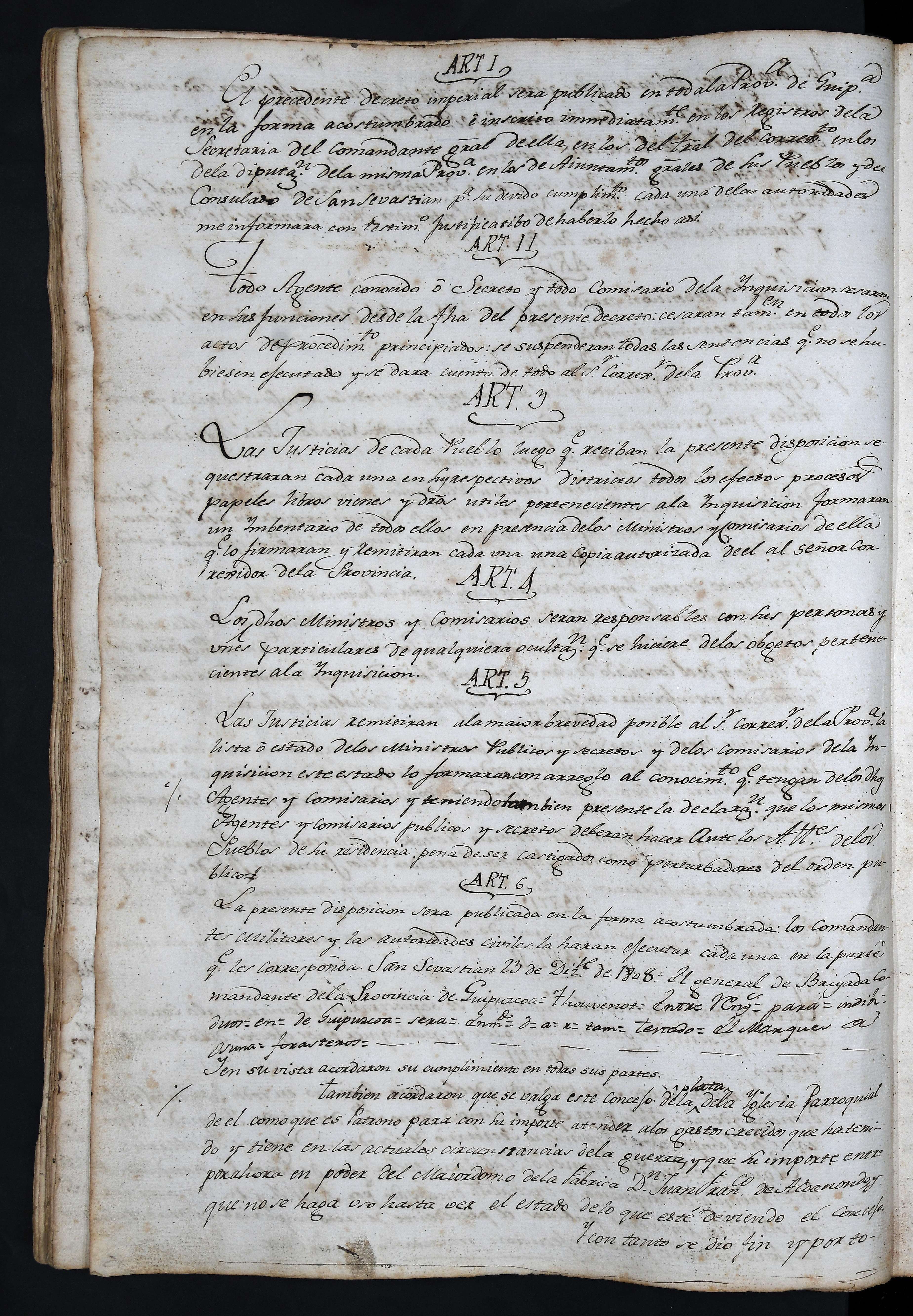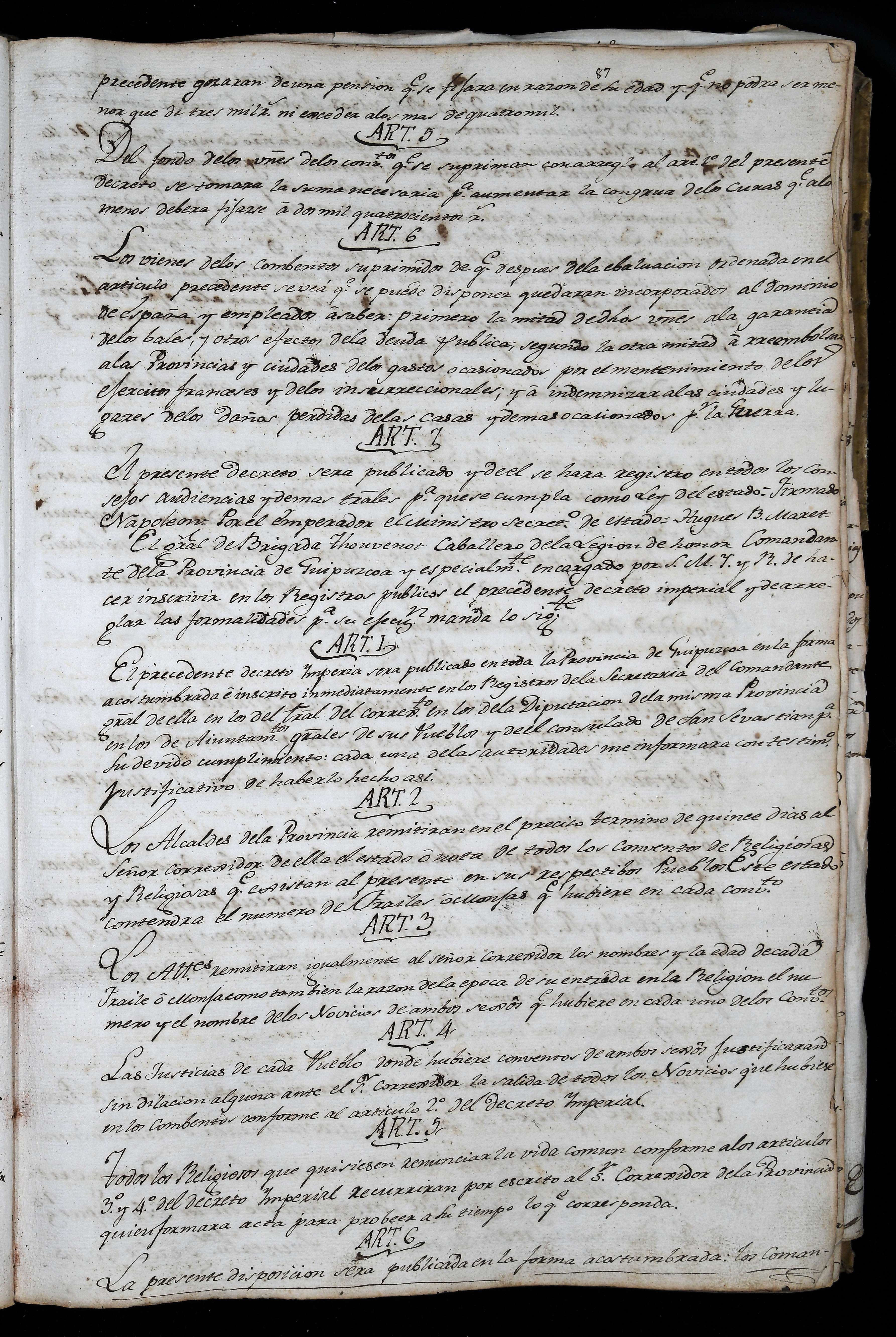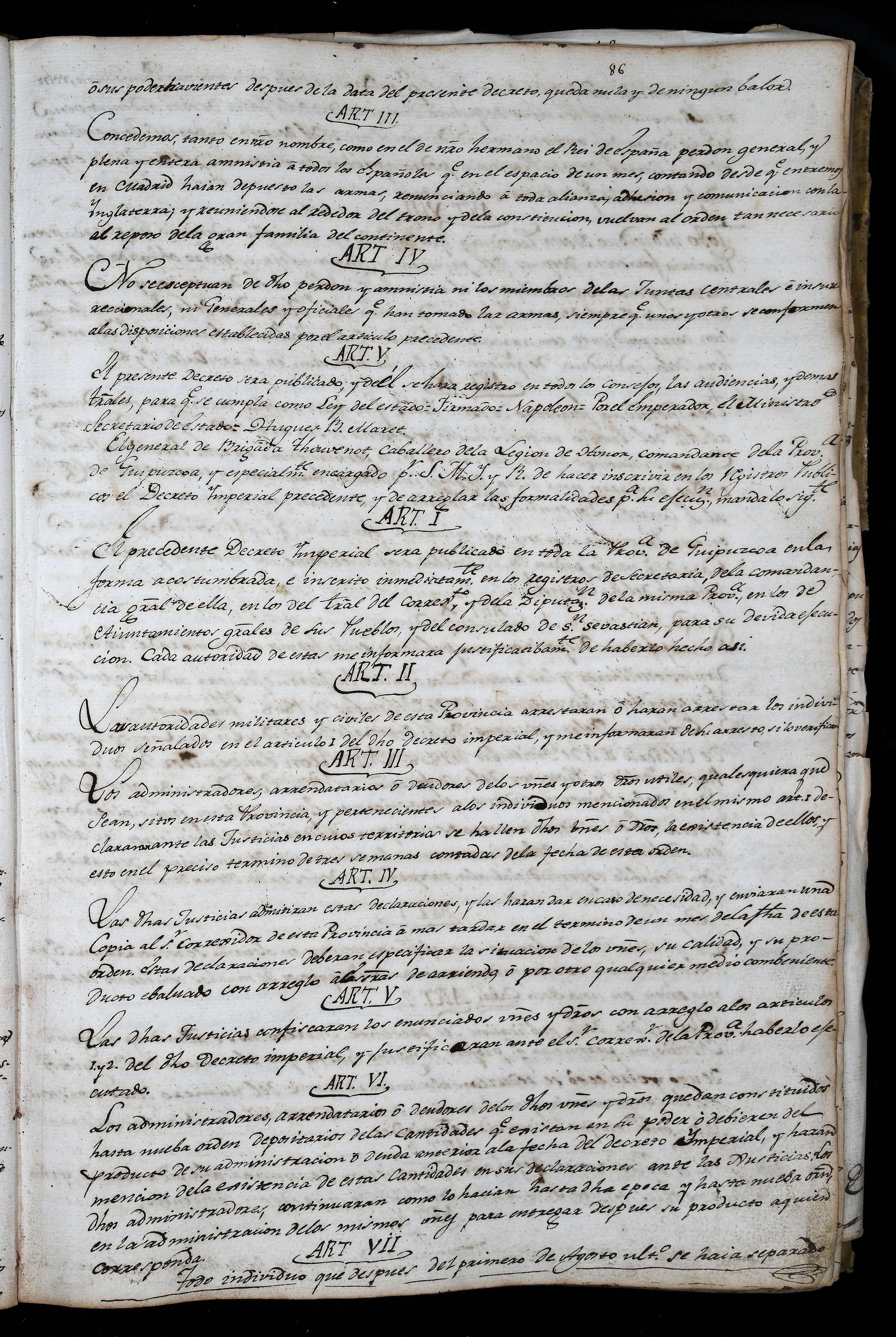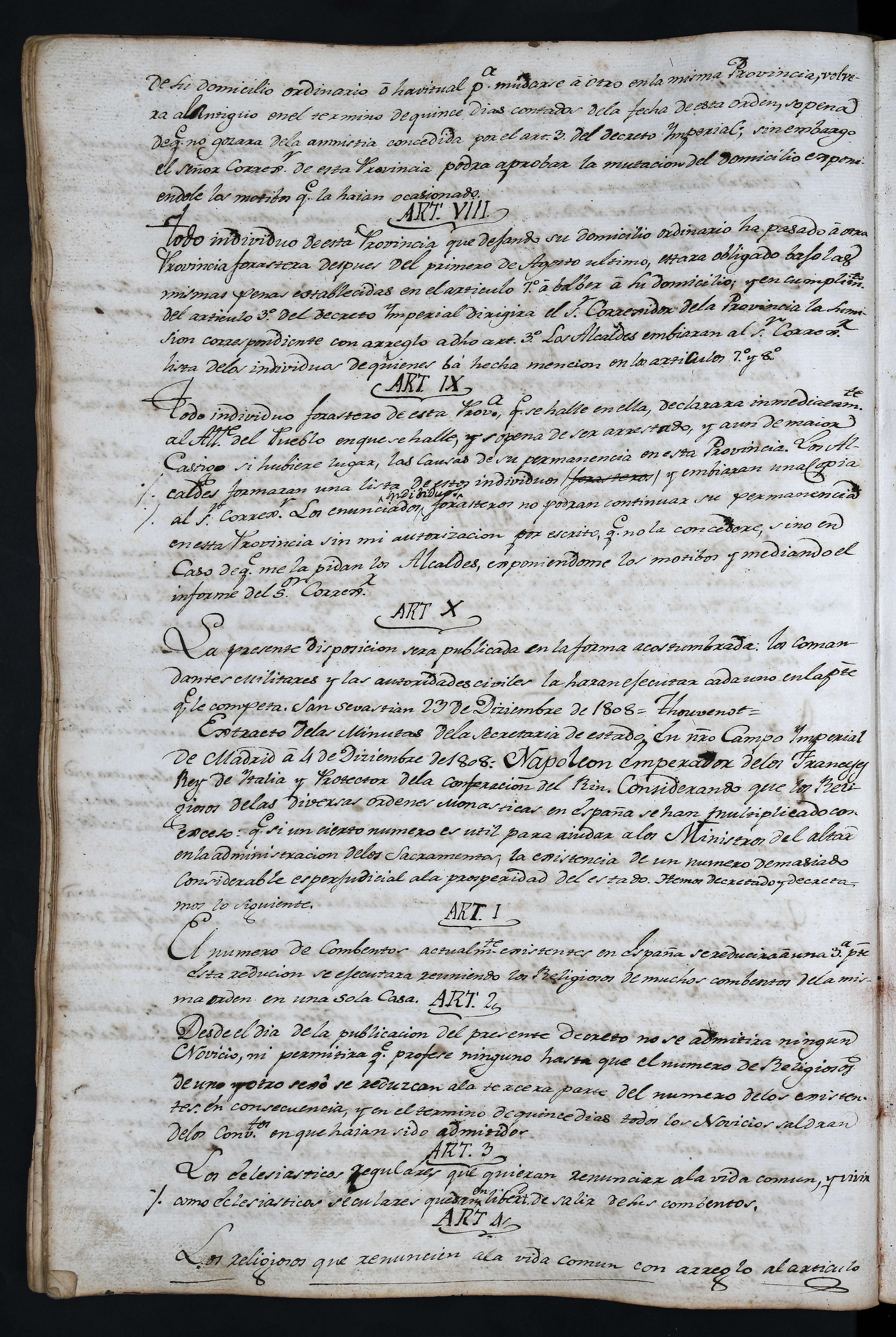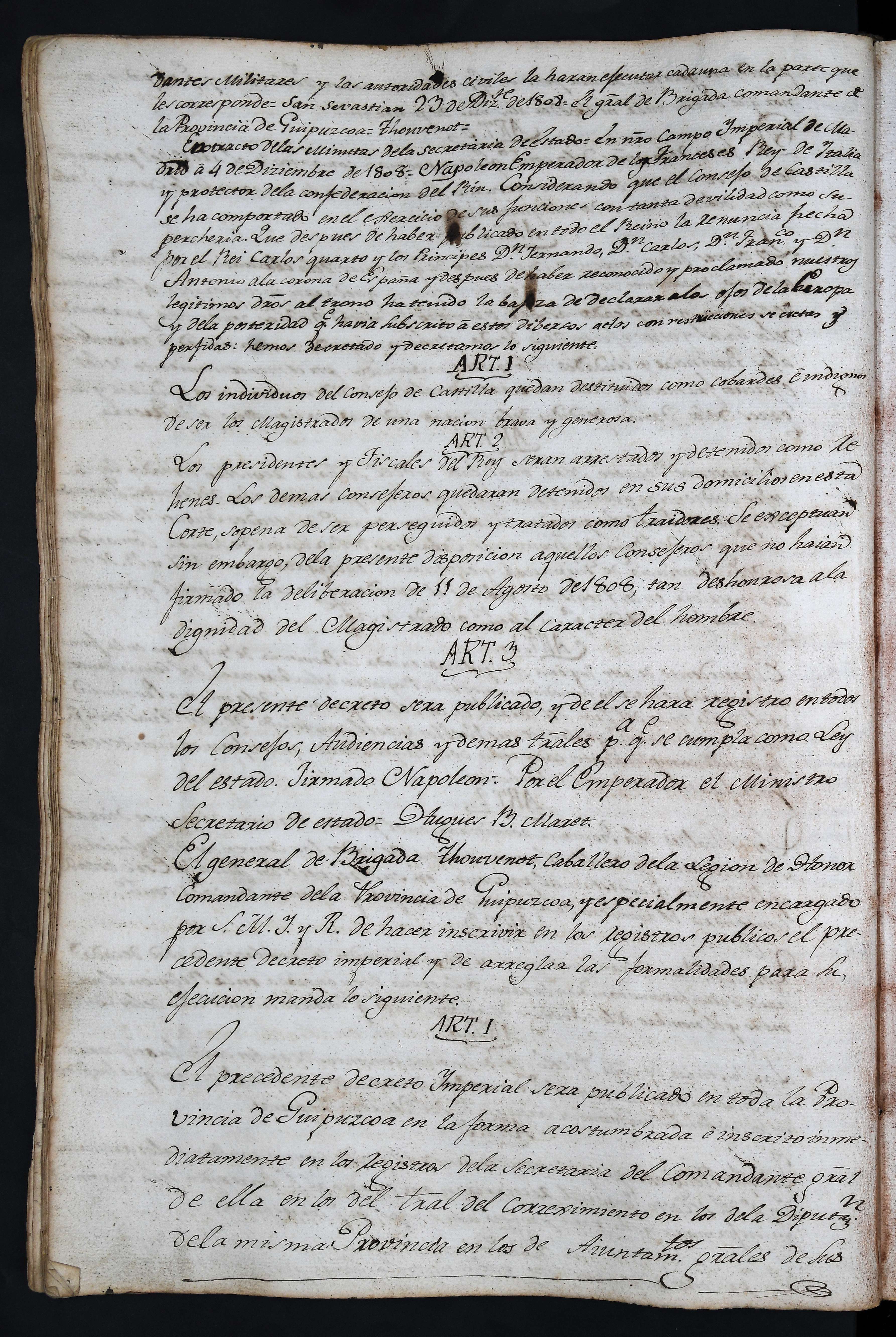 Napoleonek Frantziaren aurkako gerraren ondoren emandako zortzi dekretu inperial eta errealen irakurketa. Dekretuen testuak jasotzen dira.